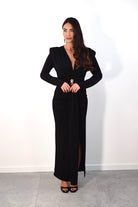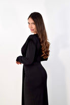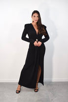 Abito lungo a maniche lunghe in tessuto elasticizzato, perfetto per cerimonie, feste o eventi serali. Caratterizzato da uno scollo a V, drappeggio frontale che valorizza la figura e spacco laterale per un tocco di femminilità. Le spalline imbottite donano struttura alla silhouette, mentre il dettaglio gioiello sul davanti aggiunge eleganza e luminosità, taglia unica.
