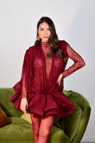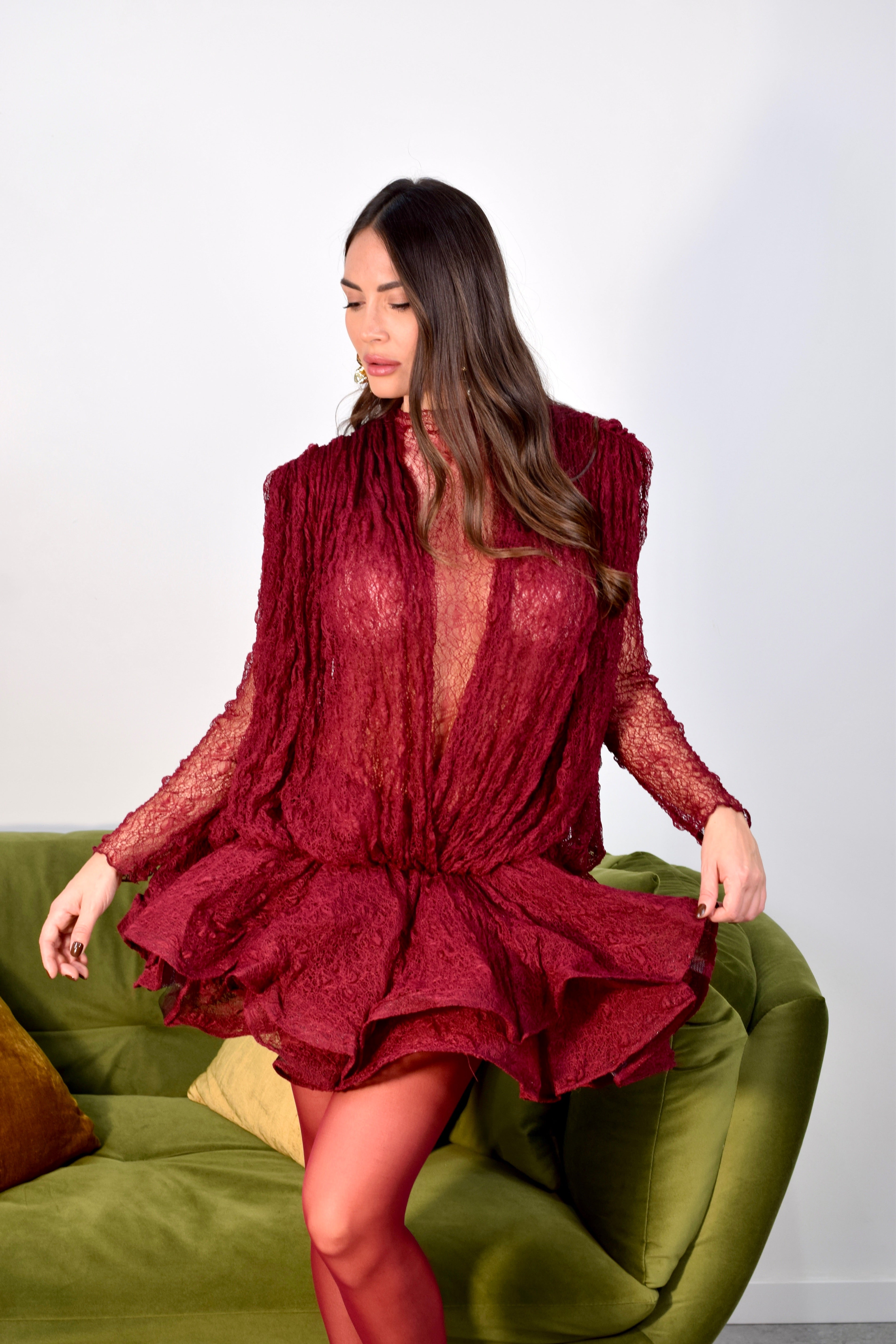 Mini abito interamente in pizzo composto da due pezzi integrati: una maglietta a manica lunga con mezzo collo elasticizzato e un vestito sopra dello stesso tessuto con giro manica, scollo profondo e gonna a volant ampi e svolazzanti. Taglia unica, elegante e femminile, perfetto per occasioni speciali, serate o eventi in cui non passare inosservata.