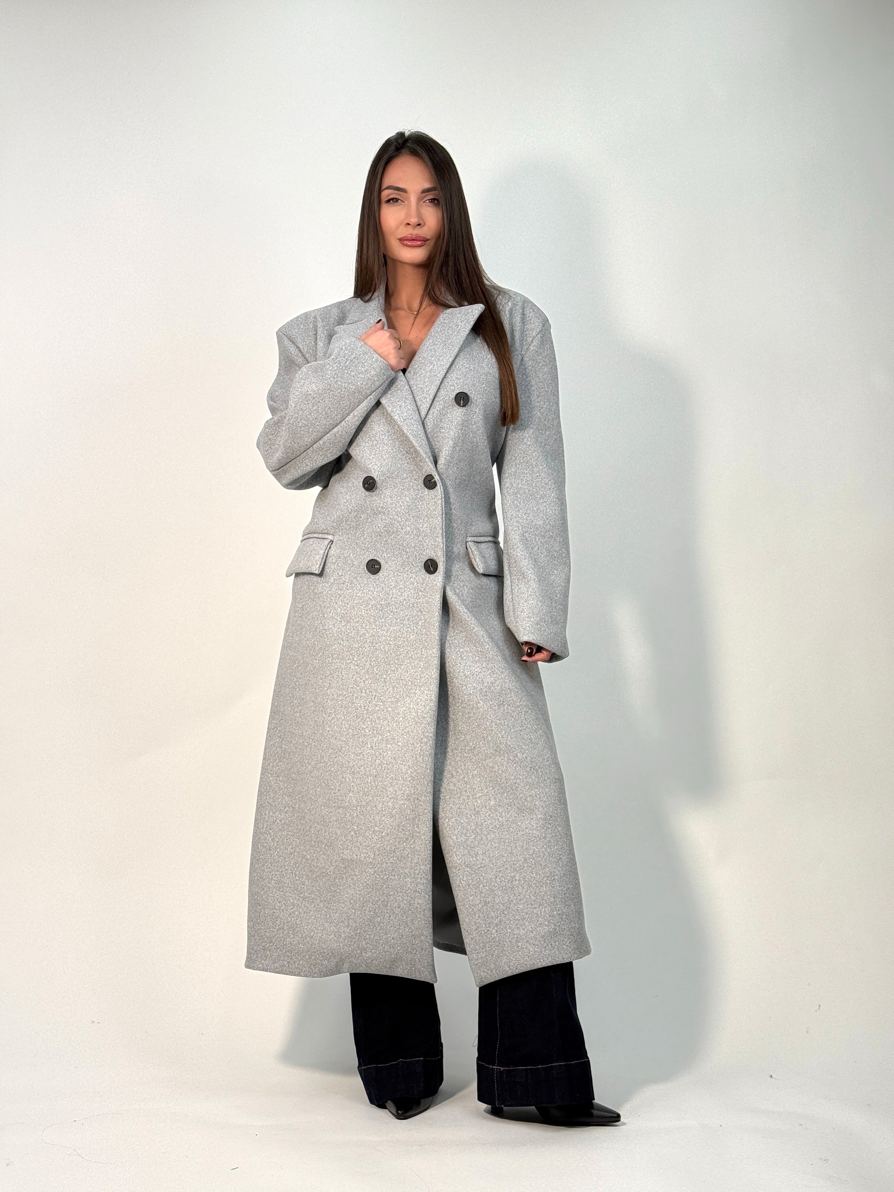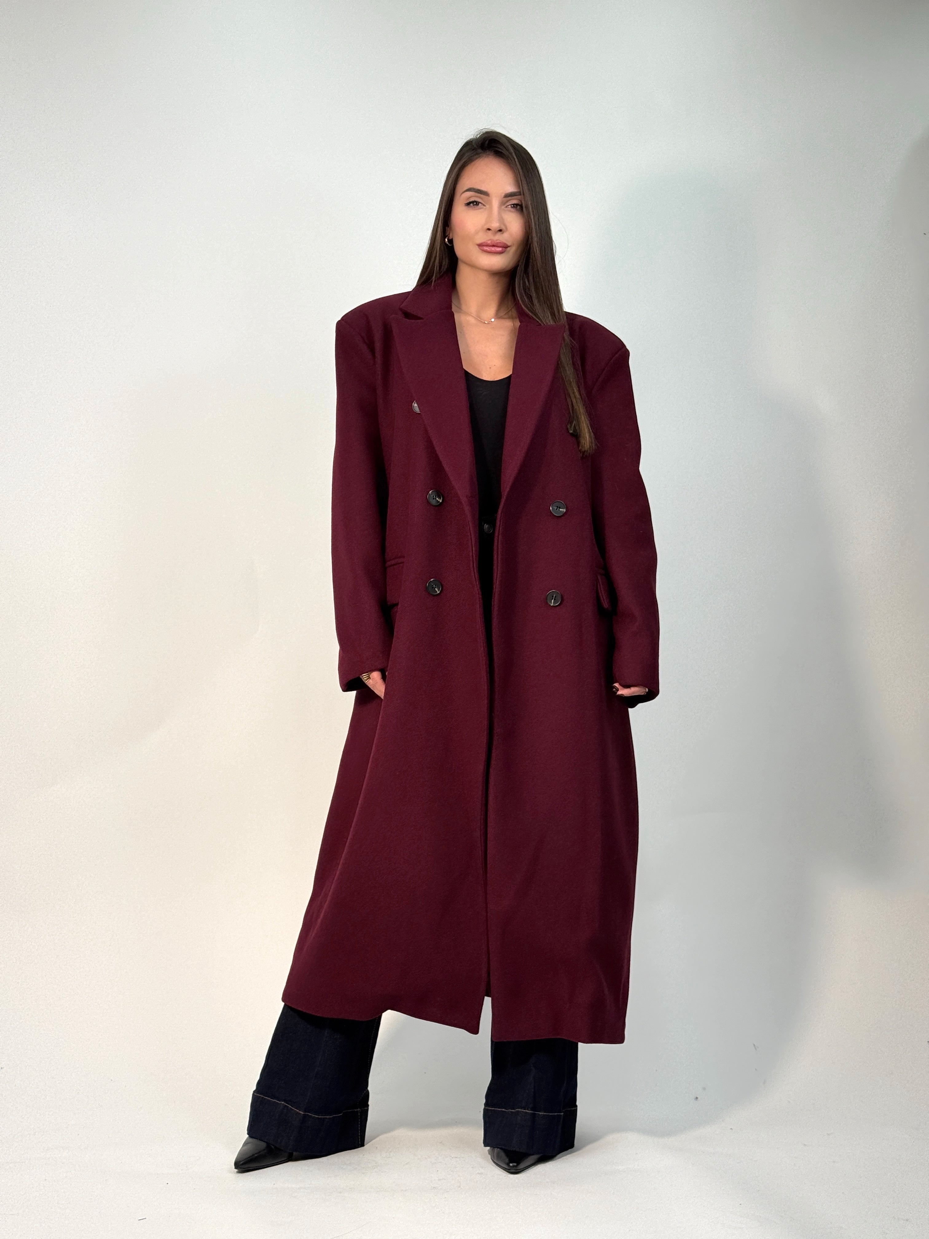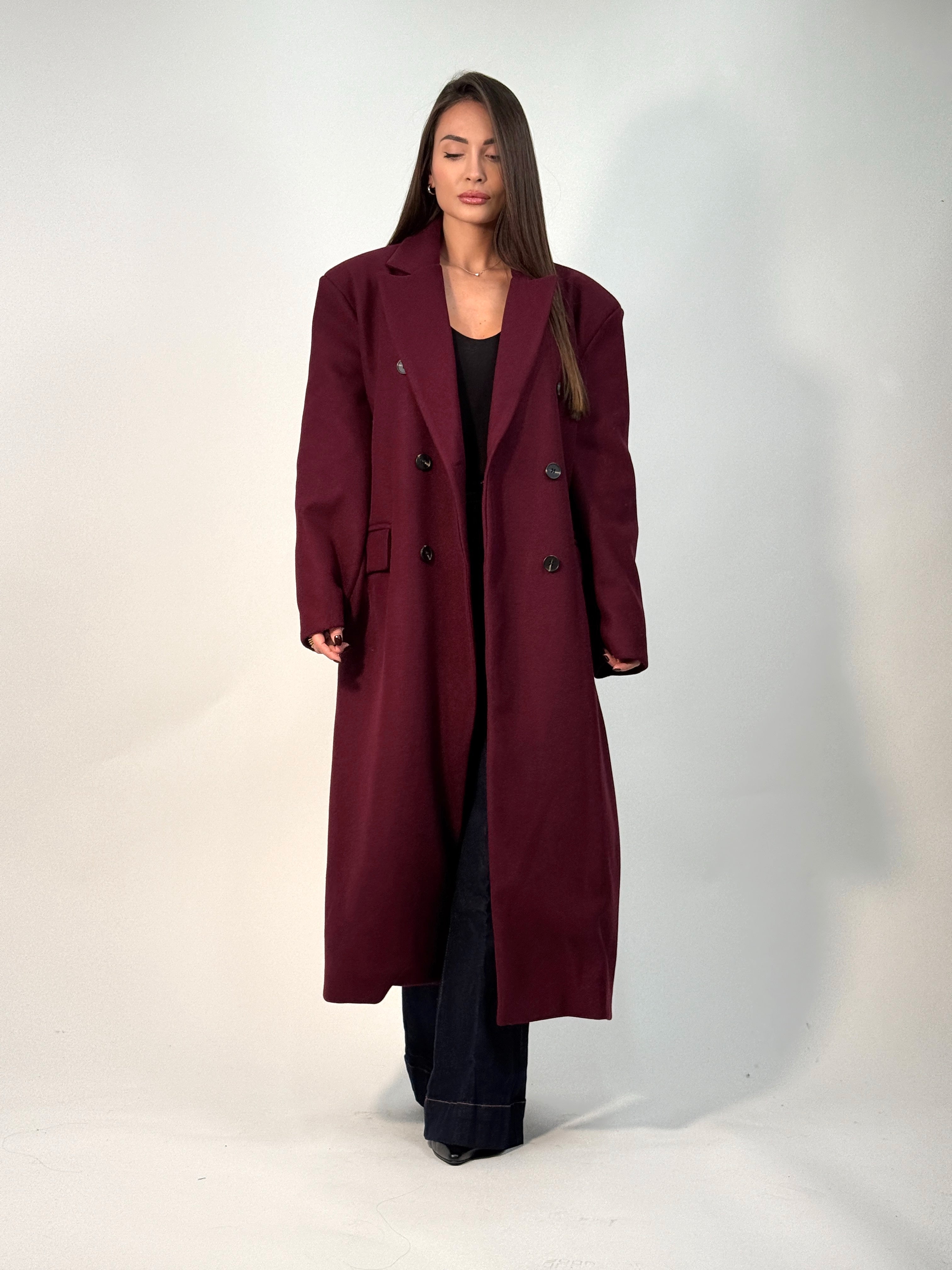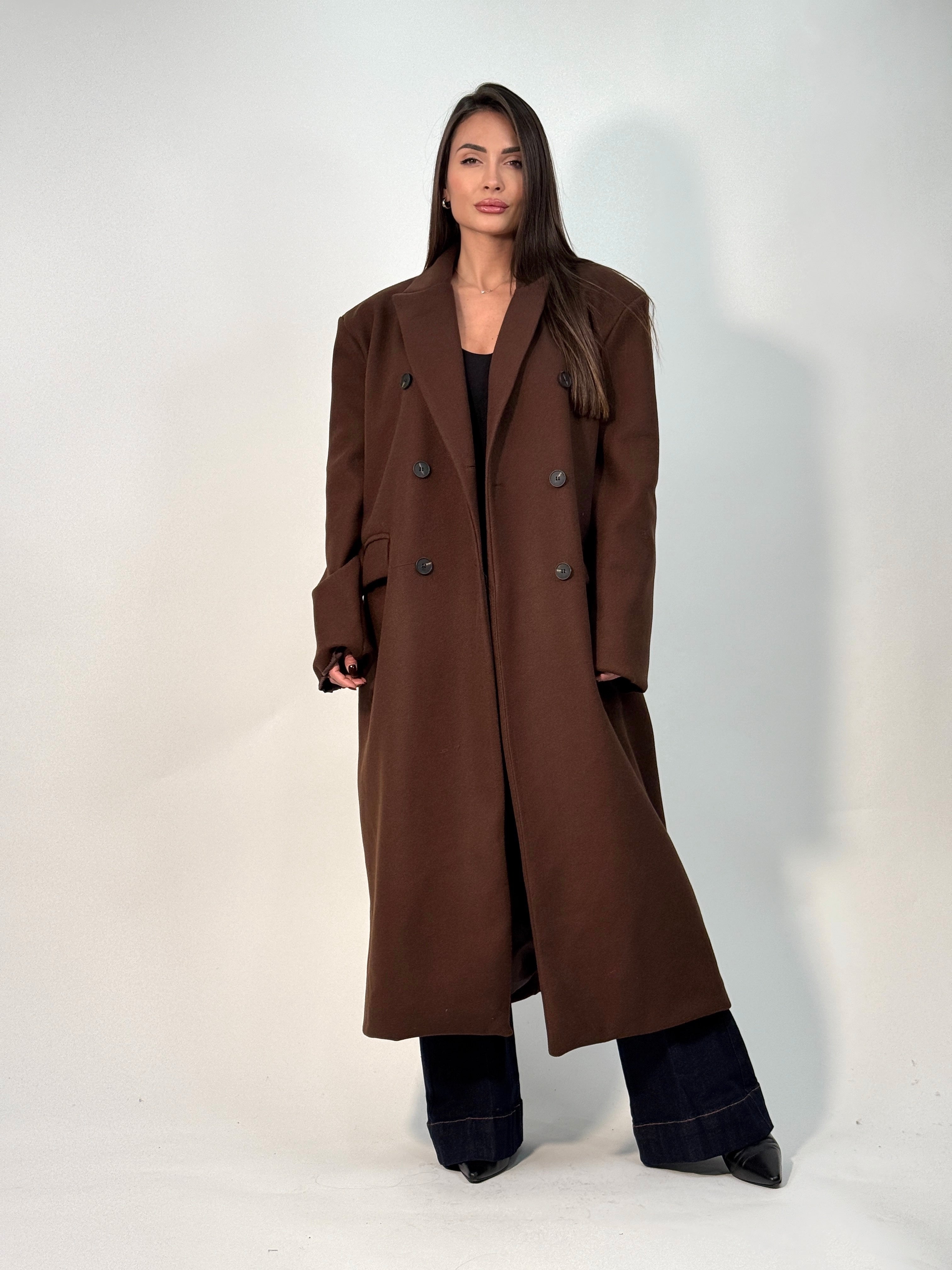 Cappotto dal taglio uomo, in misto lana ampio e imbottito a palline, con chiusura doppiopetto in misto lana. Sul retro presenta una regolazione che permette di definire meglio il punto vita.