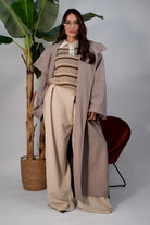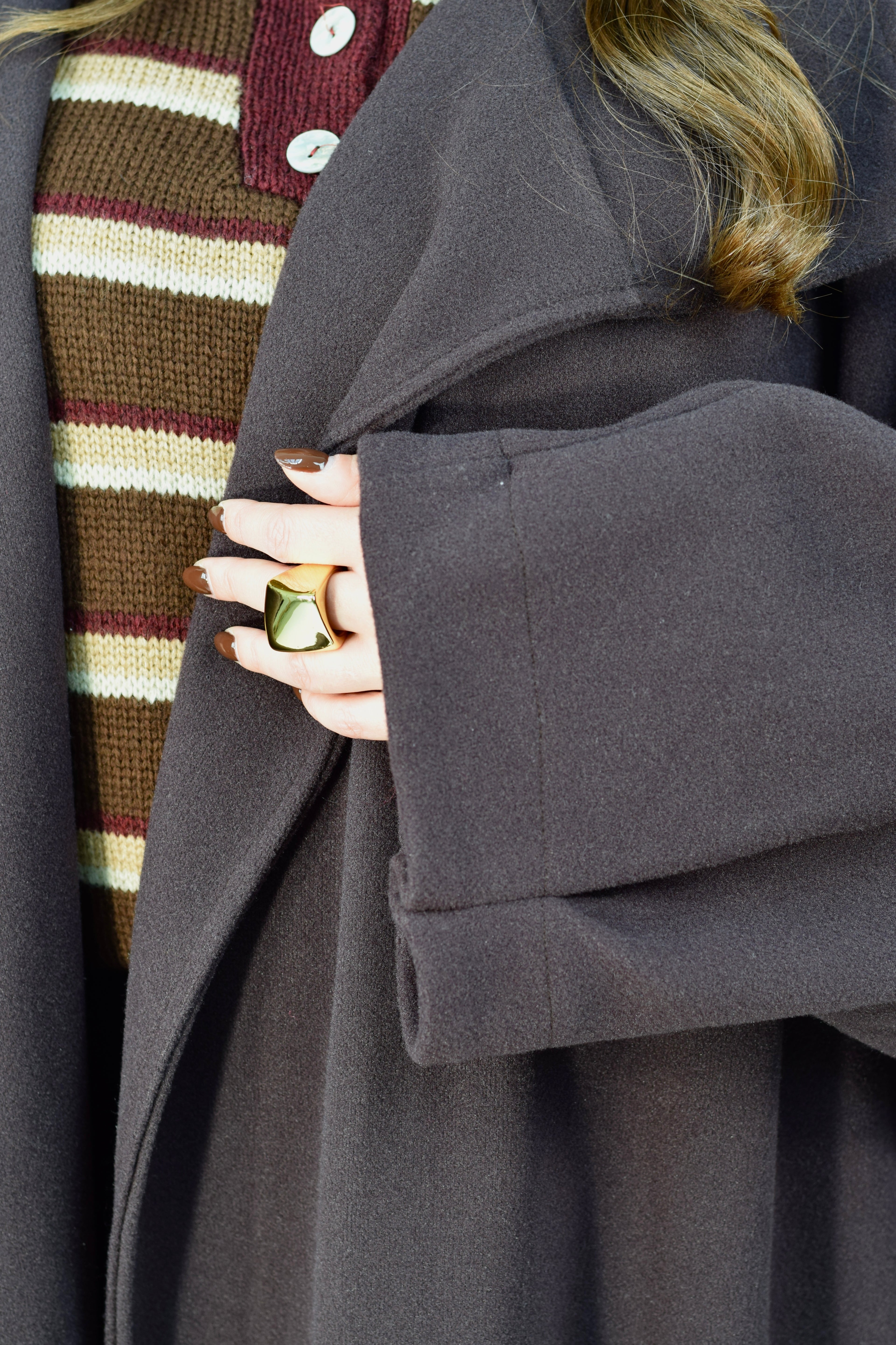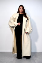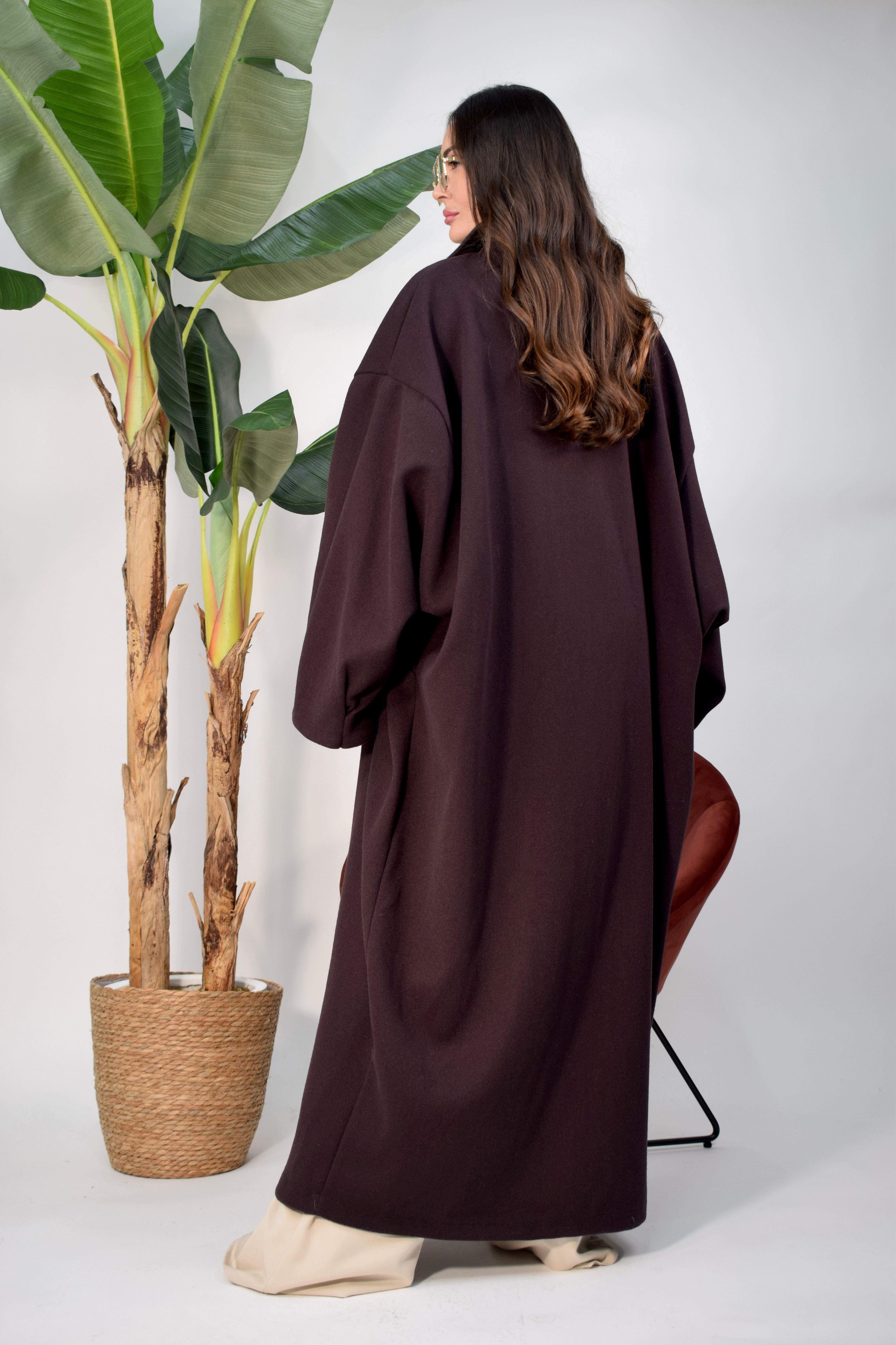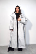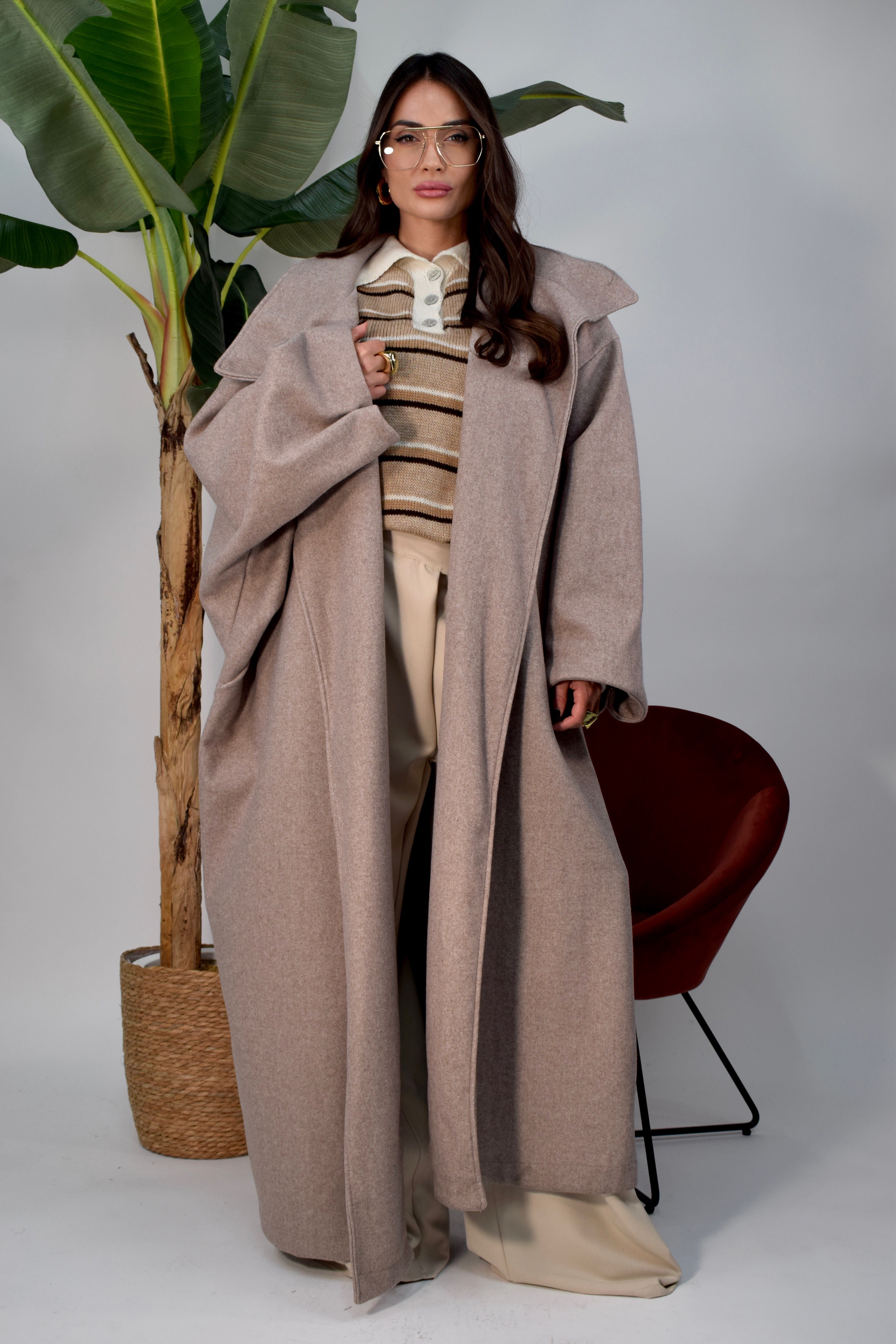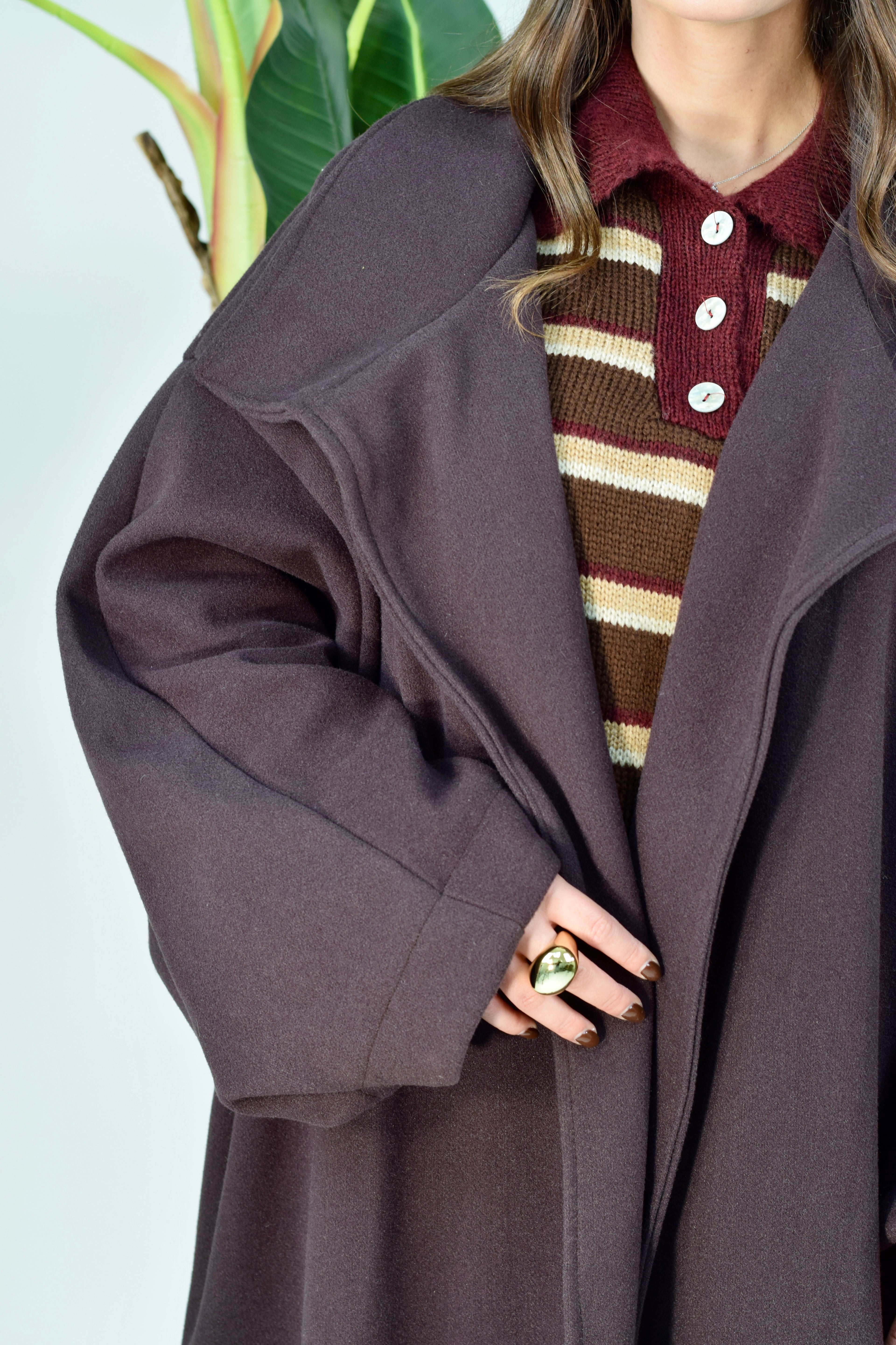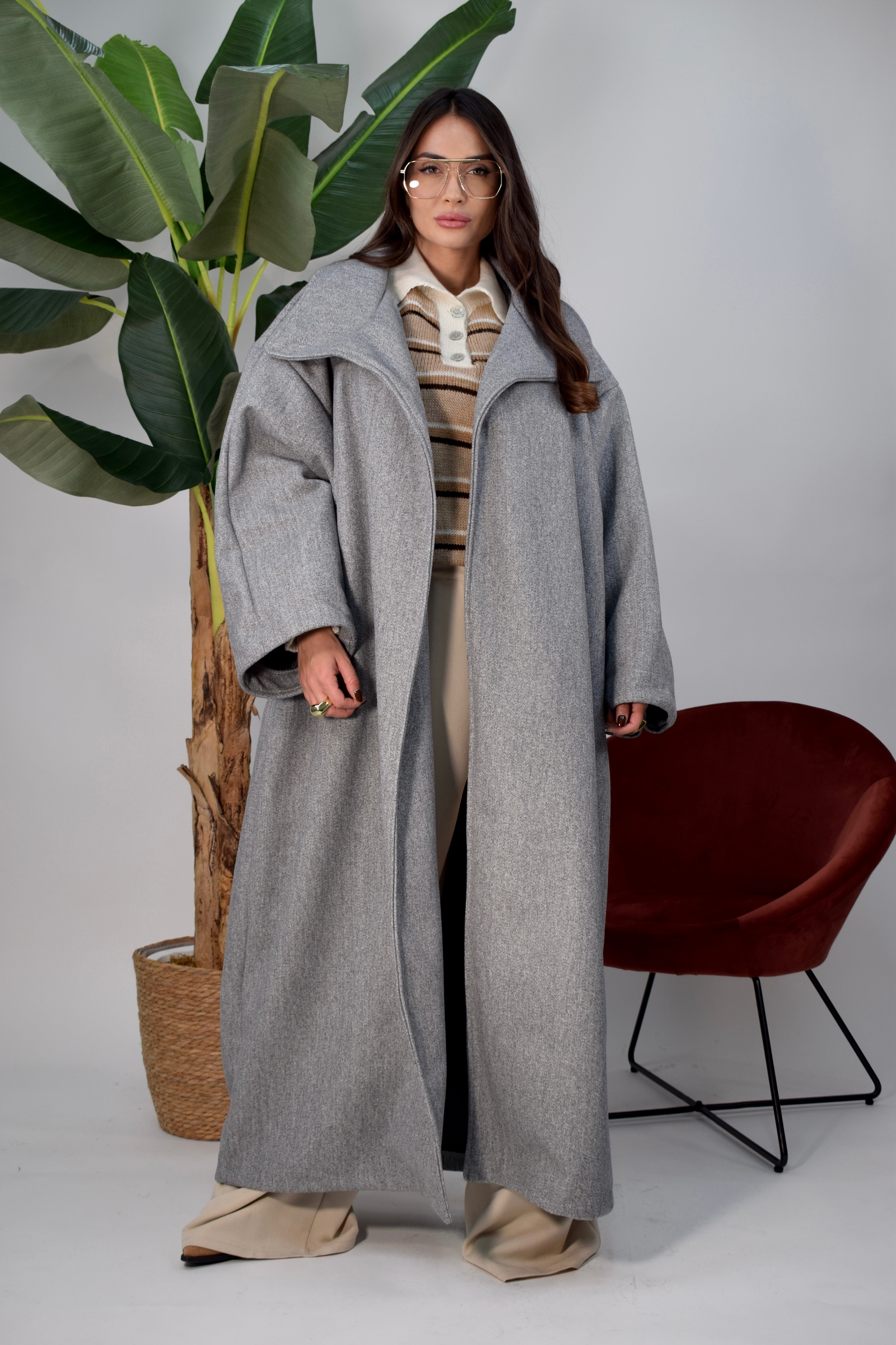 Cappotto oversize lungo dal taglio ampio e morbido, con maniche ampie leggermente pinzate sul polso e collo a revers. Senza chiusura, avvolge la figura con eleganza e comfort. Perfetto per look casual o sofisticati. Taglia unica.