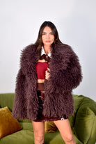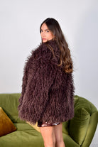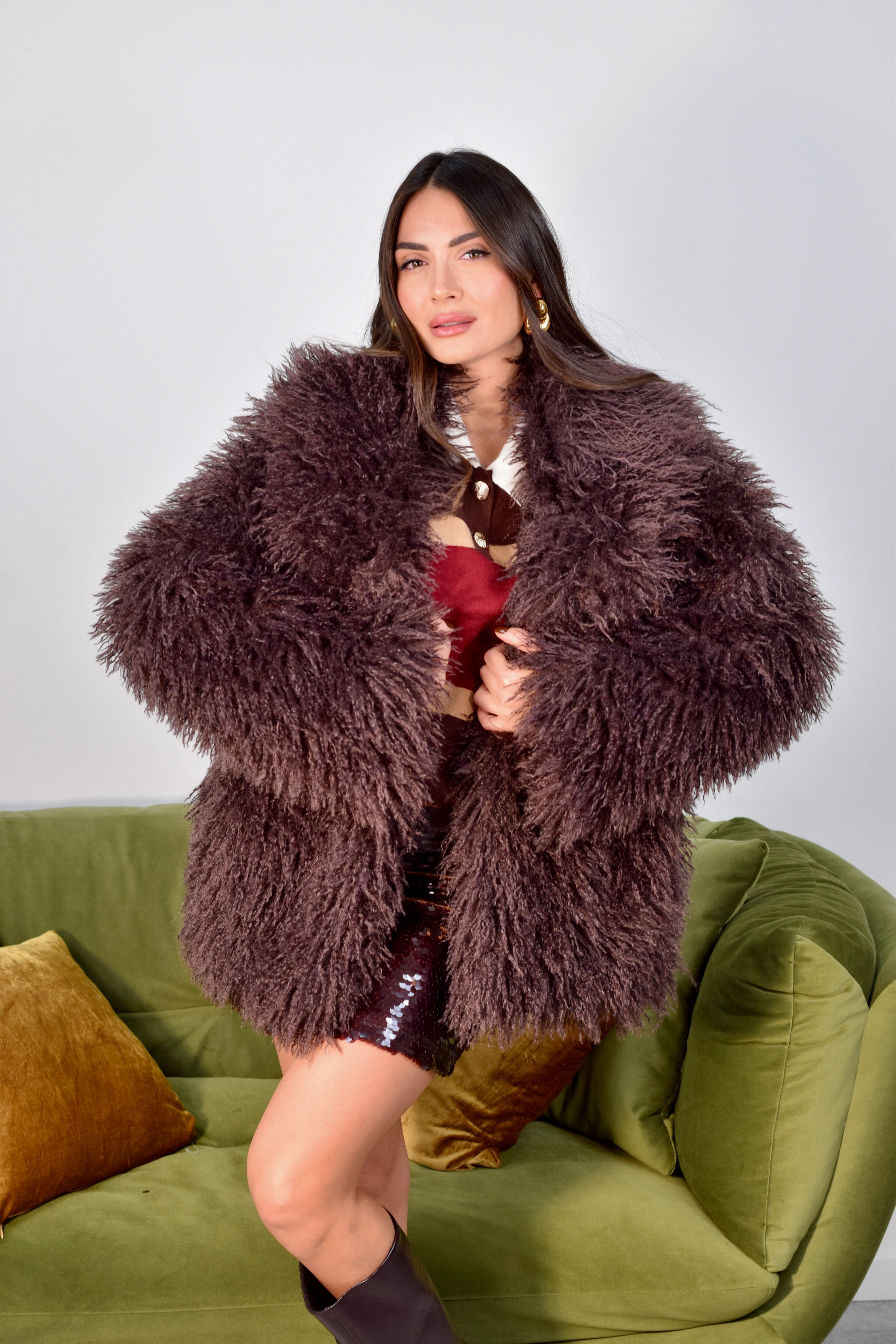 Eco-Pelliccia effetto Mongolia foderata con collo revers, silhouette ampia e spalle decise per un look strutturato e di carattere. Morbida e calda, perfetta da indossare in città o per occasioni speciali, dona un tocco di stile sofisticato e contemporaneo.
