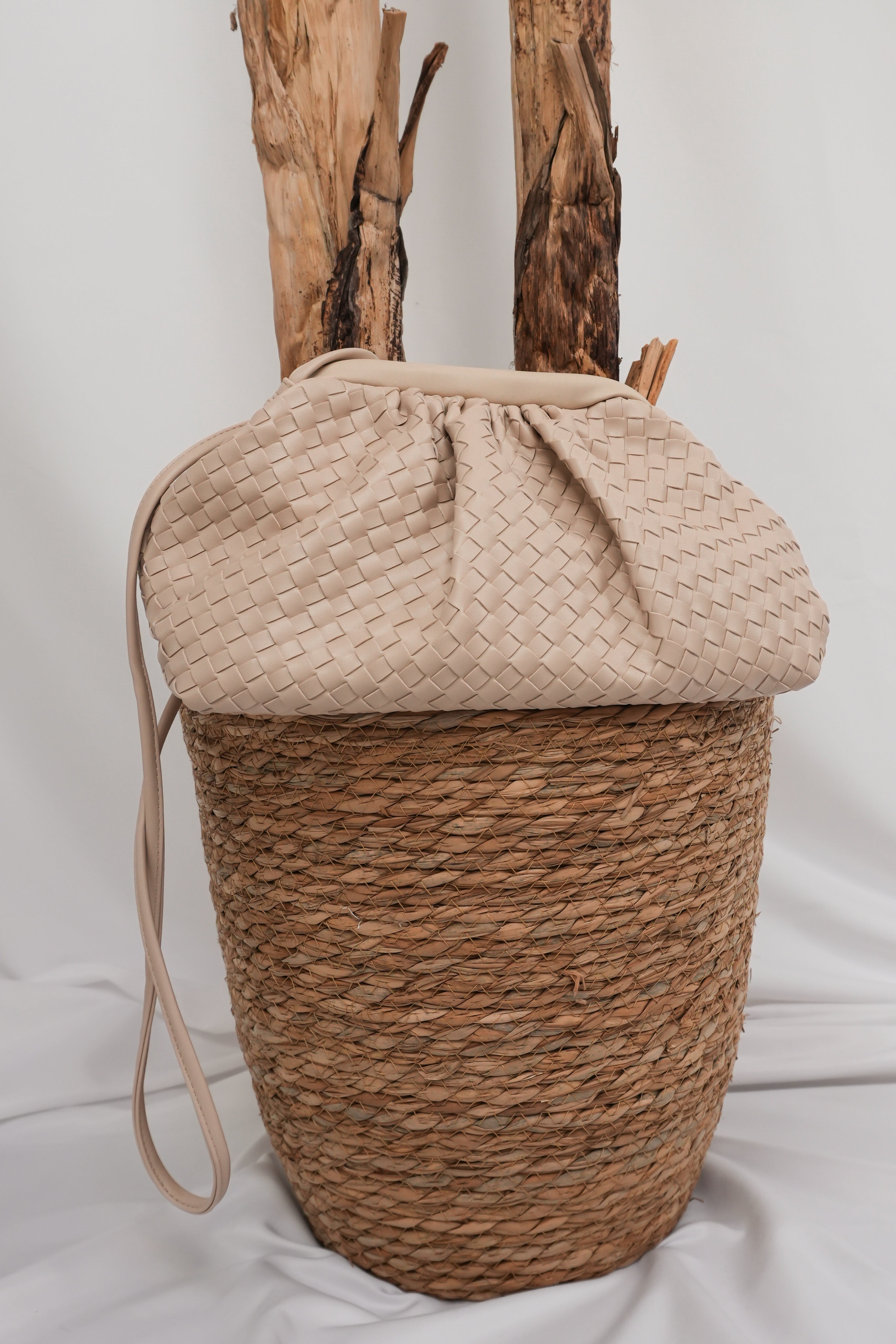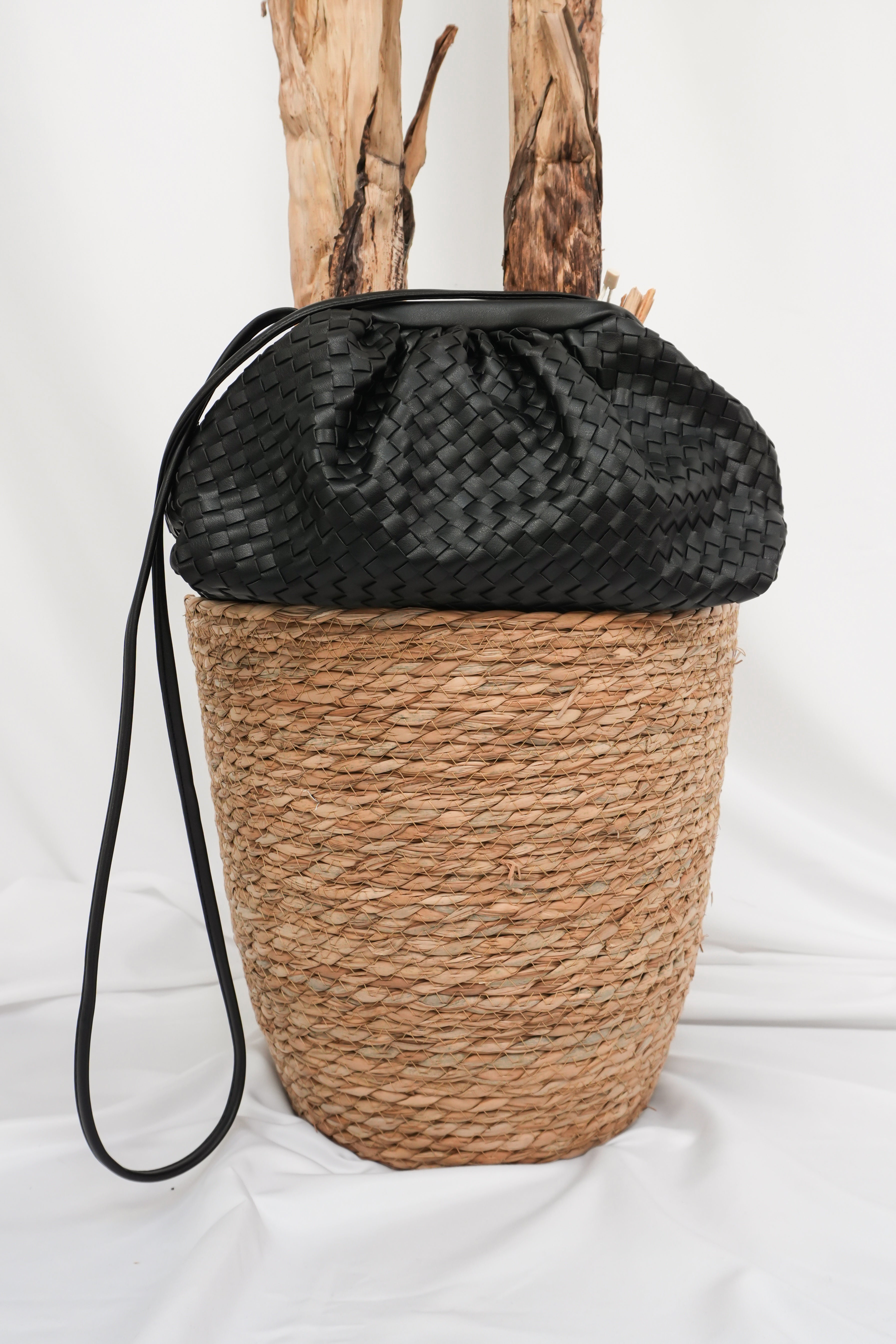 Borsa a tracolla in pelle intrecciata nera, dallo stile elegante e minimale. Presenta una chiusura morbida a sacchetto e una lunga tracolla sottile.