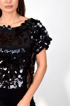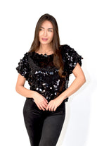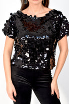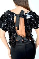 Blusa a mezza manica con macro paillettes e fiocchetti annodabili sul retro. Taglia unica con vestibilità comoda e luminosa, perfetta per look eleganti e serate speciali.