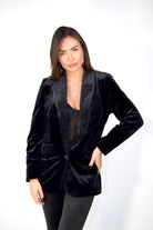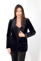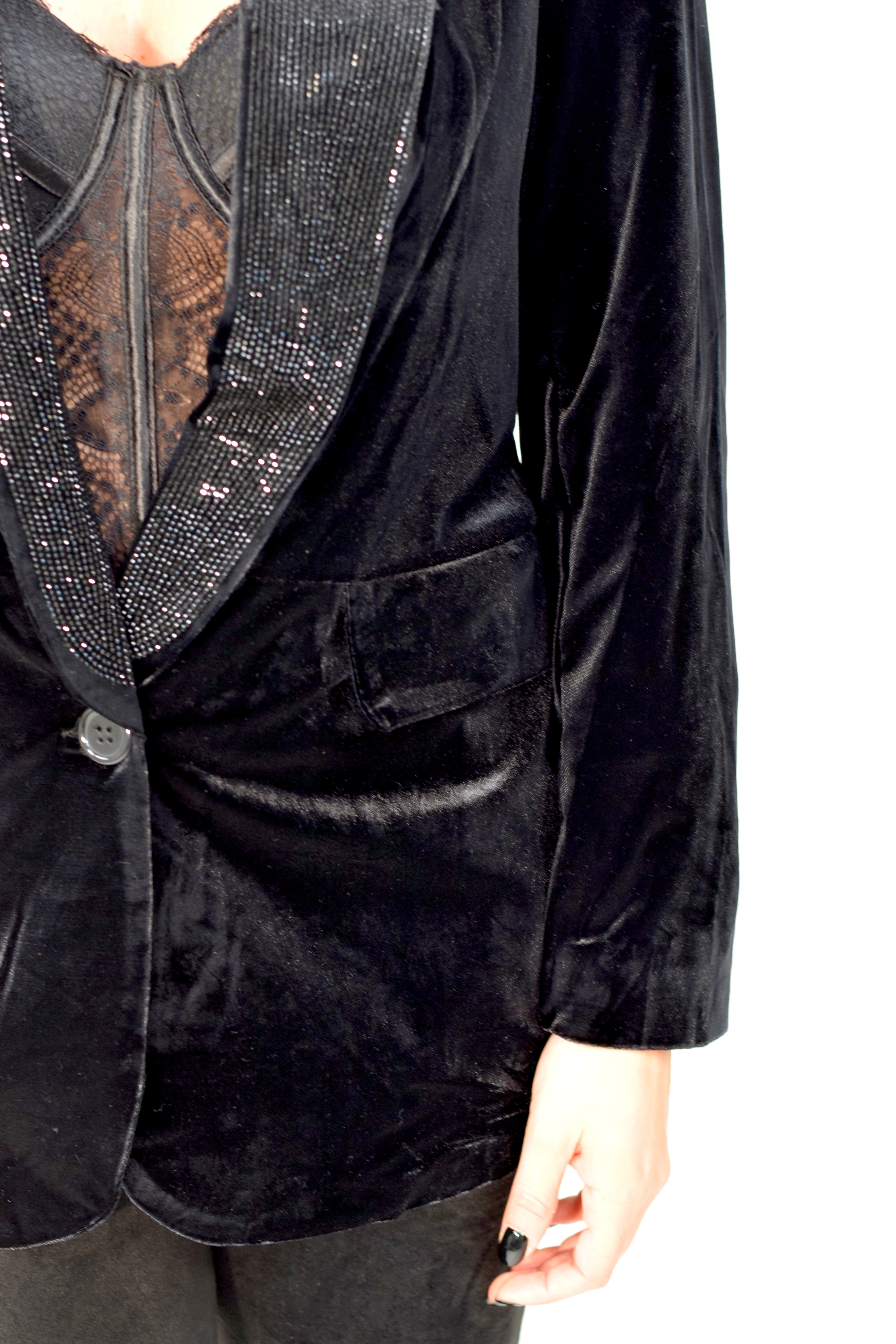 Giacca in velluto con bottone frontale centrale e dettaglio di microstrass tono su tono sul collo. Taglia unica con vestibilità morbida ed elegante, ideale per completare look raffinati.