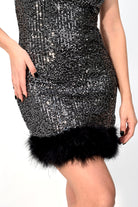 Mini abito aderente con micropaillettes e dettagli in piume sul fondo. Taglia unica con vestibilità avvolgente, perfetto per serate e occasioni speciali.