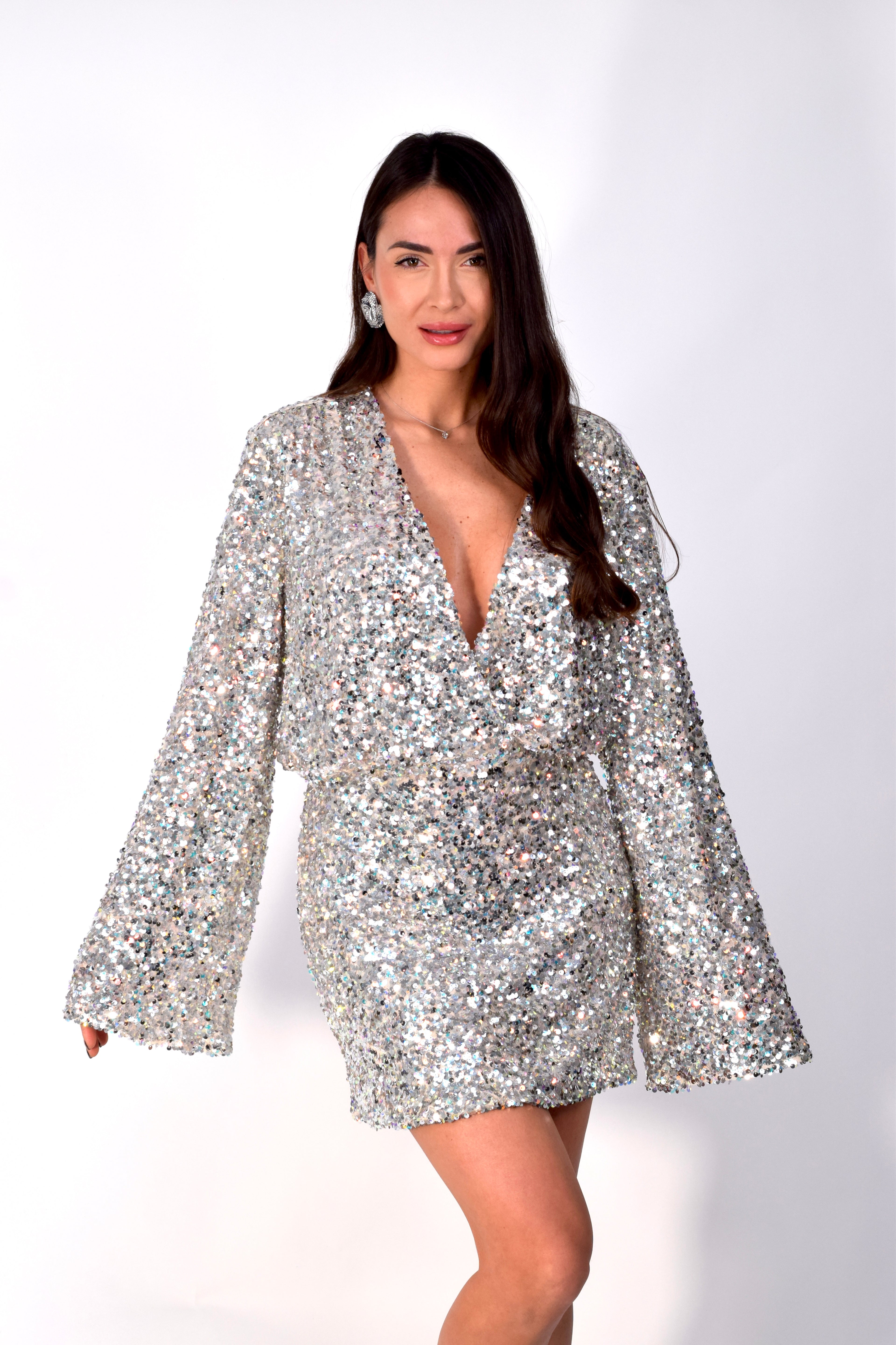 Mini abito in micro paillettes con scollo a V e maniche a campana, realizzato in tessuto elasticizzato che valorizza la silhouette. Luminoso e femminile, ideale per serate e occasioni speciali.