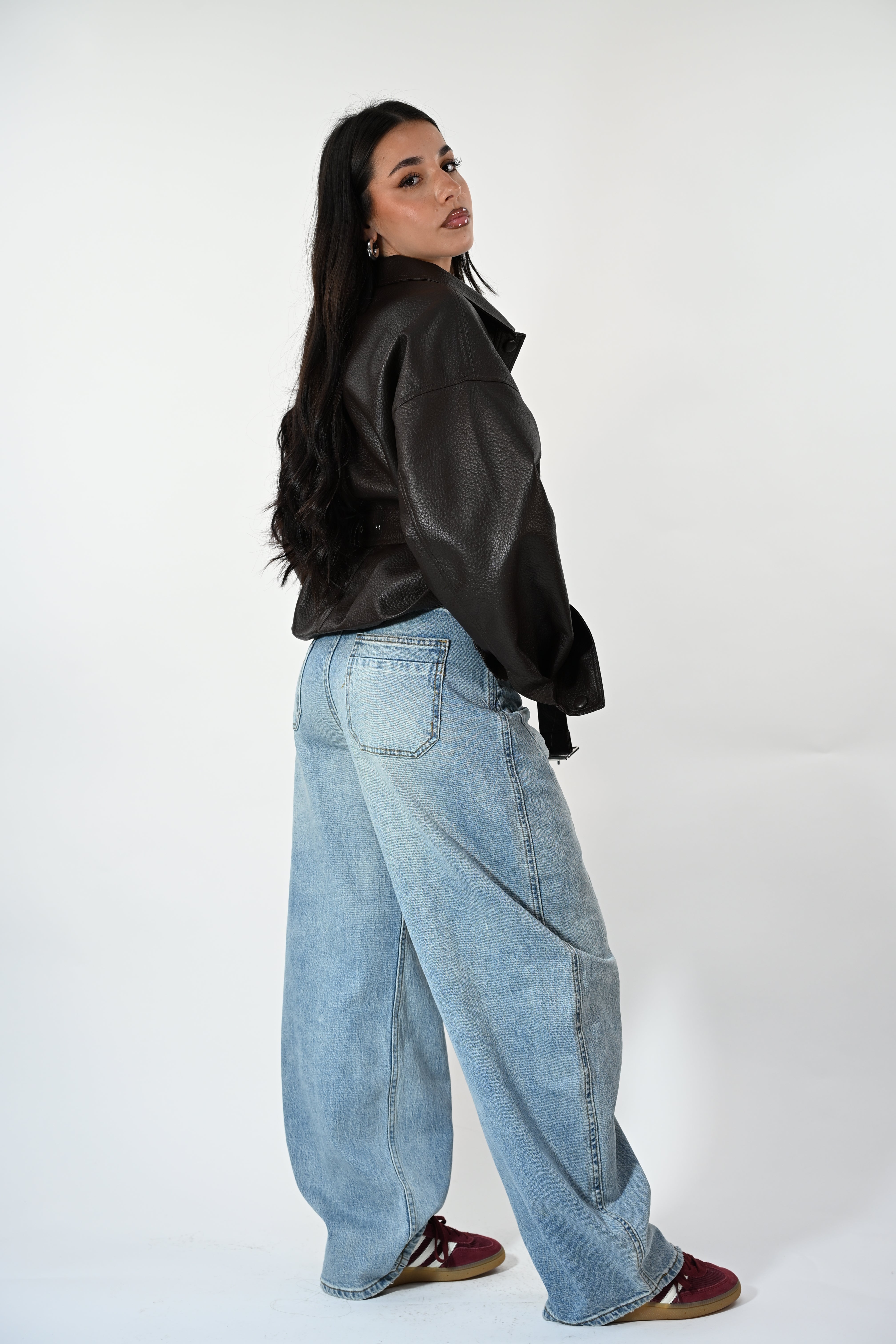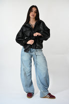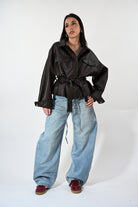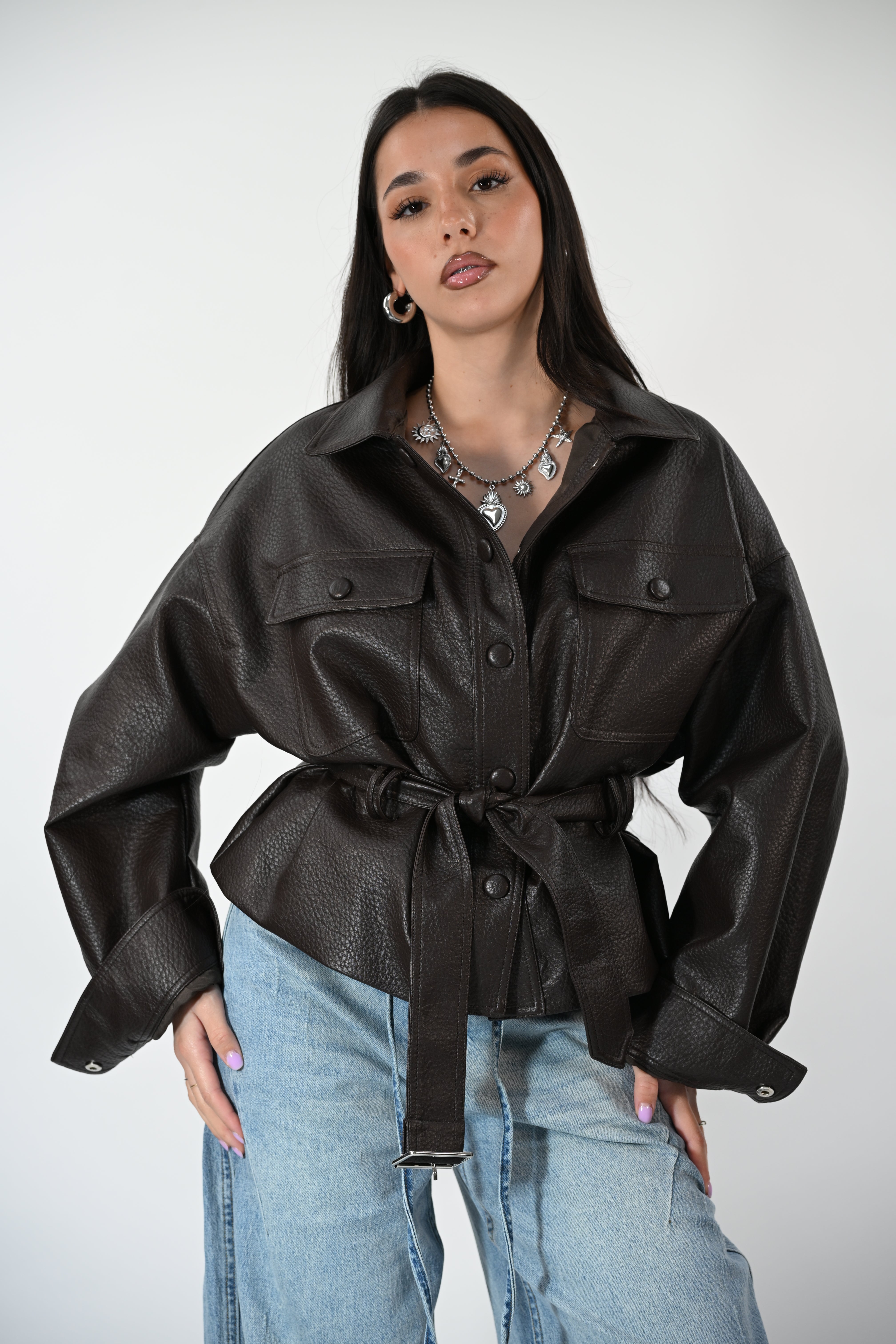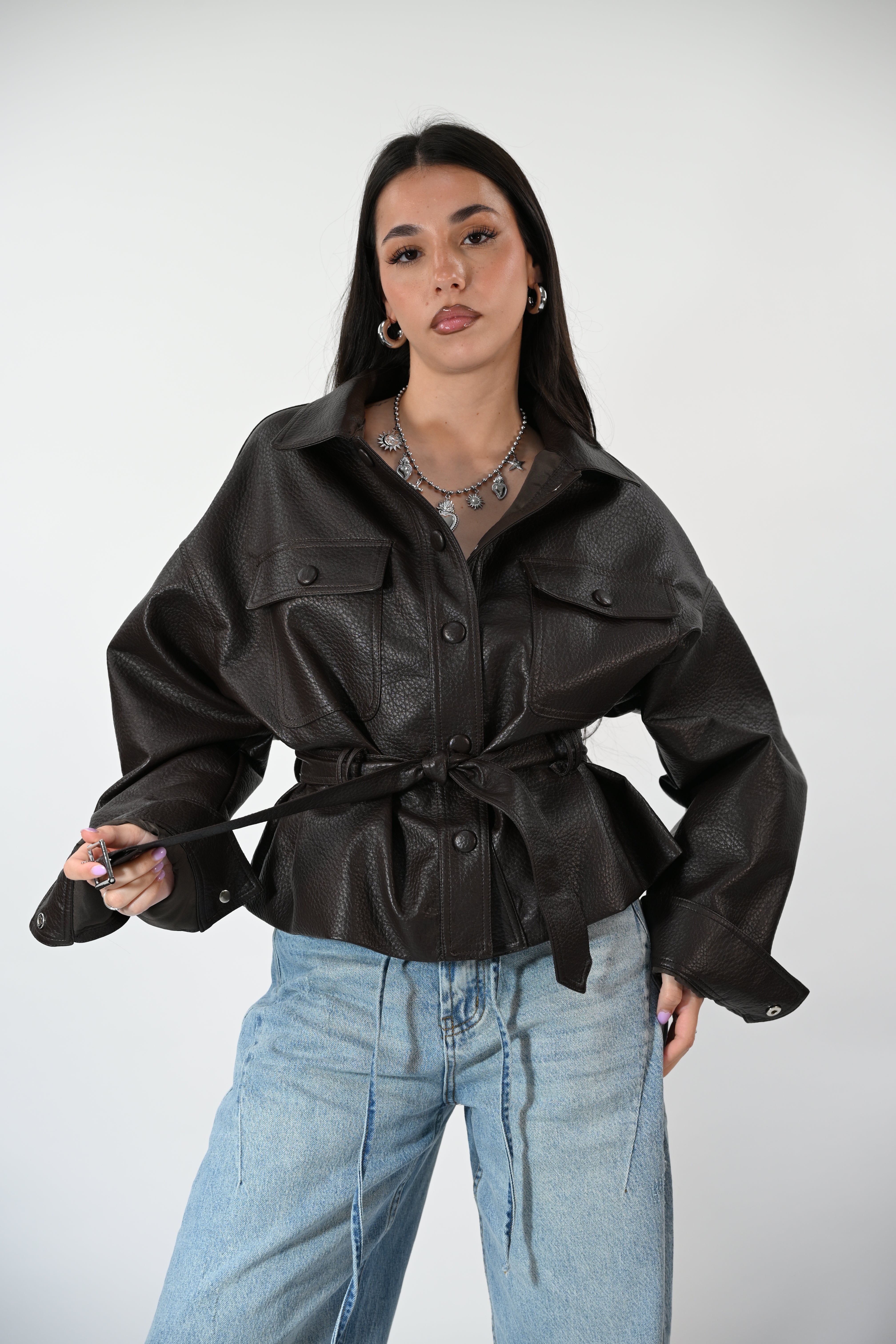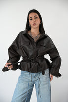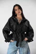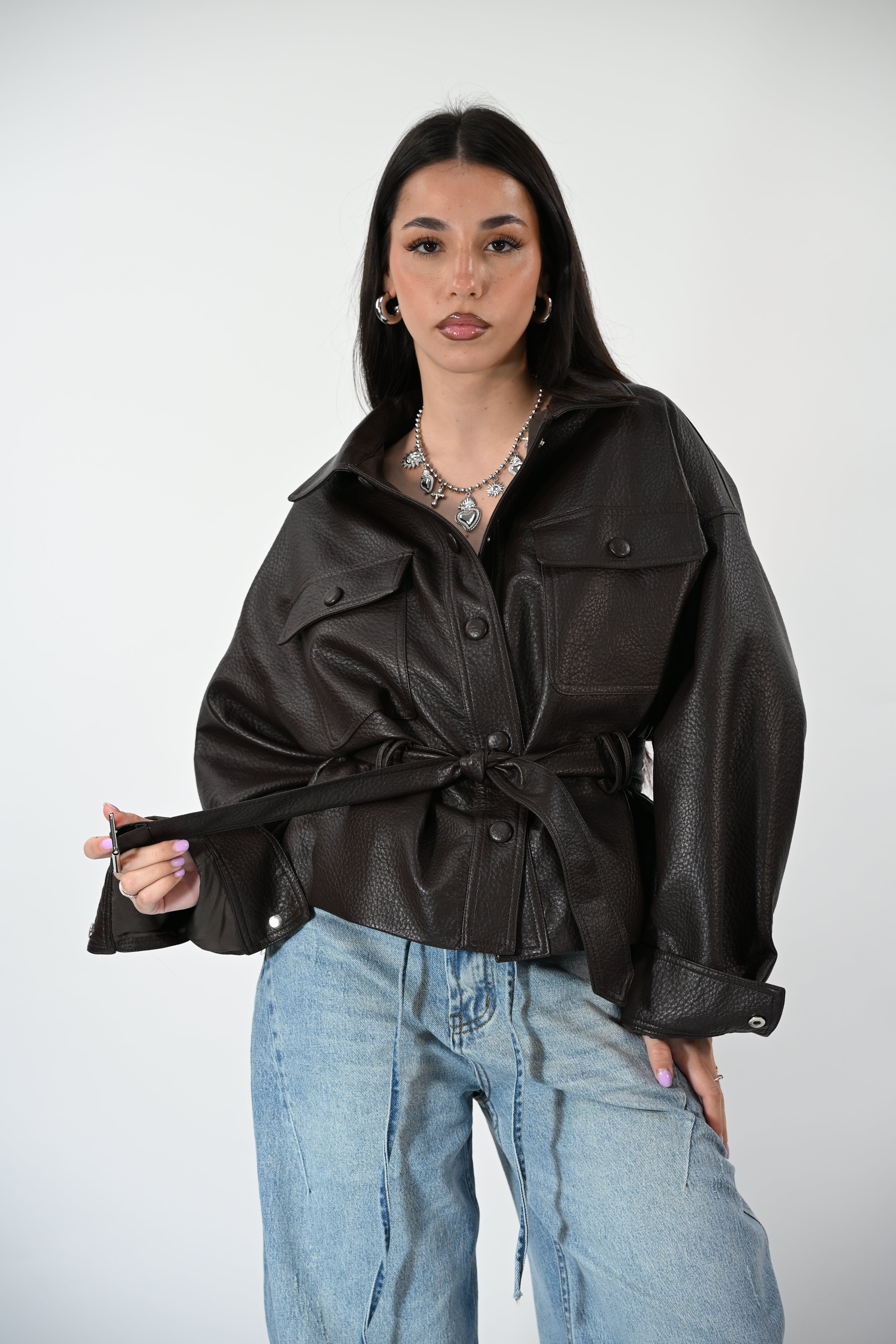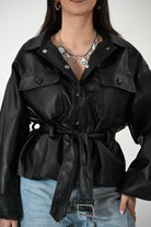 Chiodo in ecopelle con cintura in vita, tasche e clip frontali per un look grintoso e contemporaneo. Taglia unica, perfetto per completare outfit casual o più audaci.