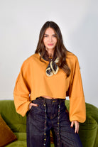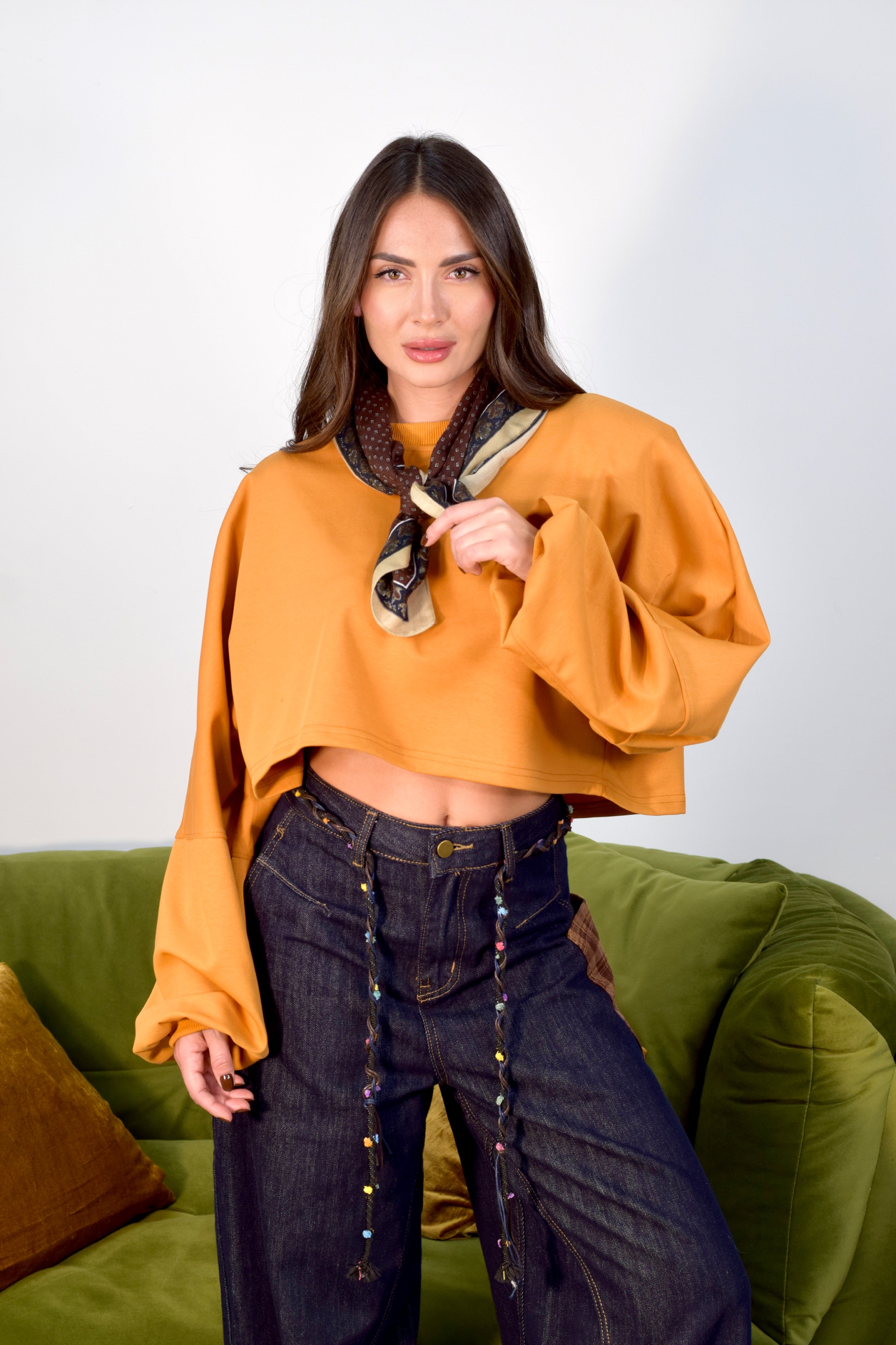 Felpa crop in taglia unica con polsini elasticizzati e maniche leggermente a sbuffo, dal design moderno e versatile, perfetta per completare look casual e di tendenza.