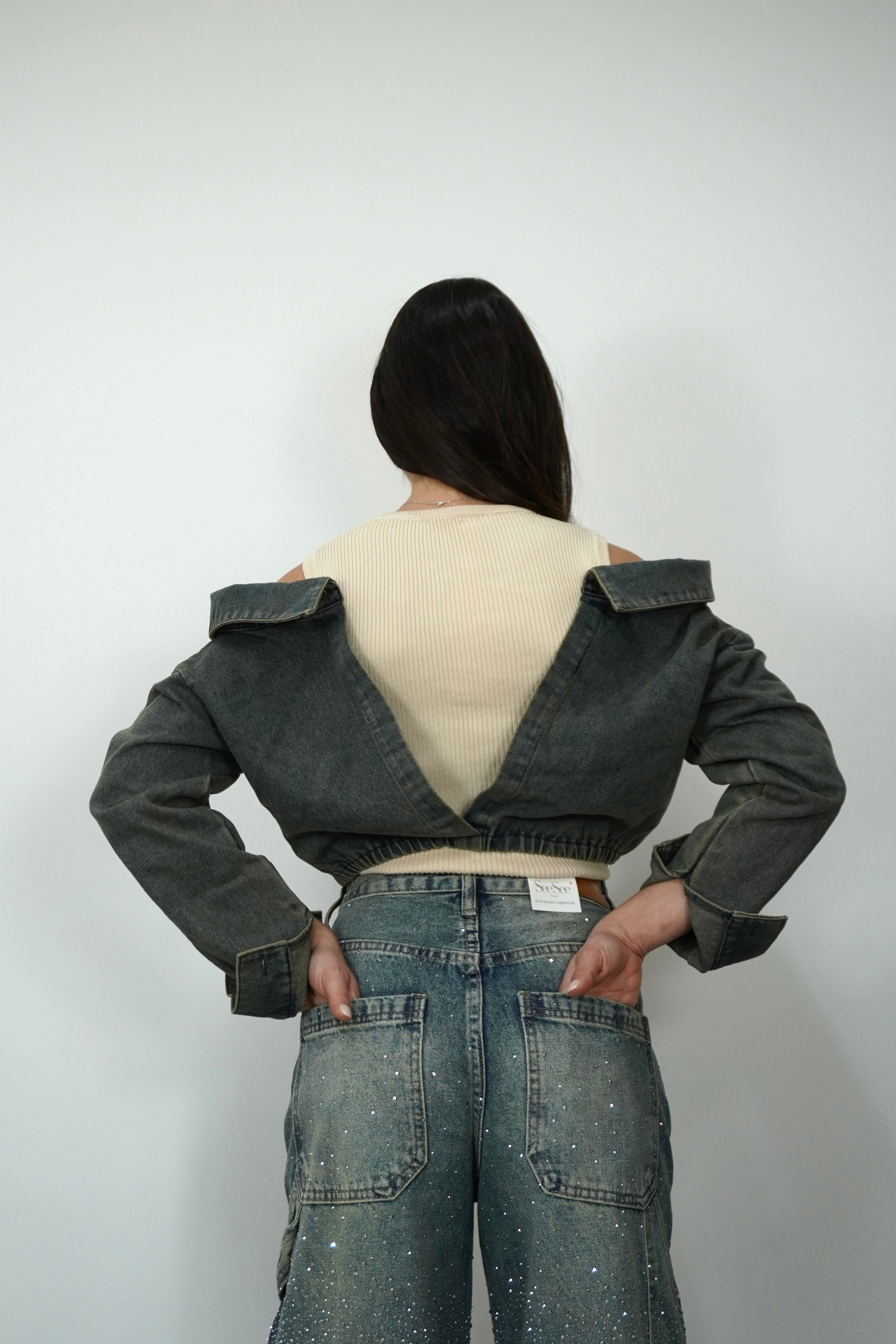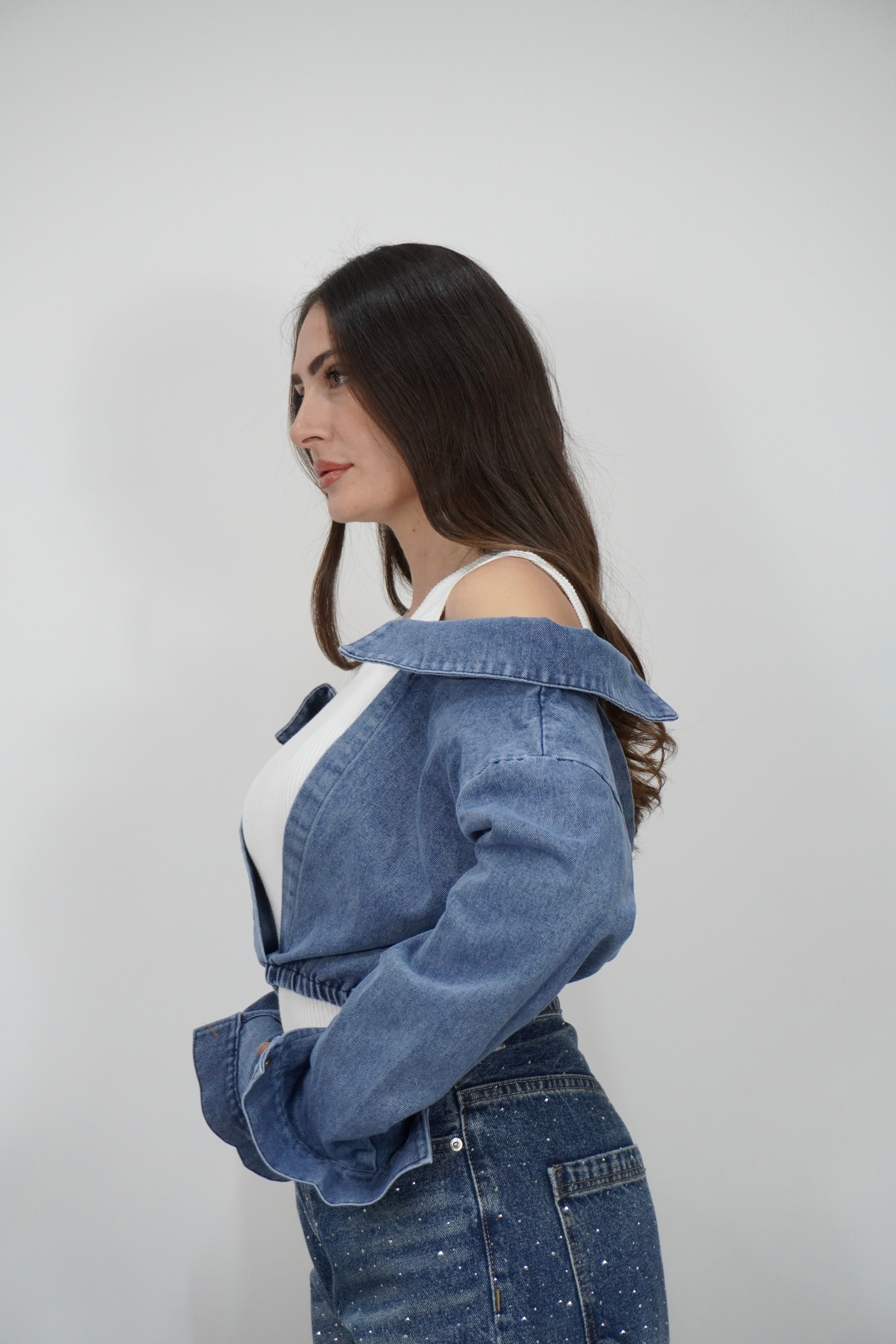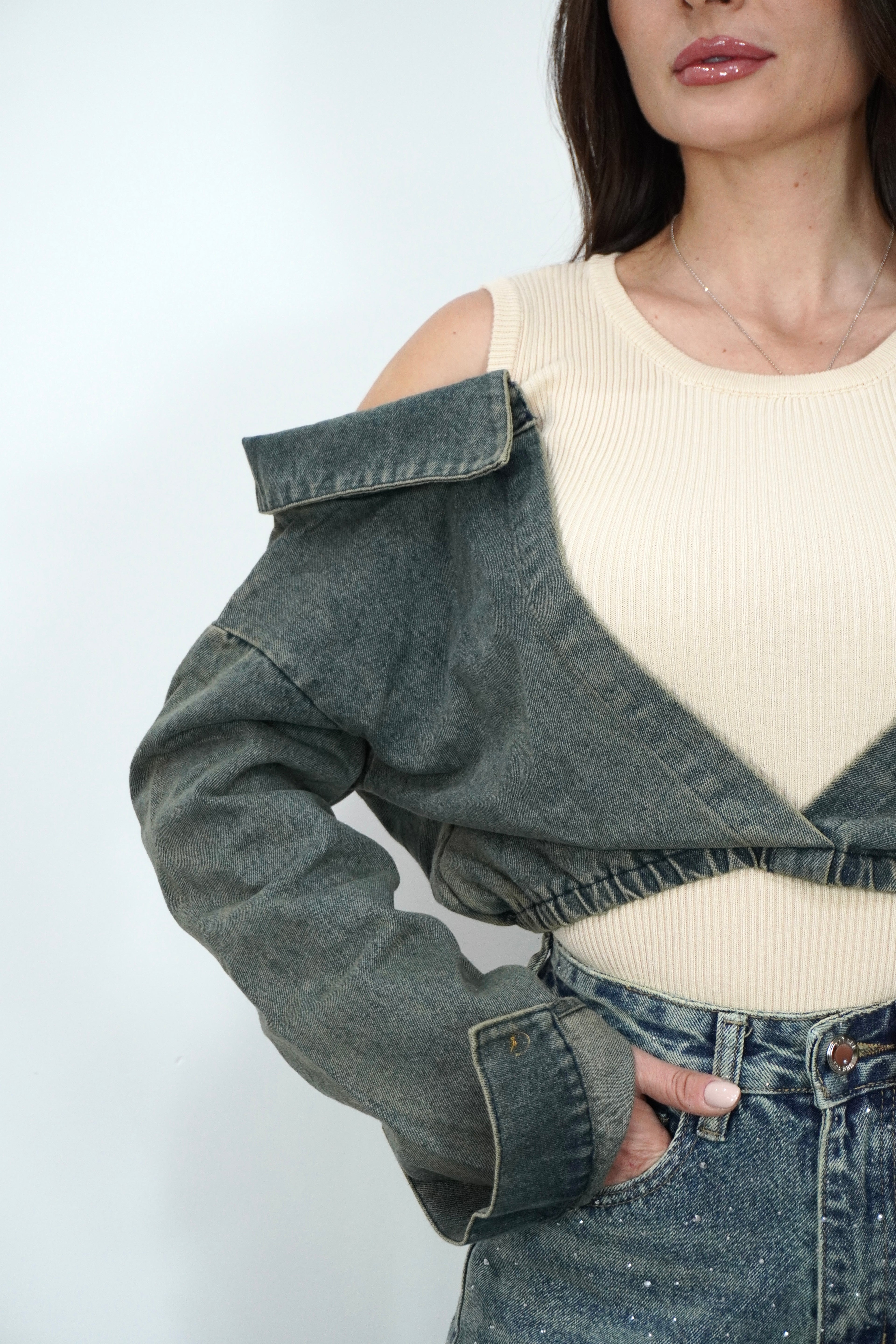 Giacca di jeans cropped con spalle scoperte, attaccata con un bottoncino a una canotta removibile, taglia unica. Design originale e versatile, ideale per creare look trendy e personalizzati.