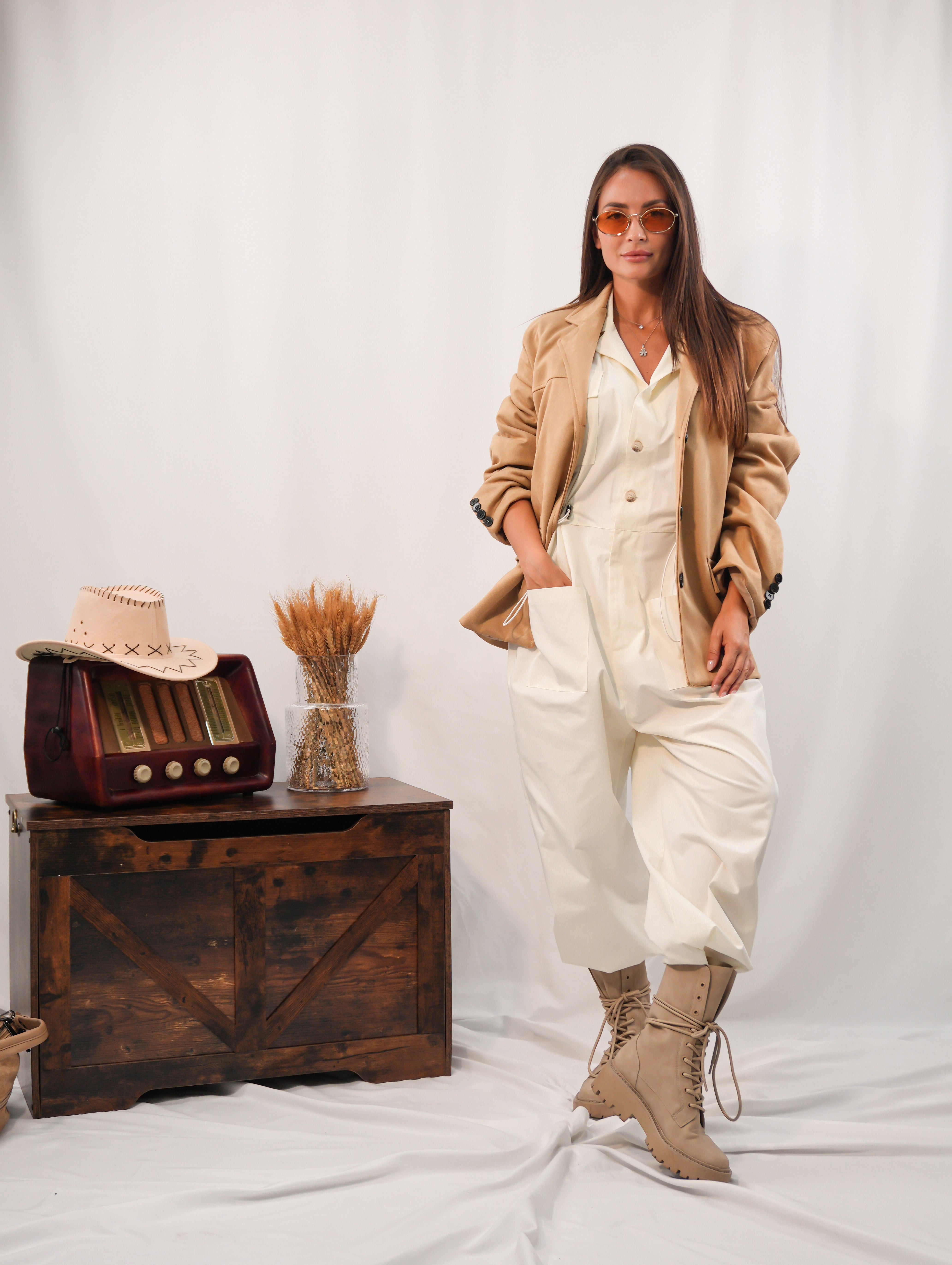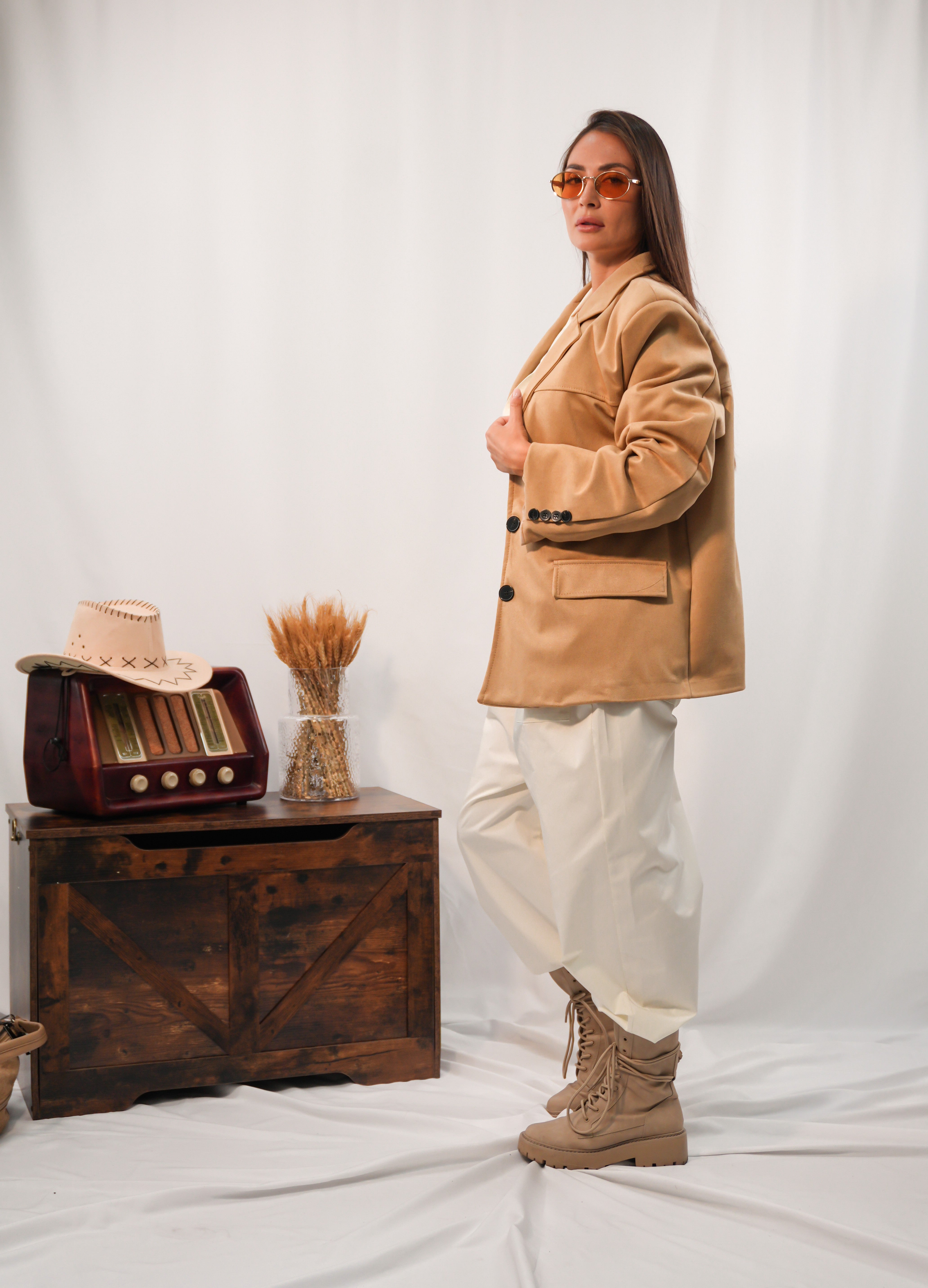 Giacca oversize in camoscio color camel, dal design morbido e avvolgente. Taglia unica, pensata per adattarsi con stile e comfort a diverse fisicità.