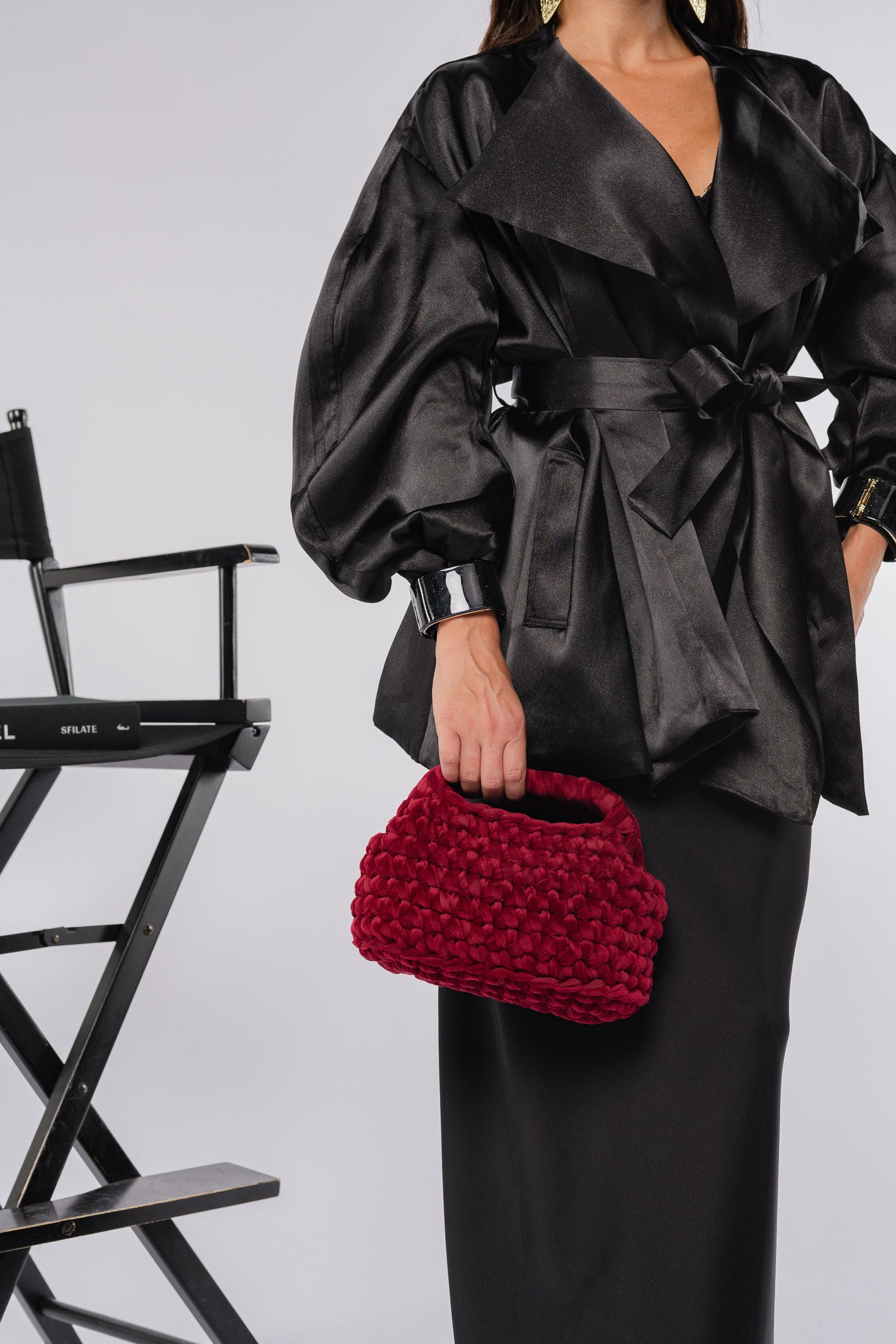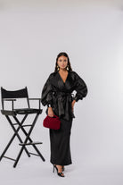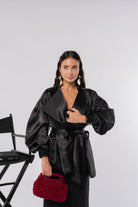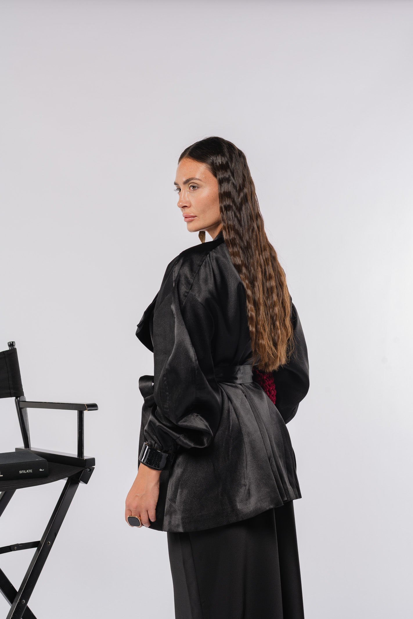 Giacca in raso elegante con collo reverse, maniche a sbuffo e polsino stretto, completata da una fusciacca in vita removibile. Taglia unica, femminile e sofisticata.