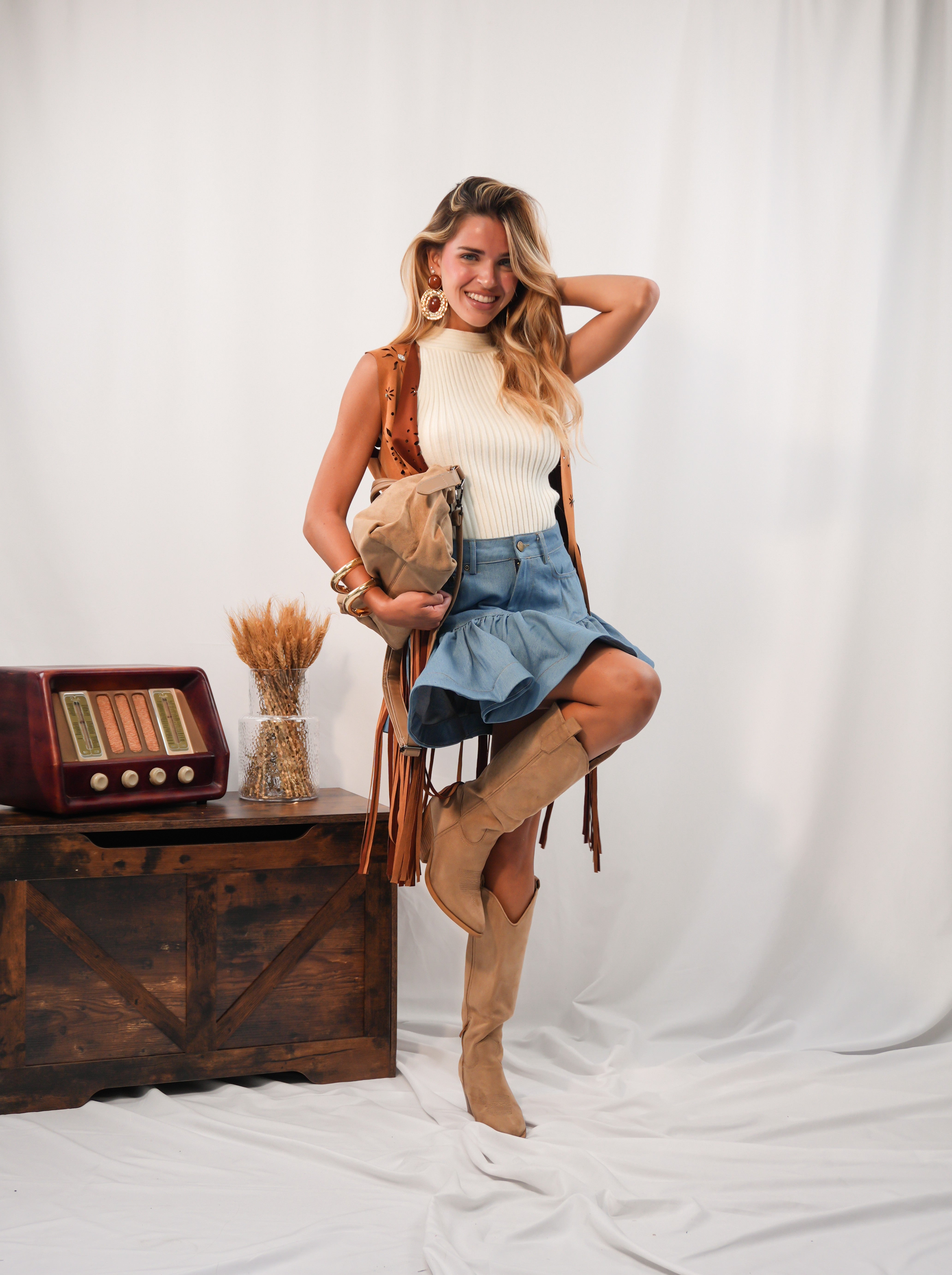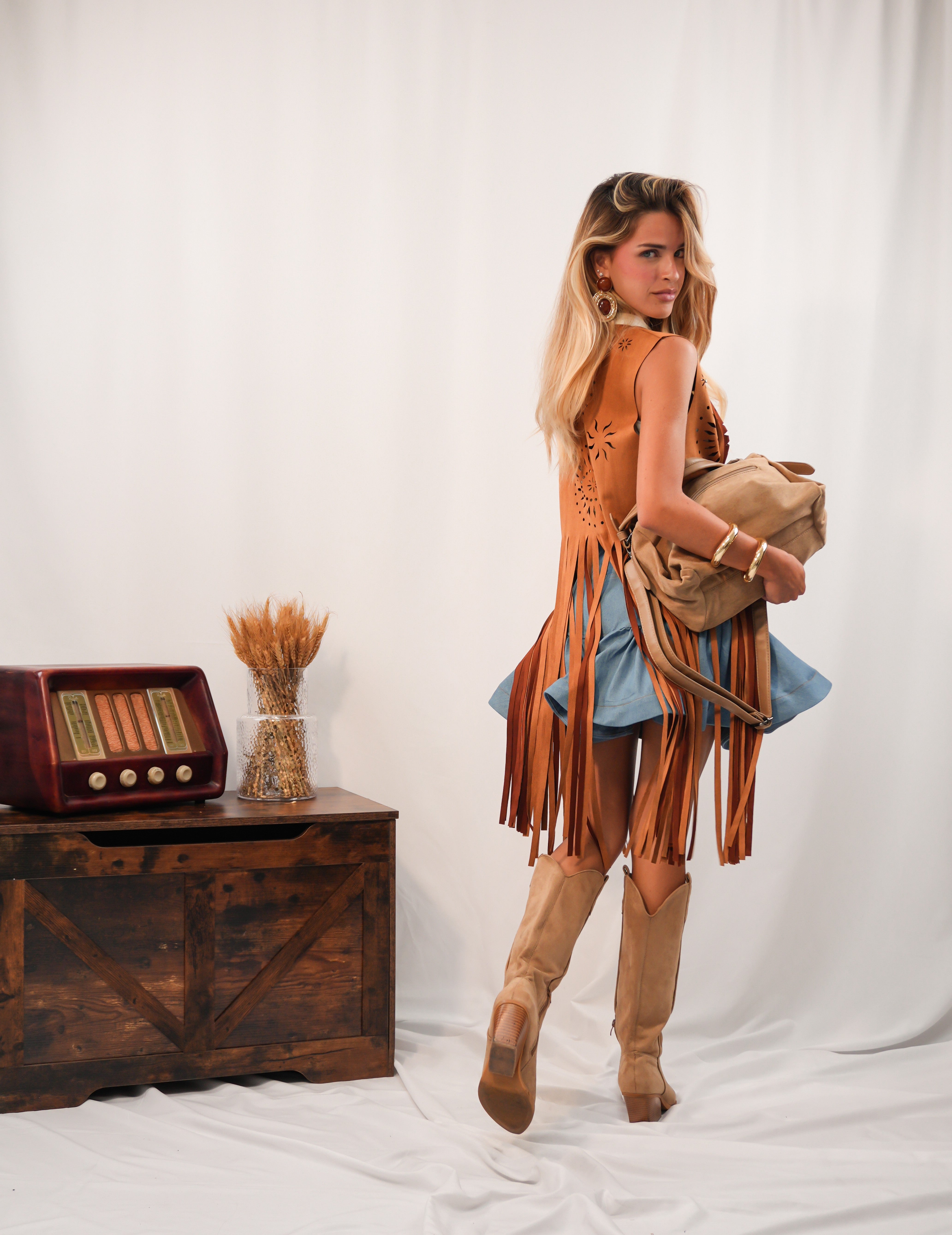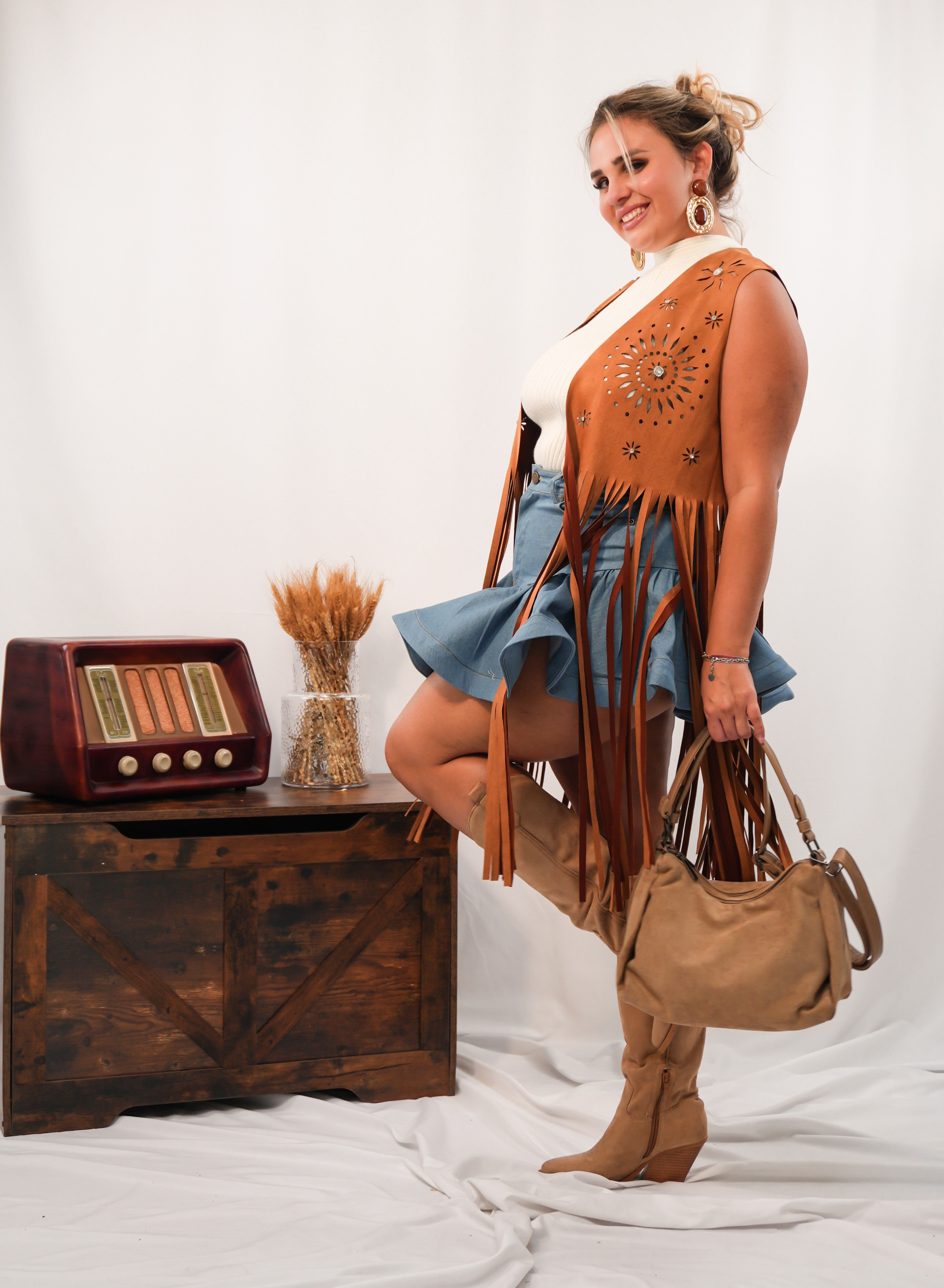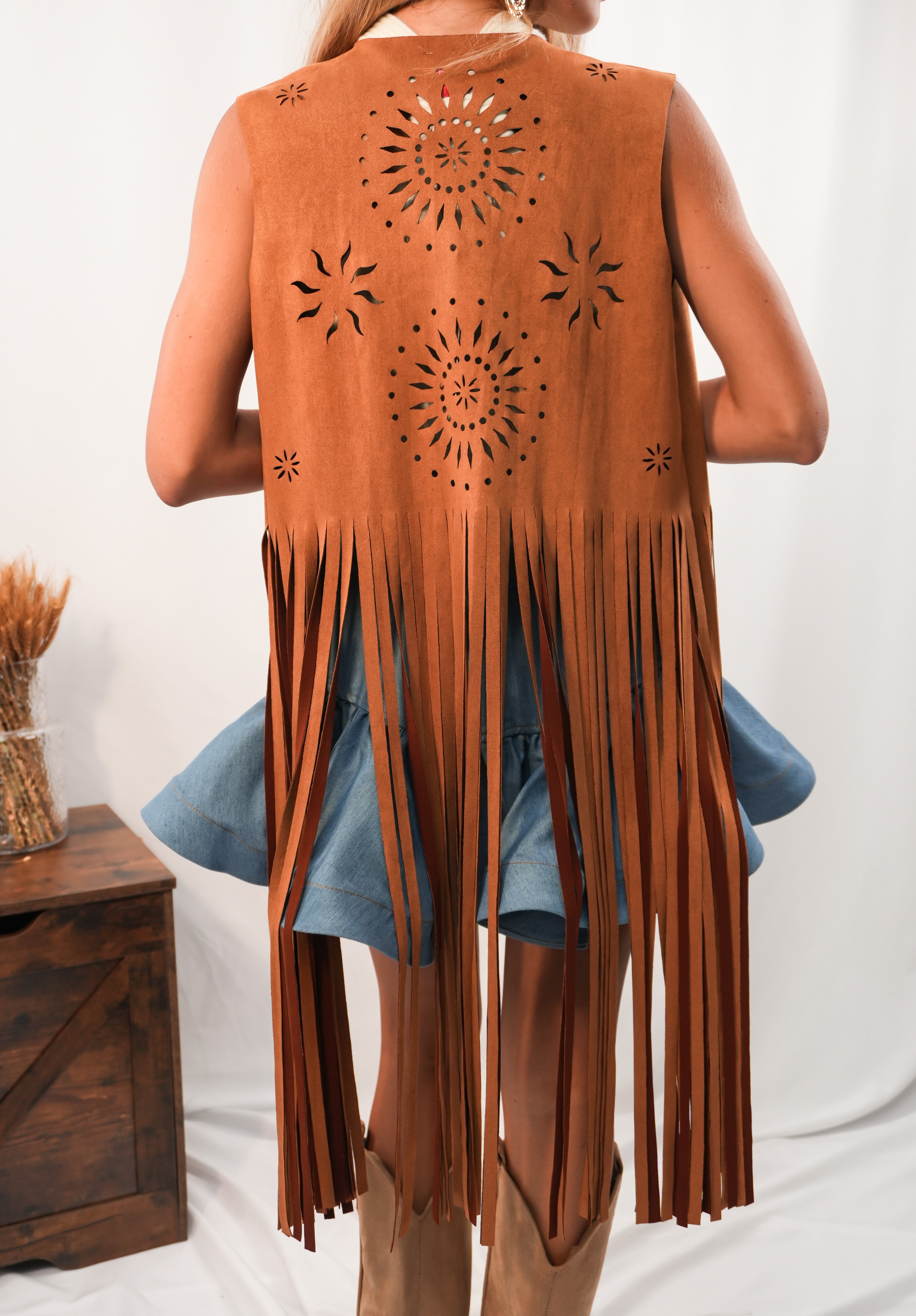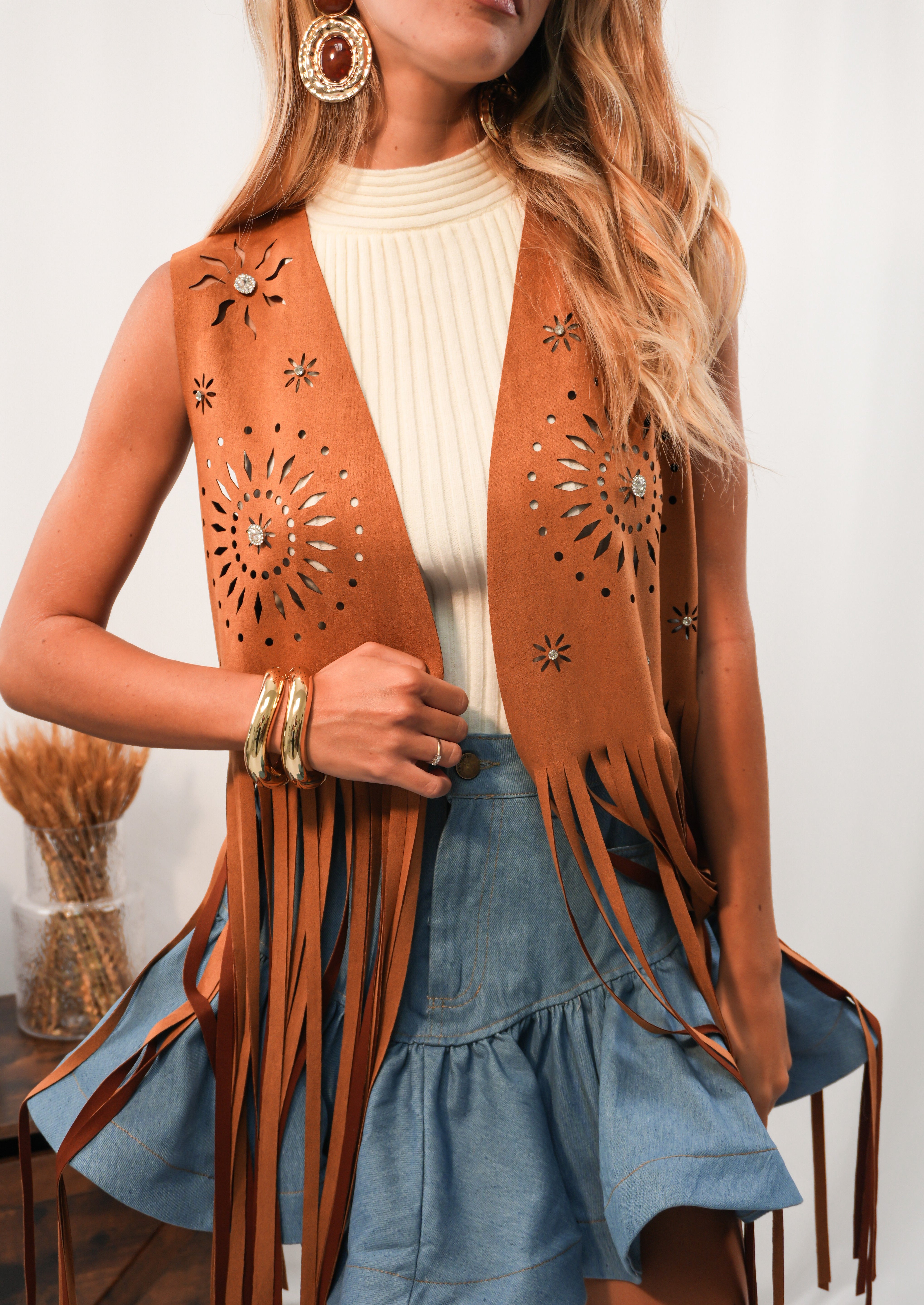 Gilet scamosciato con frange e dettagli gioiello in rilievo sul fronte. Taglia unica, pensato per valorizzare ogni tipologia di donna con un tocco boho-chic e distintivo.