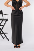 Gonna in simil raso dal tessuto spesso ed elegante, con elastico in vita per una vestibilità comoda e femminile.