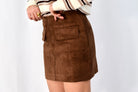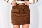 Mini gonna in ecocamoscio color cuoio con zip frontale e finte tasche. Morbida al tatto, dal taglio essenziale e facile da abbinare.