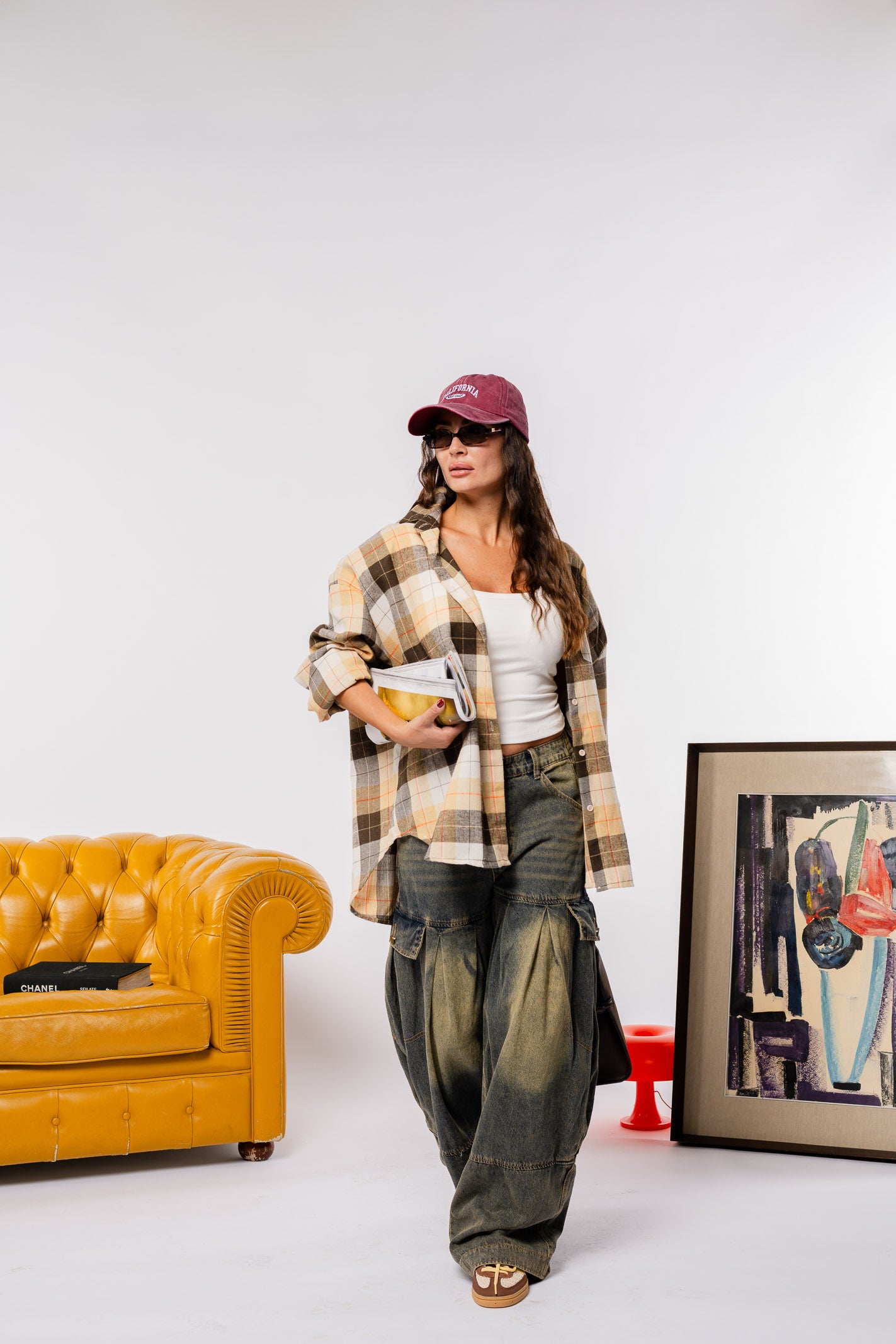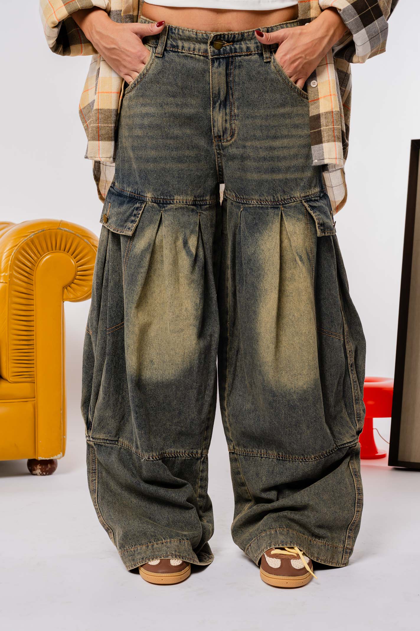 Jeans modello cargo a vita bassa con fit over ampio e tasconi laterali, caratterizzato da un moderno effetto scolorito per un look urbano e contemporaneo.