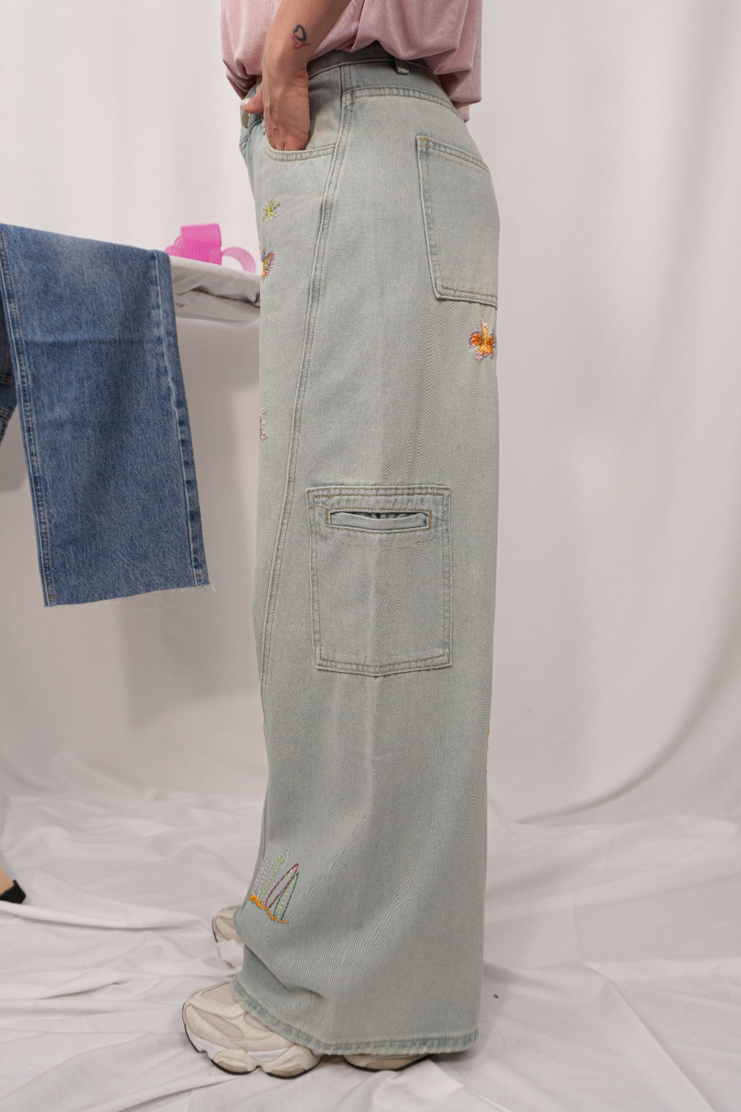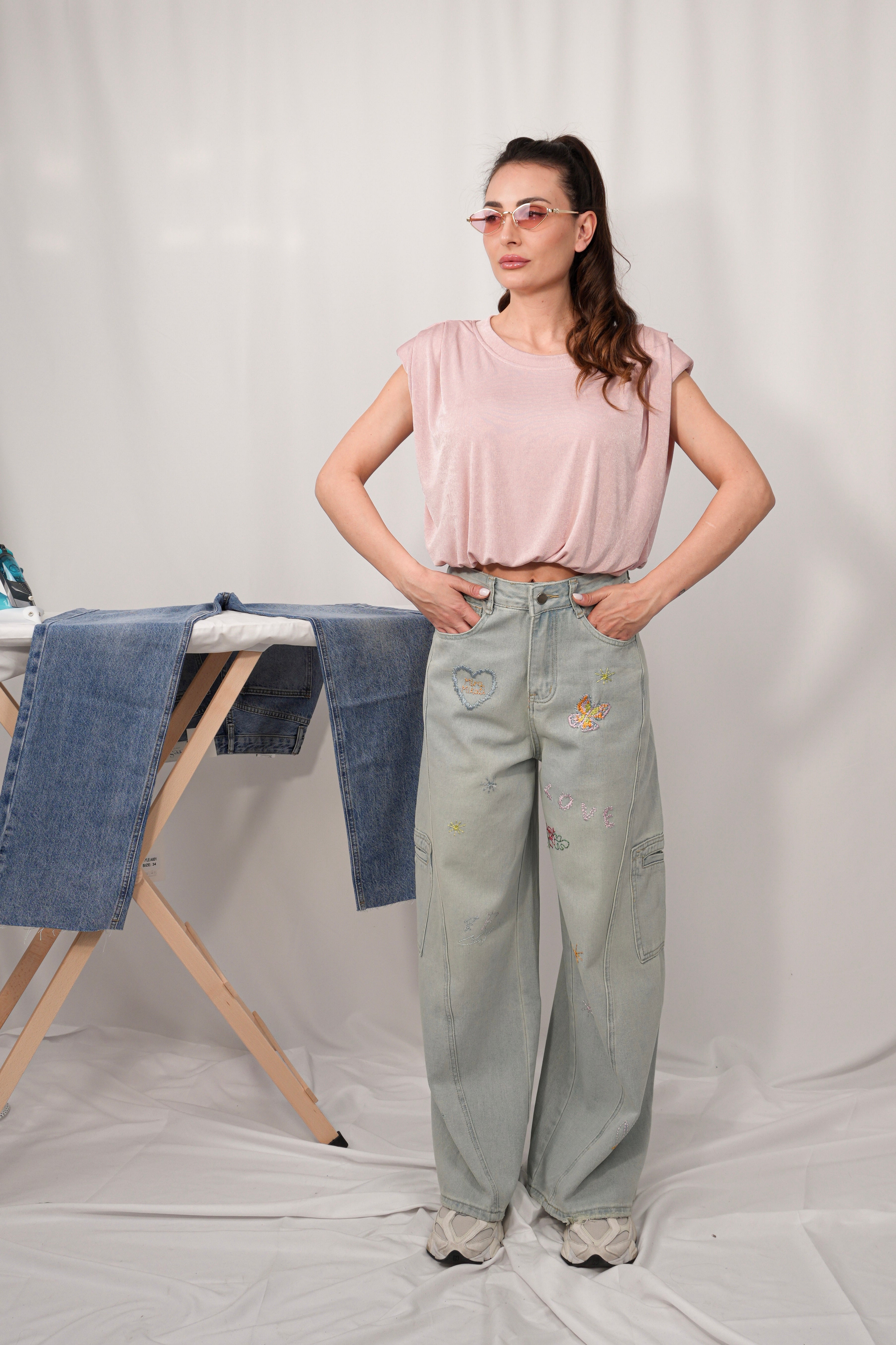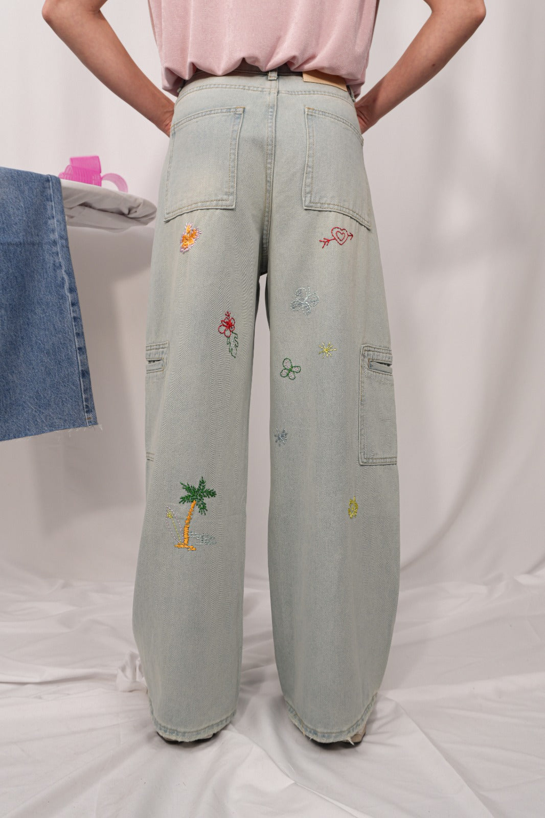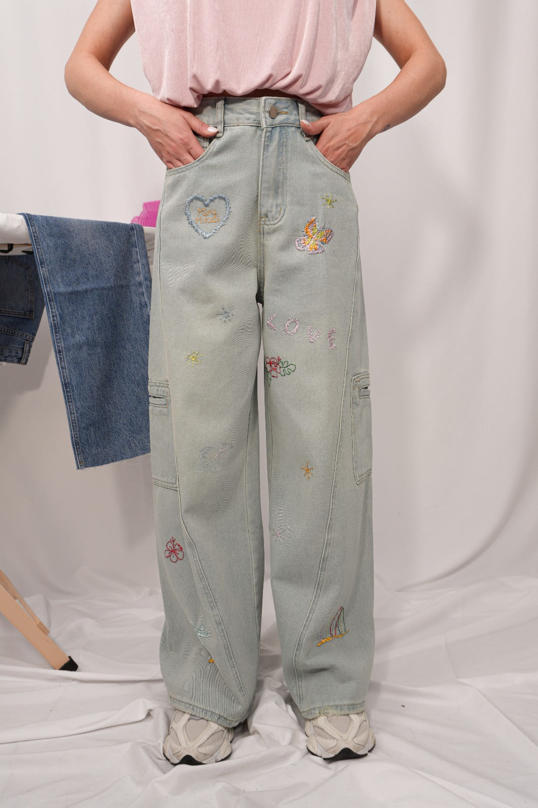Jeans in denim chiaro con lavaggio soft e dettagli ricamati multicolor dal mood playful e romantico. Motivi floreali, cuori e scritte come “love” donano un tocco fresco e creativo al look, perfetto per la bella stagione.
