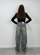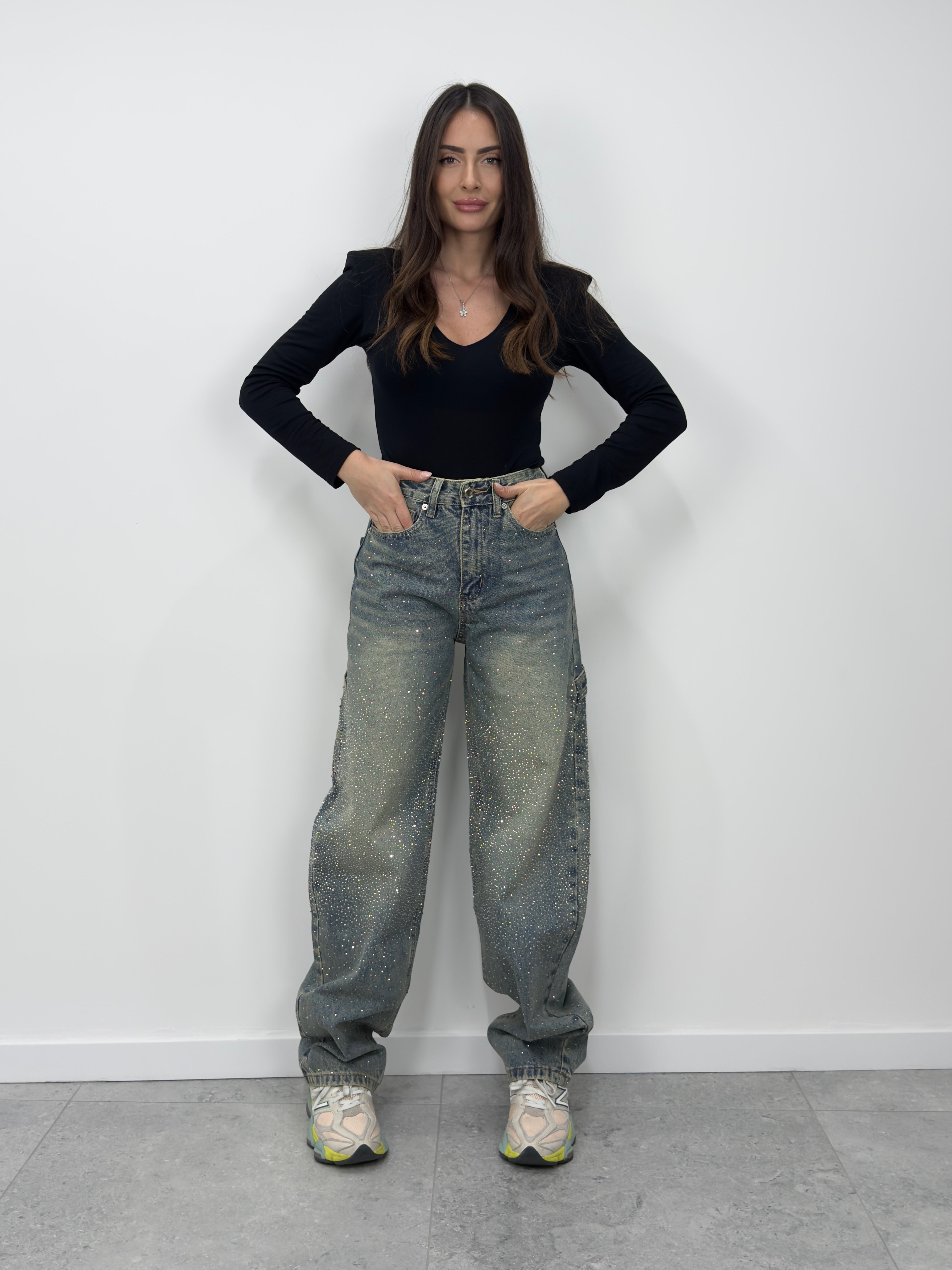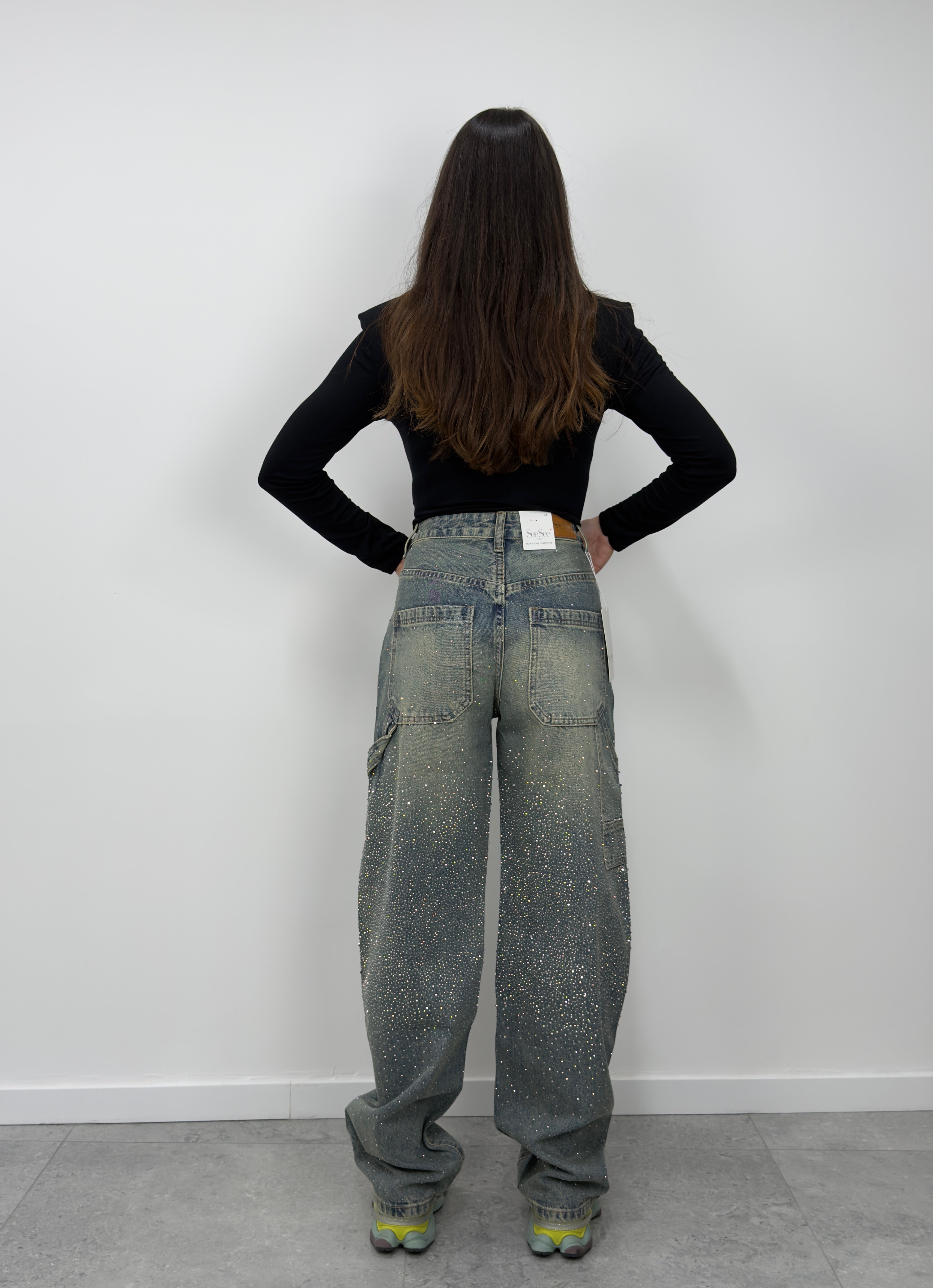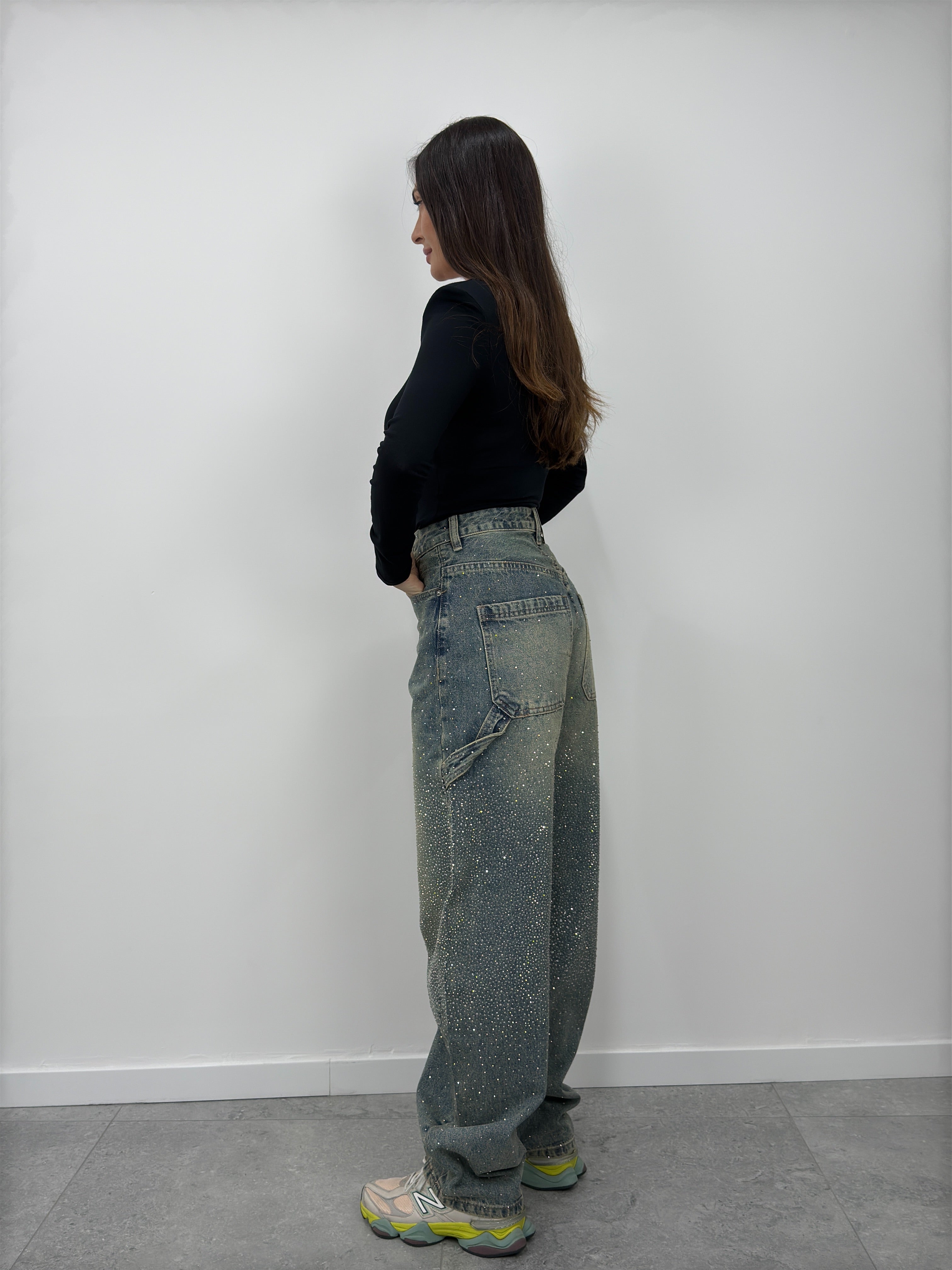 Jeans baggy impreziositi da applicazioni di microstrass, ideali per un look casual con un tocco di luminosita'. Le taglie seguono la numerazione europea: per la conversione alla taglia italiana è necessario aggiungere più 4.