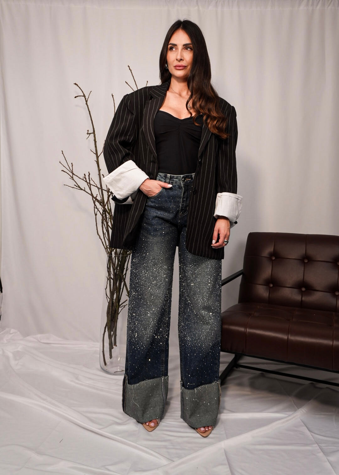 Jeans dal design unico con microstrass sul fronte e retro. Il taglio wide leg e i piegoni risvoltati sul fondo scendono a palazzo, offrendo un look elegante e comodo. Perfetti per ogni occasione, dal giorno alla sera.