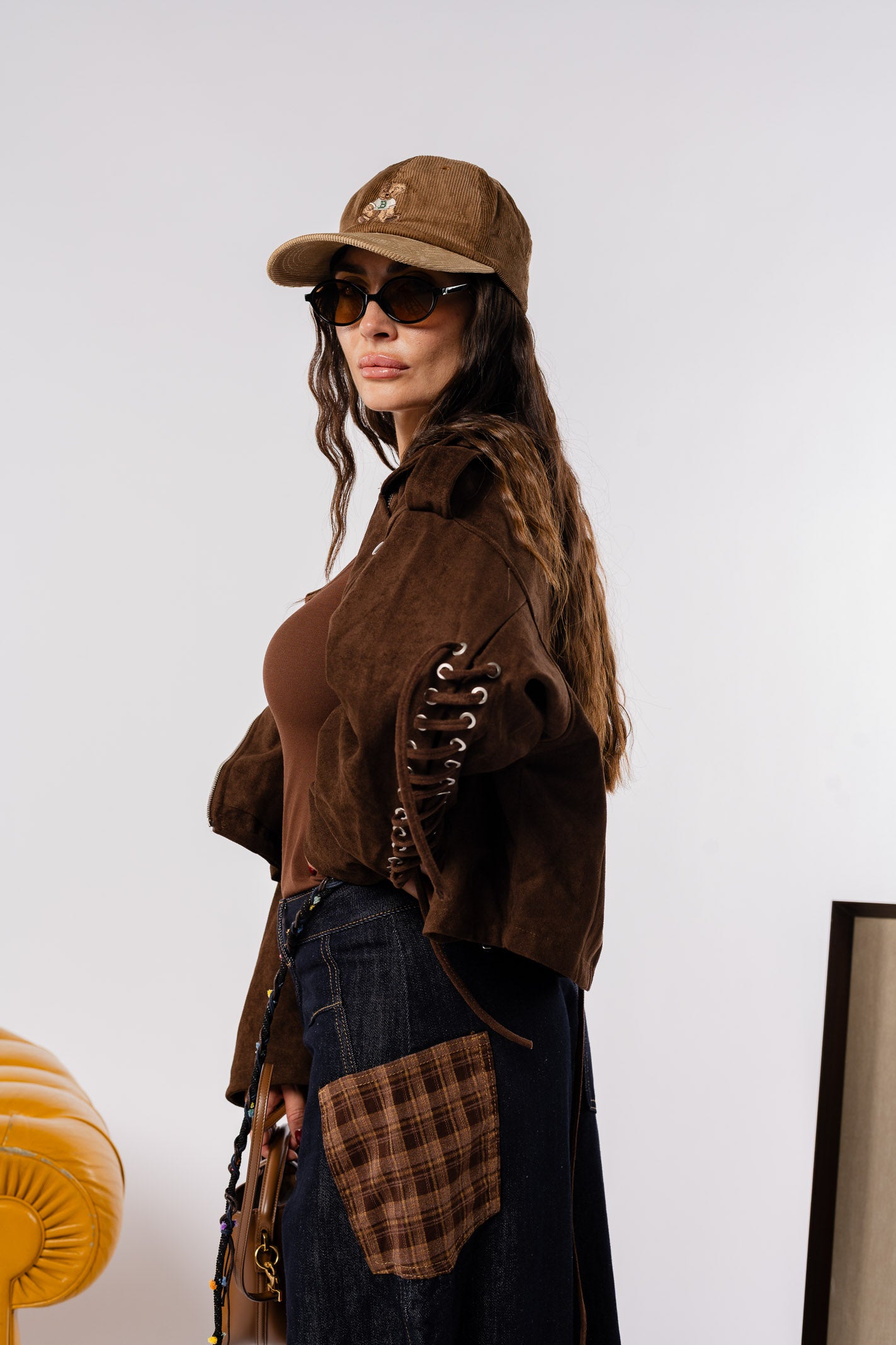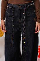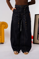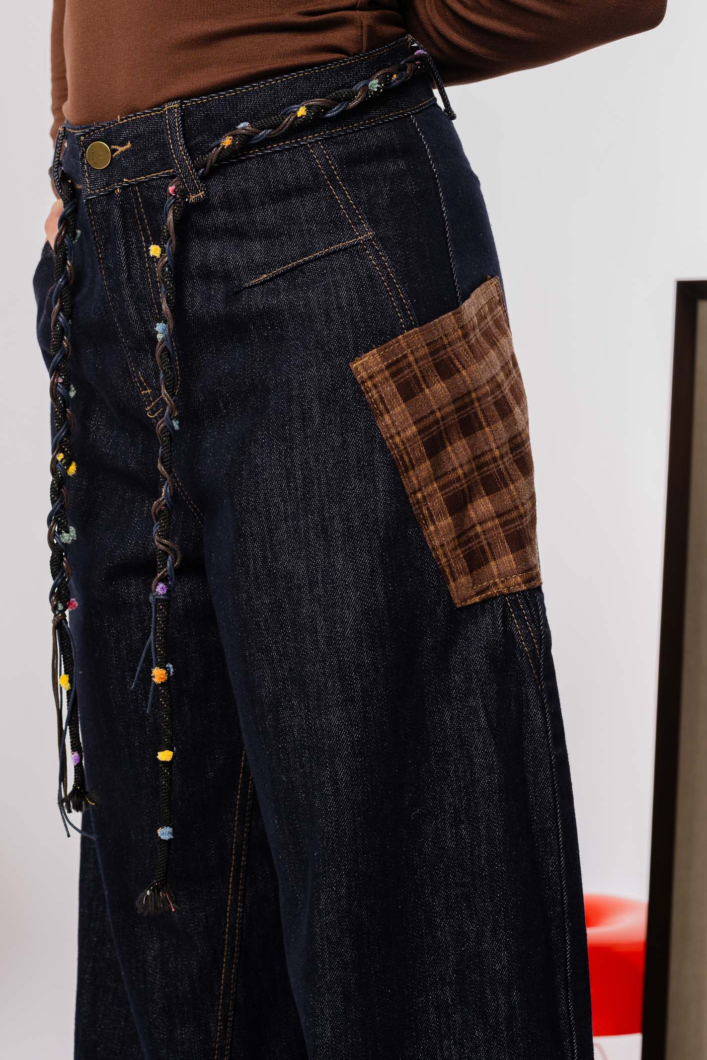 Jeans balloon a lavaggio scuro con cintura removibile e unica tasca a toppa sul retro con fantasia a quadri nei toni della terra. Originale e versatile, perfetto per look casual dal carattere deciso.