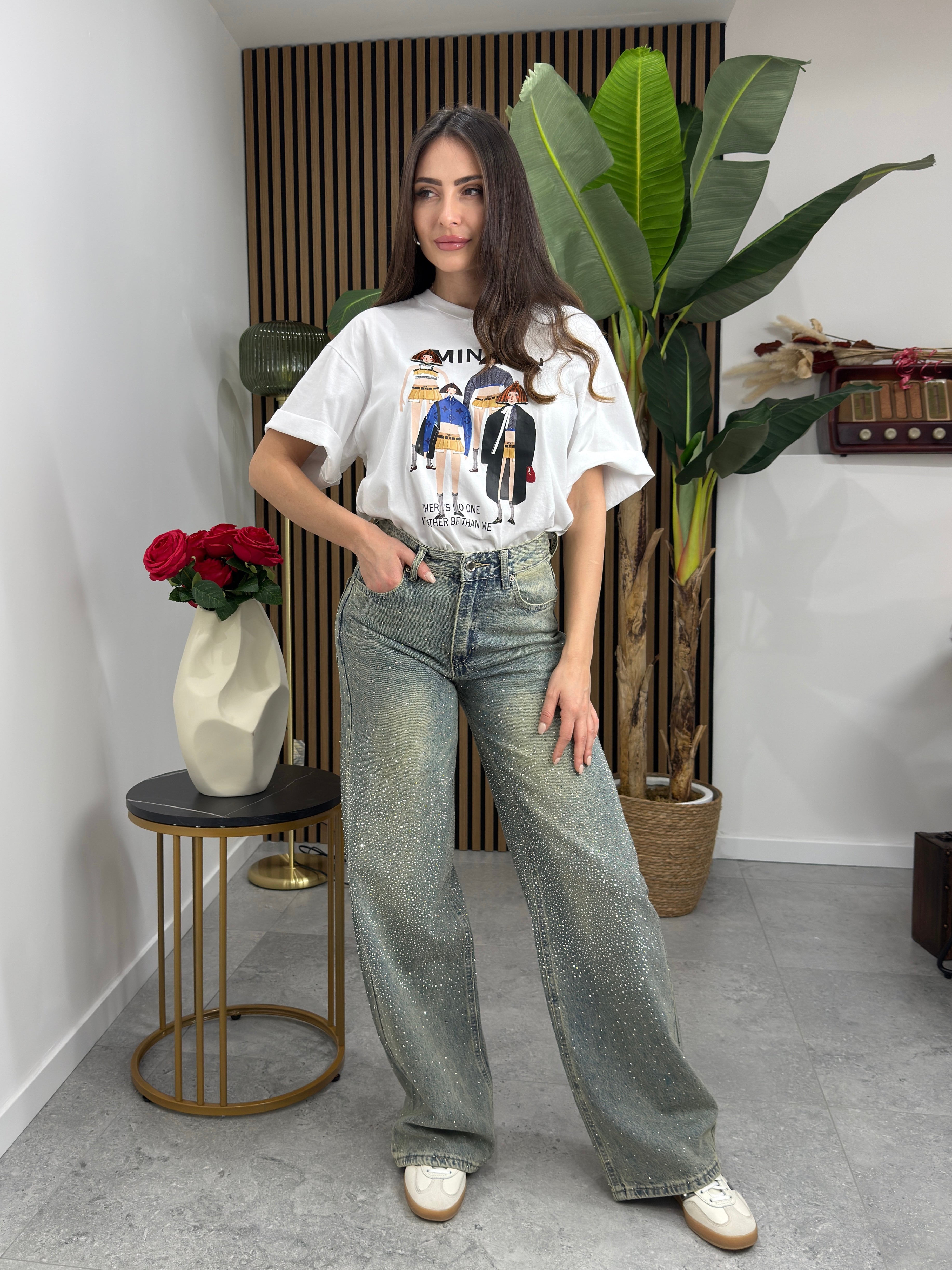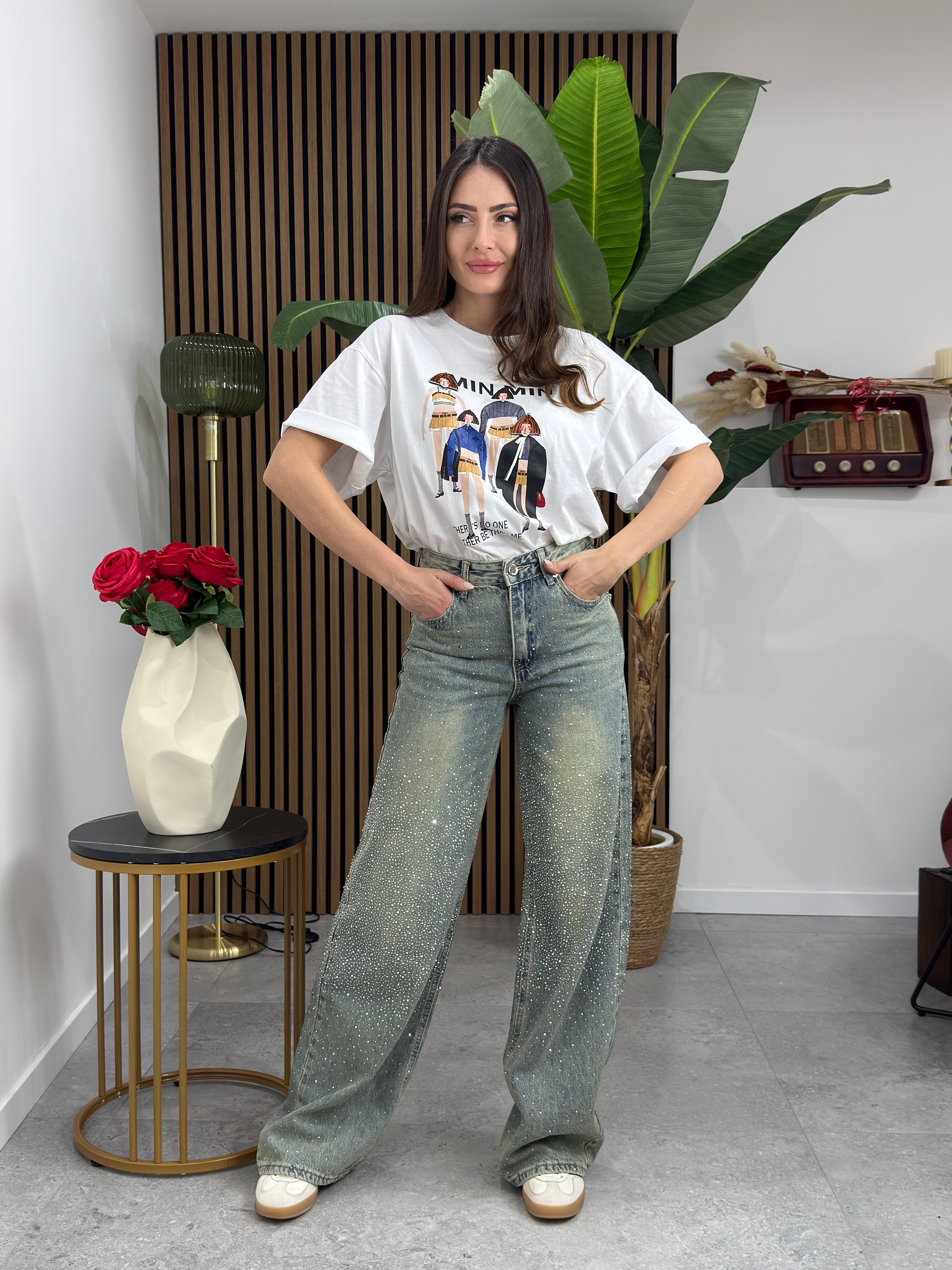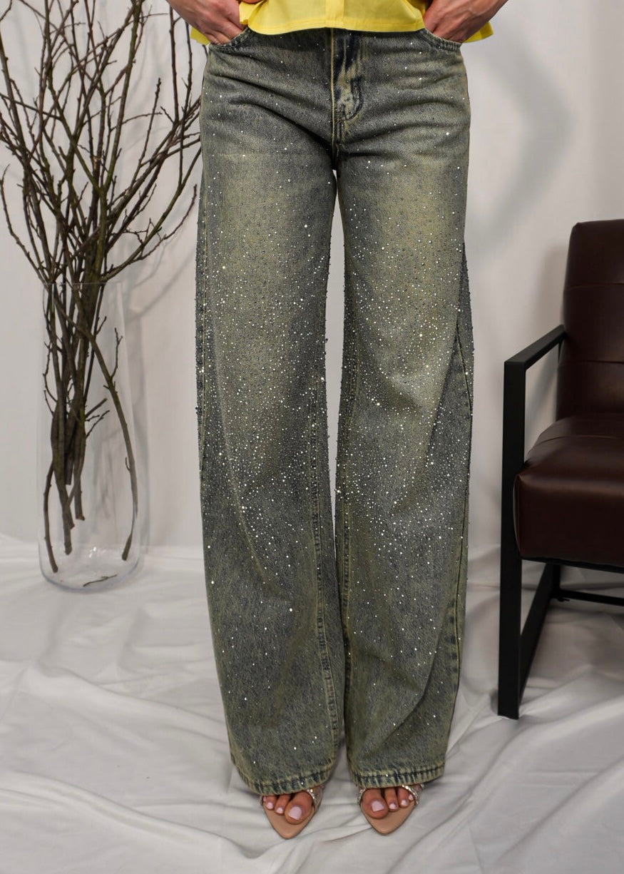 Jeans wide leg microstrass sabbiato, dallo stile grintoso e luminoso. Perfetto per un look glamour e di tendenza. Le taglie seguono la numerazione europea: per la conversione alla taglia italiana è necessario aggiungere più 4.
