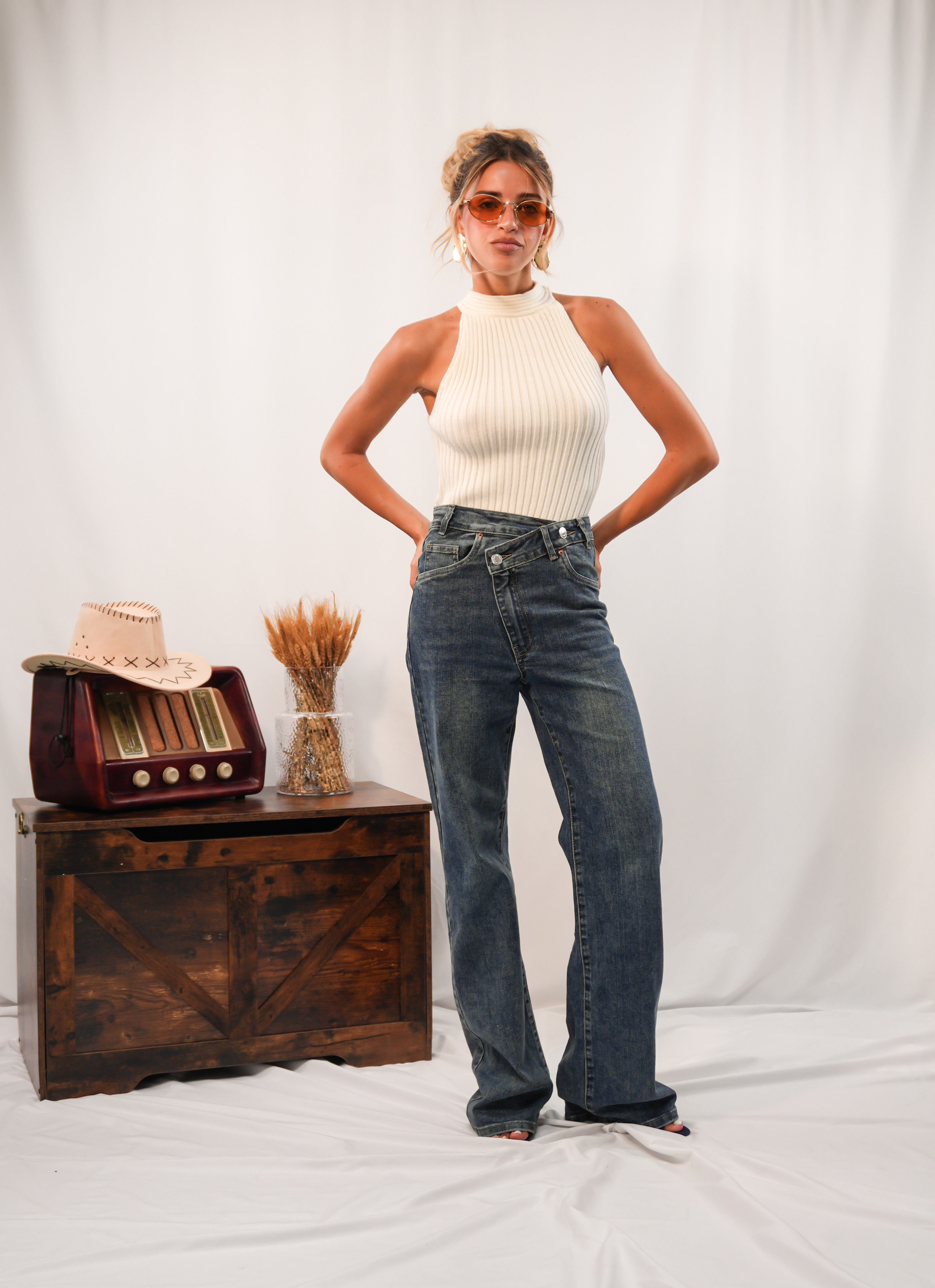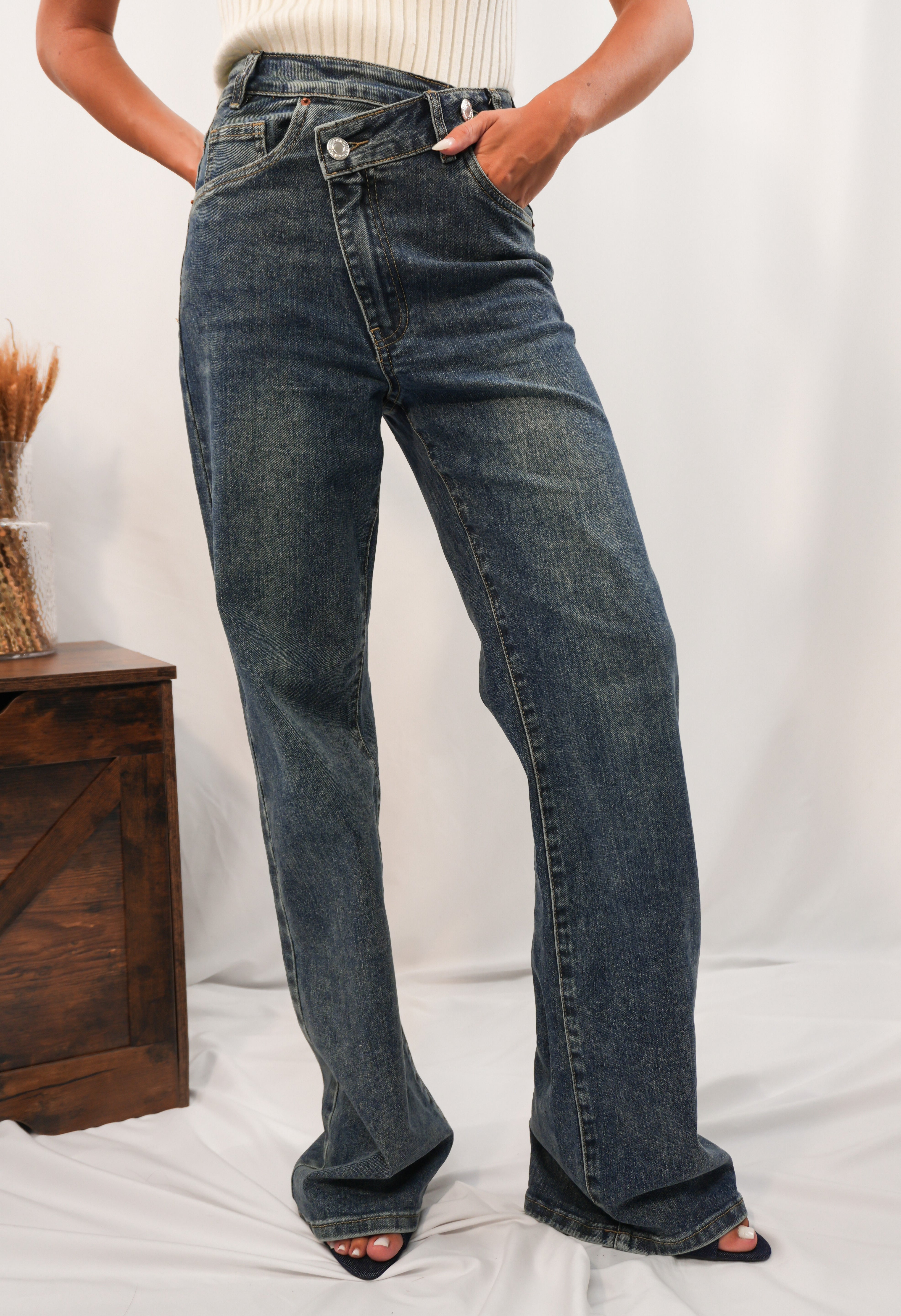 Jeans wide leg elasticizzato con originale chiusura a bottoni trasversali. Linea dritta e confortevole, pensato per adattarsi con facilità a ogni vestibilità.