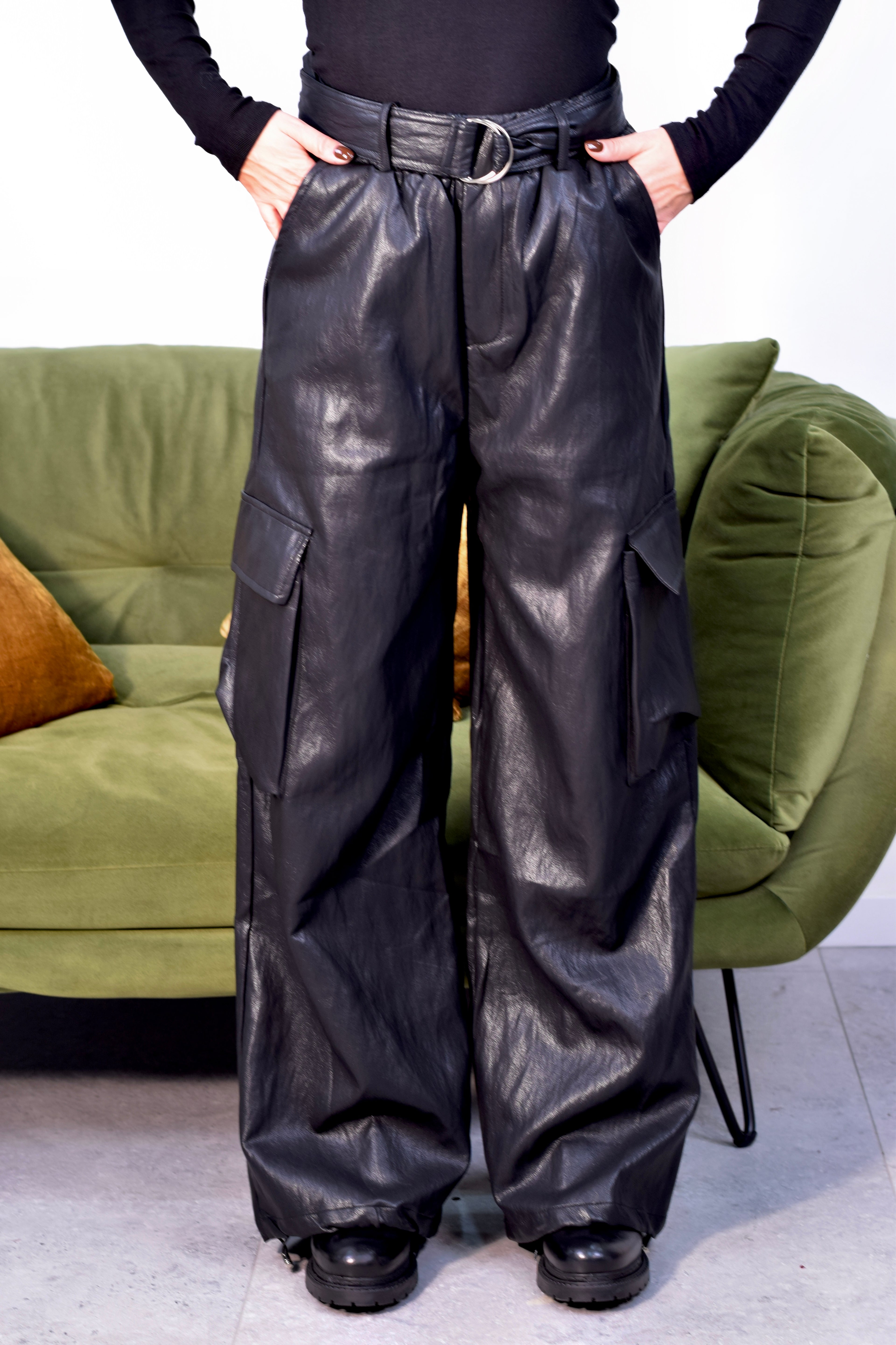 Pantalone cargo in ecopelle con tasconi laterali ampi, cintura incorporata removibile e coulisse regolabile sul fondo per una vestibilità personalizzabile. Design moderno e urbano, perfetto da abbinare a top minimal o felpe oversize per un look casual-chic in città o per occasioni informali.