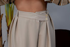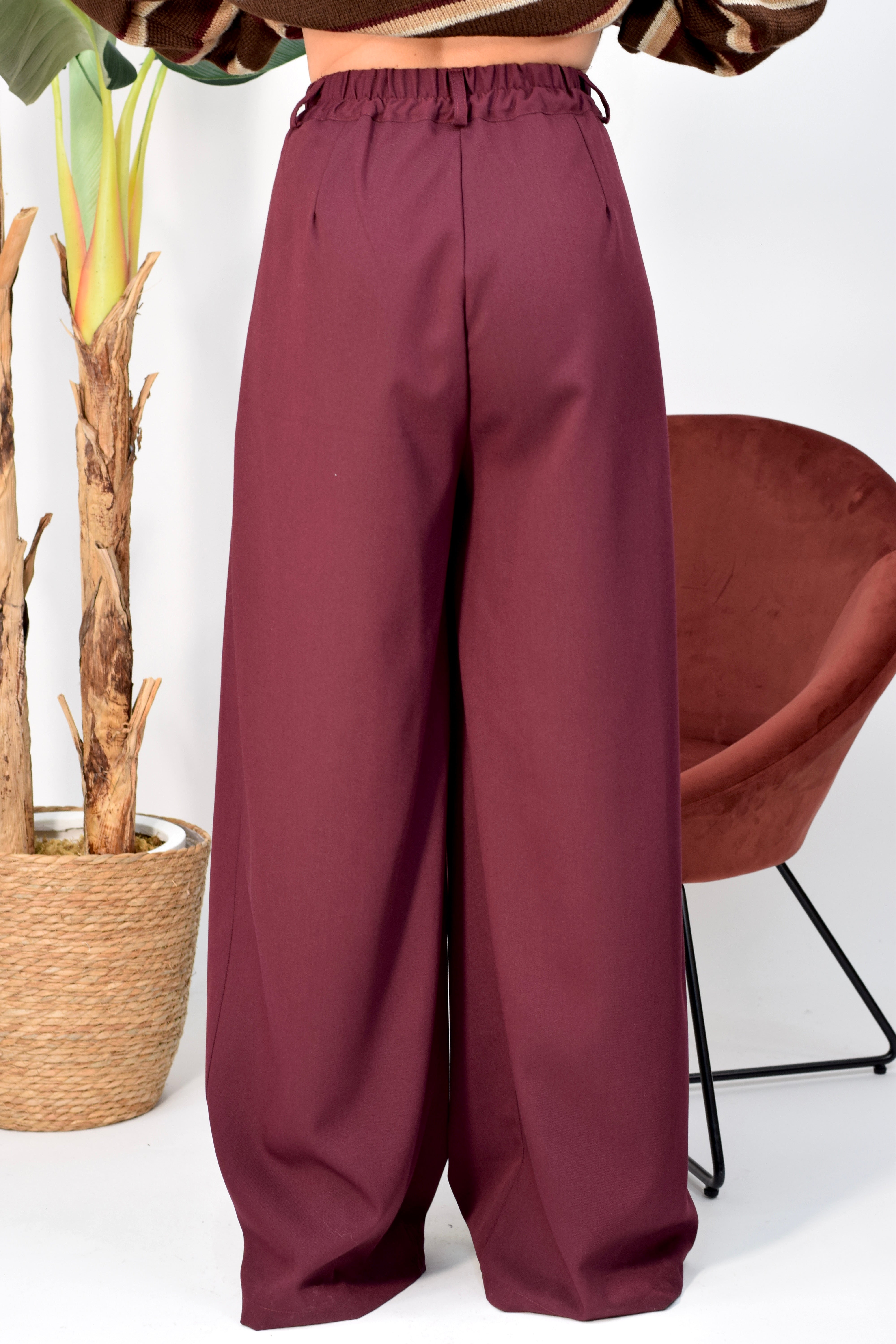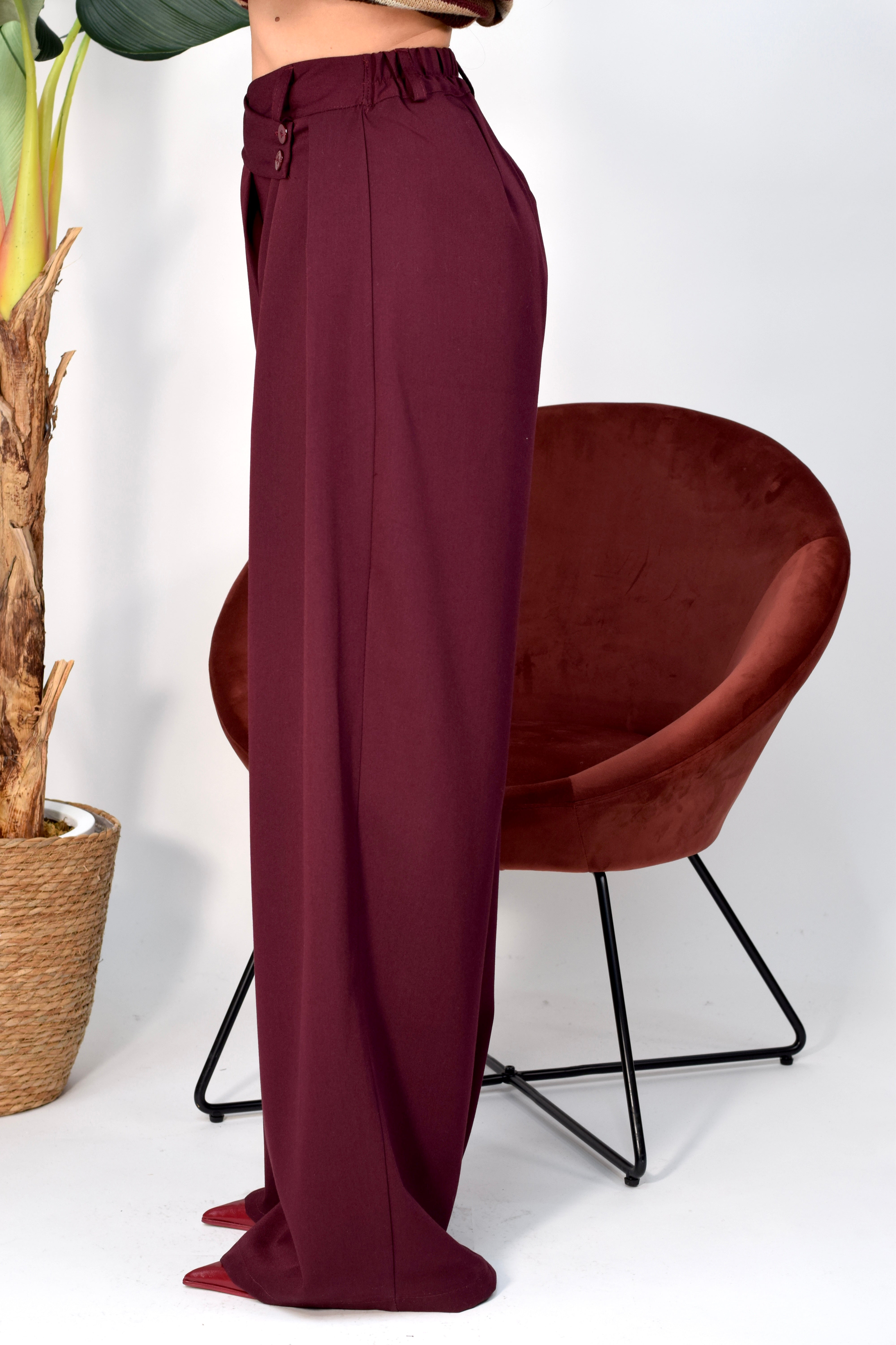 Pantalone ampio a palazzo dal taglio morbido e fluido, perfetto per un look elegante e contemporaneo. Presenta una chiusura frontale trasversale con doppio bottone e zip, mentre l’elastico sul retro garantisce comfort e una vestibilità adattabile a diverse silhouette. Realizzato in tessuto leggero e versatile, si presta sia a outfit casual chic che a combinazioni più raffinate. Taglia unica.