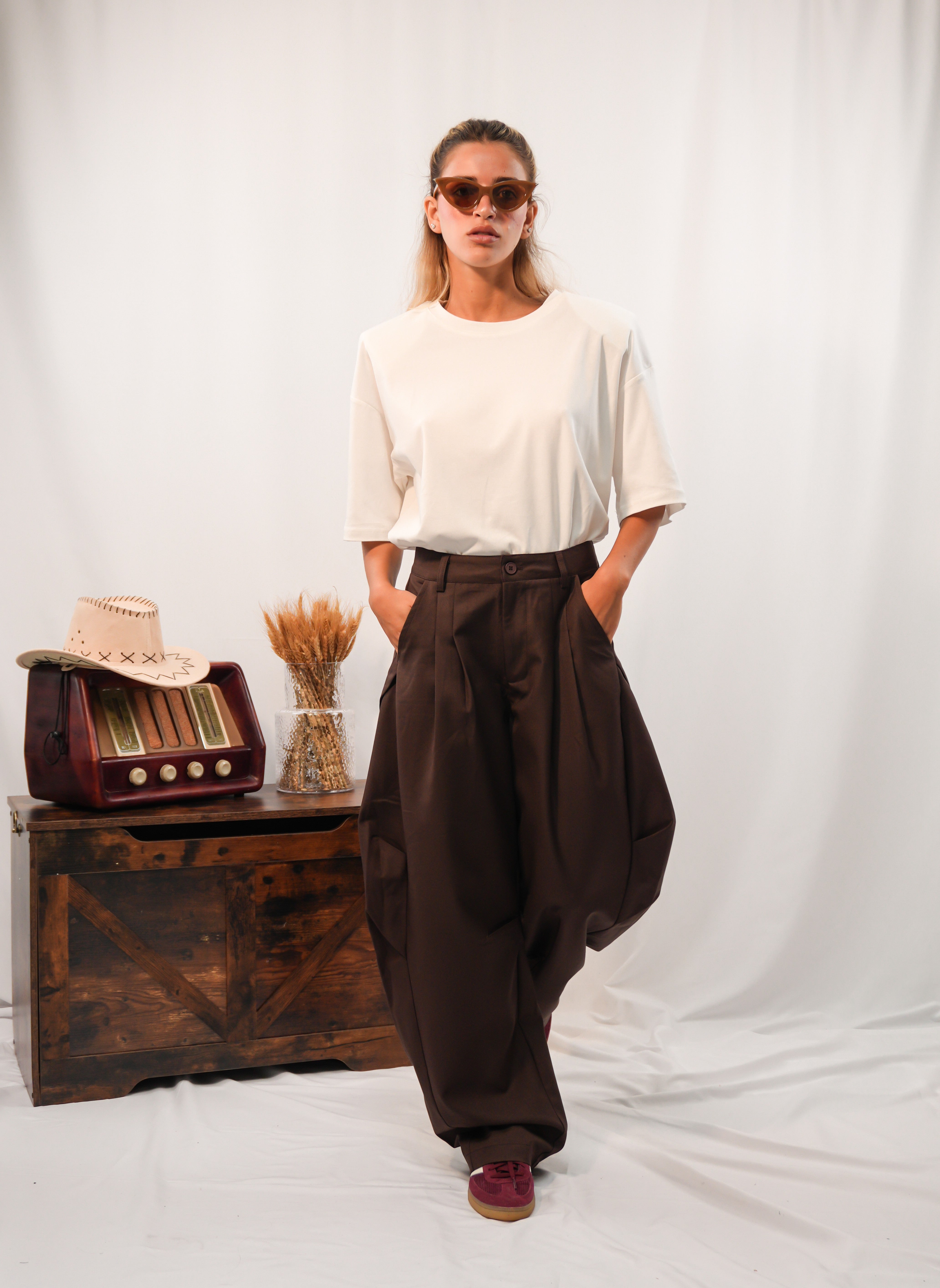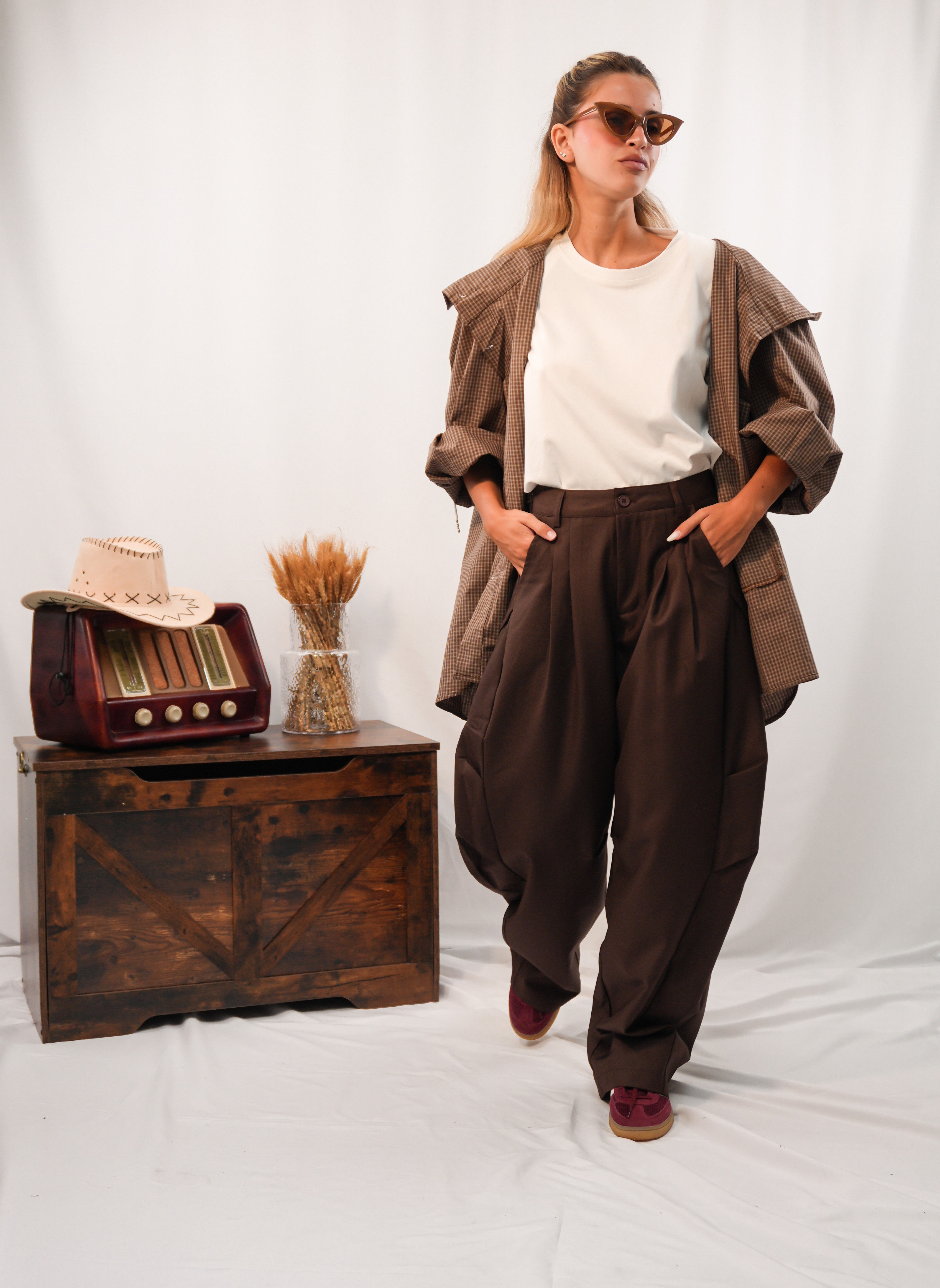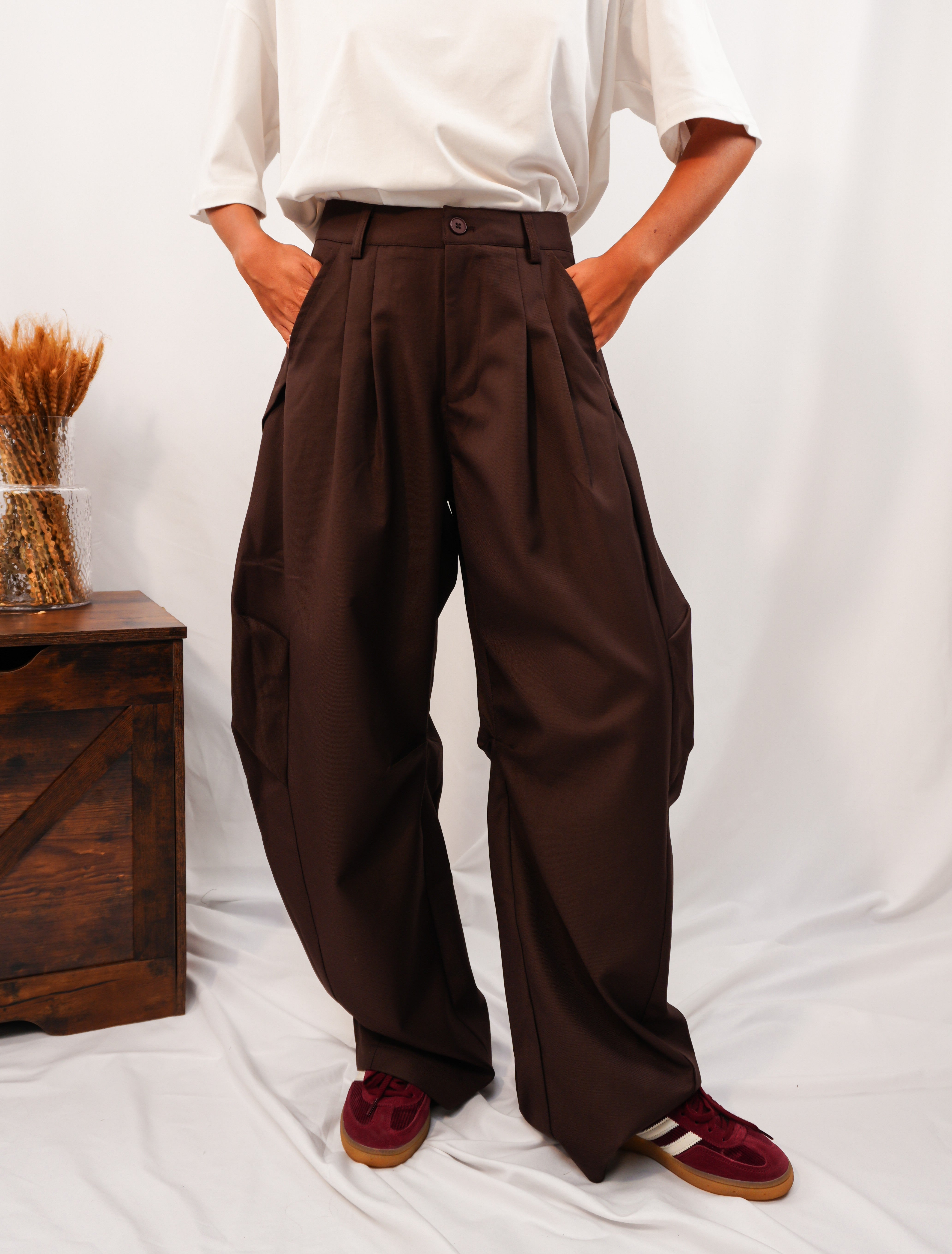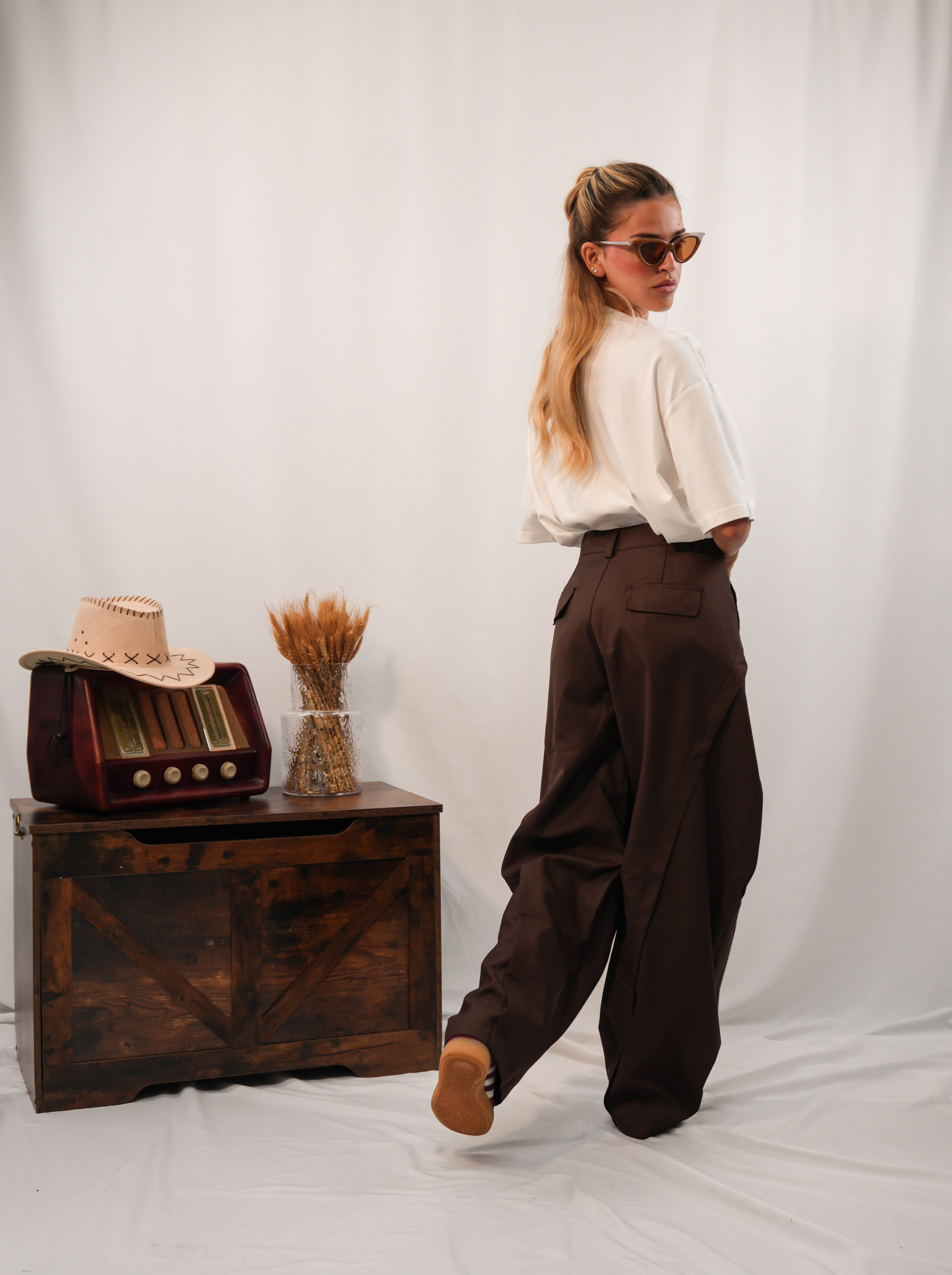 Pantalone modello balloon, di super tendenza e dall’anima comfy. Caratterizzato da volume morbido sulla gamba e linea affusolata alla caviglia, unisce stile e comfort in un capo versatile e contemporaneo.