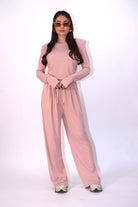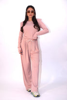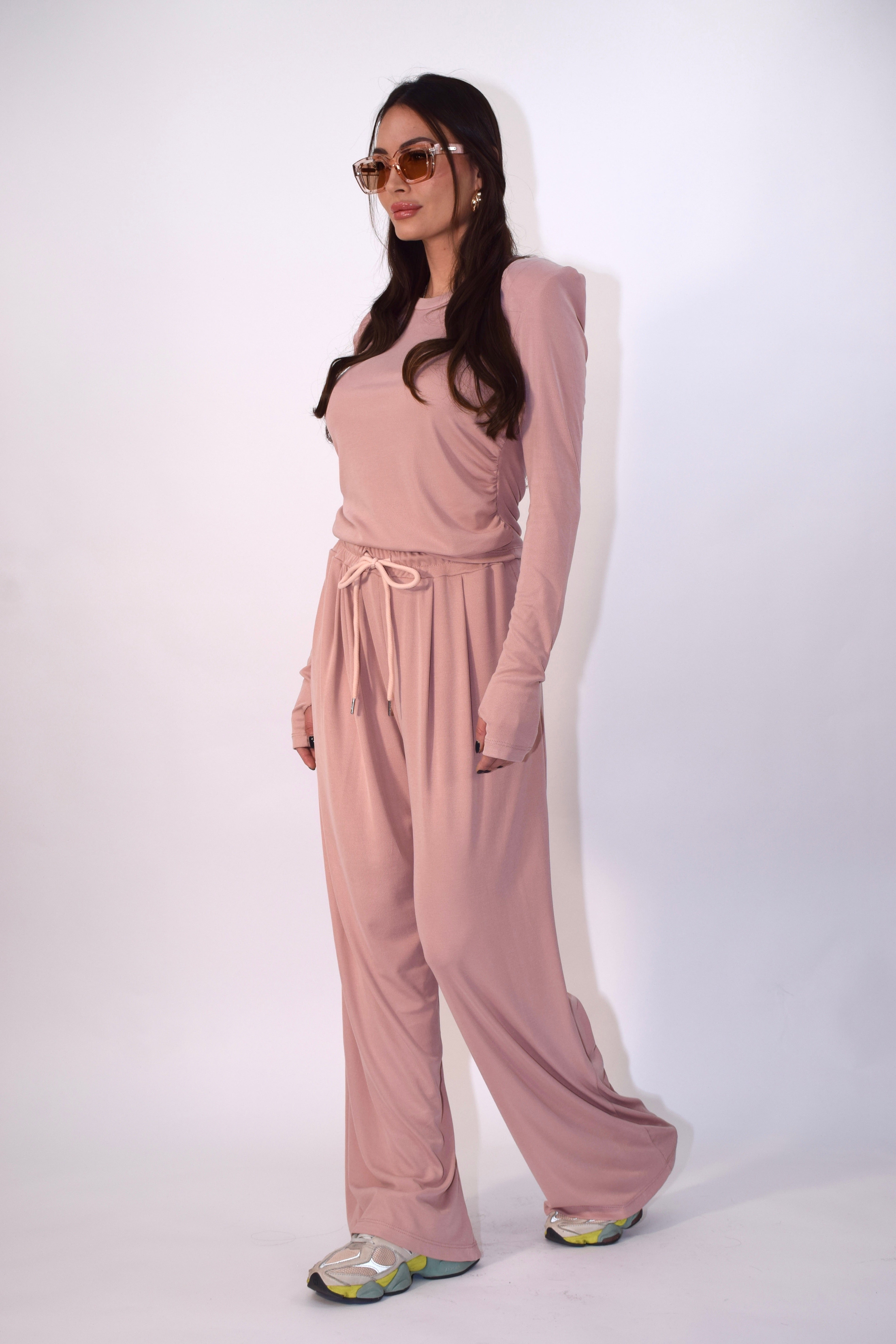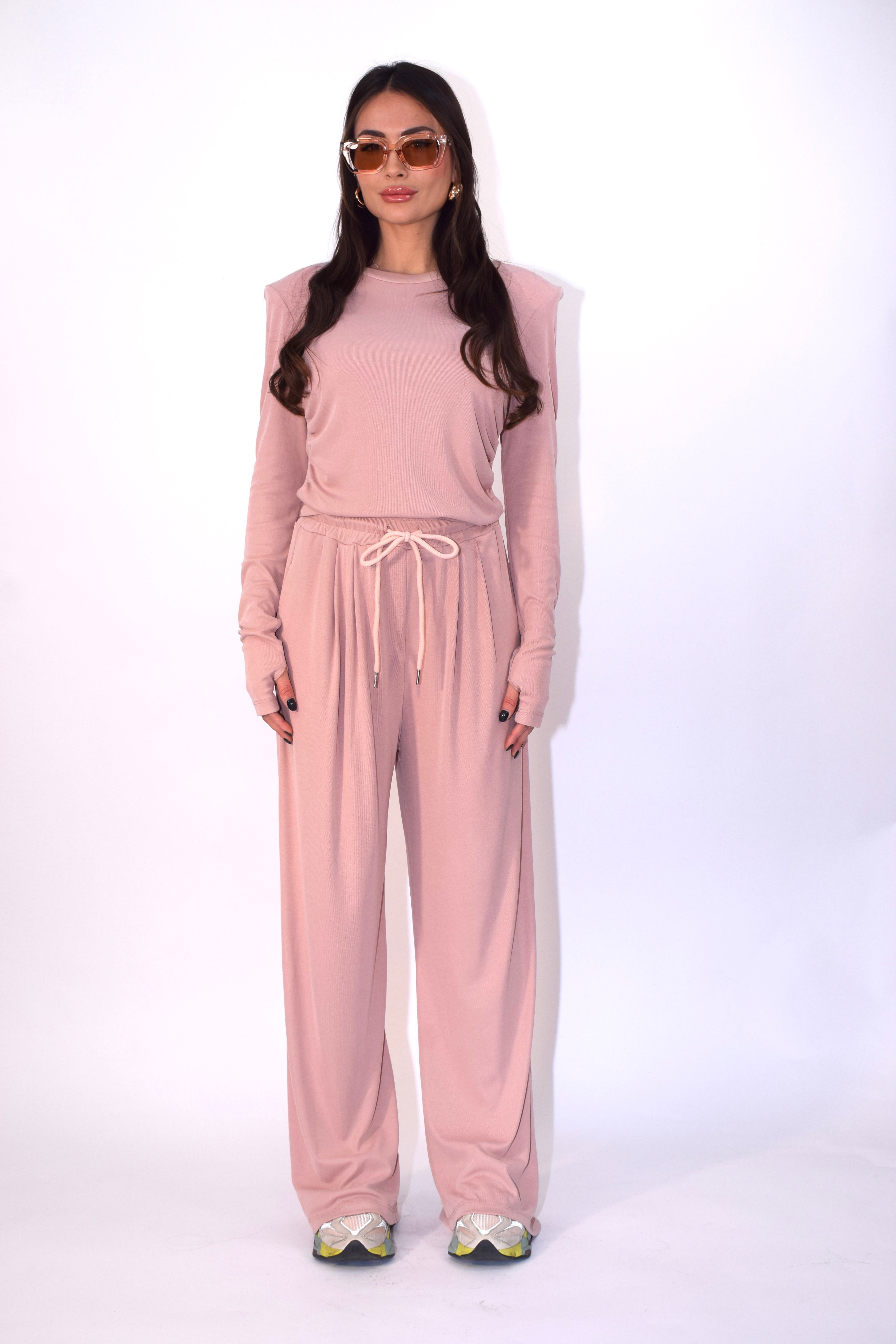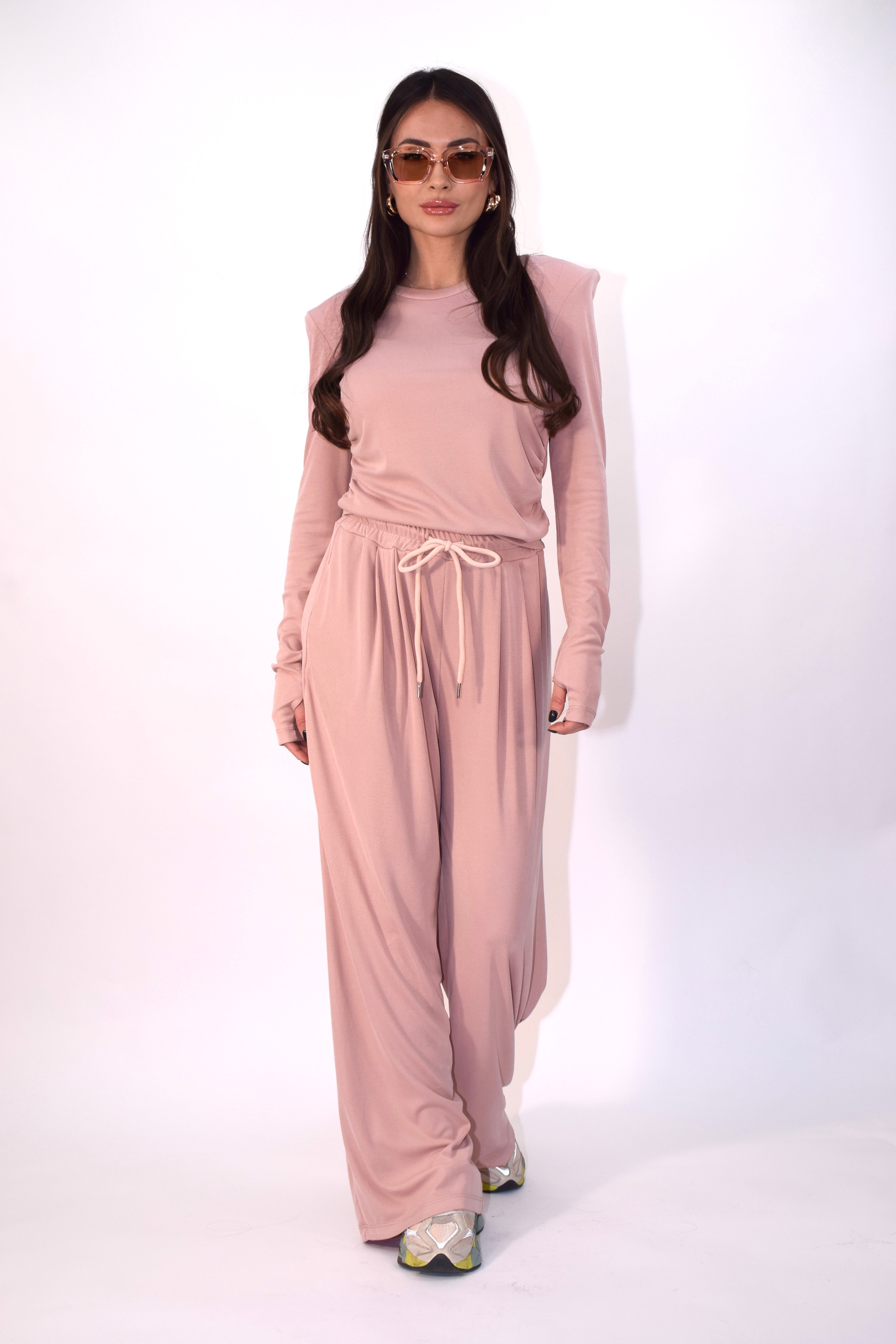 Coordinato elasticizzato composto da t-shirt con spalline e manica a giunto. Pantalone ampio a palazzo con coulisse in vita per una vestibilità regolabile e confortevole. Modello taglia unica.