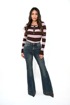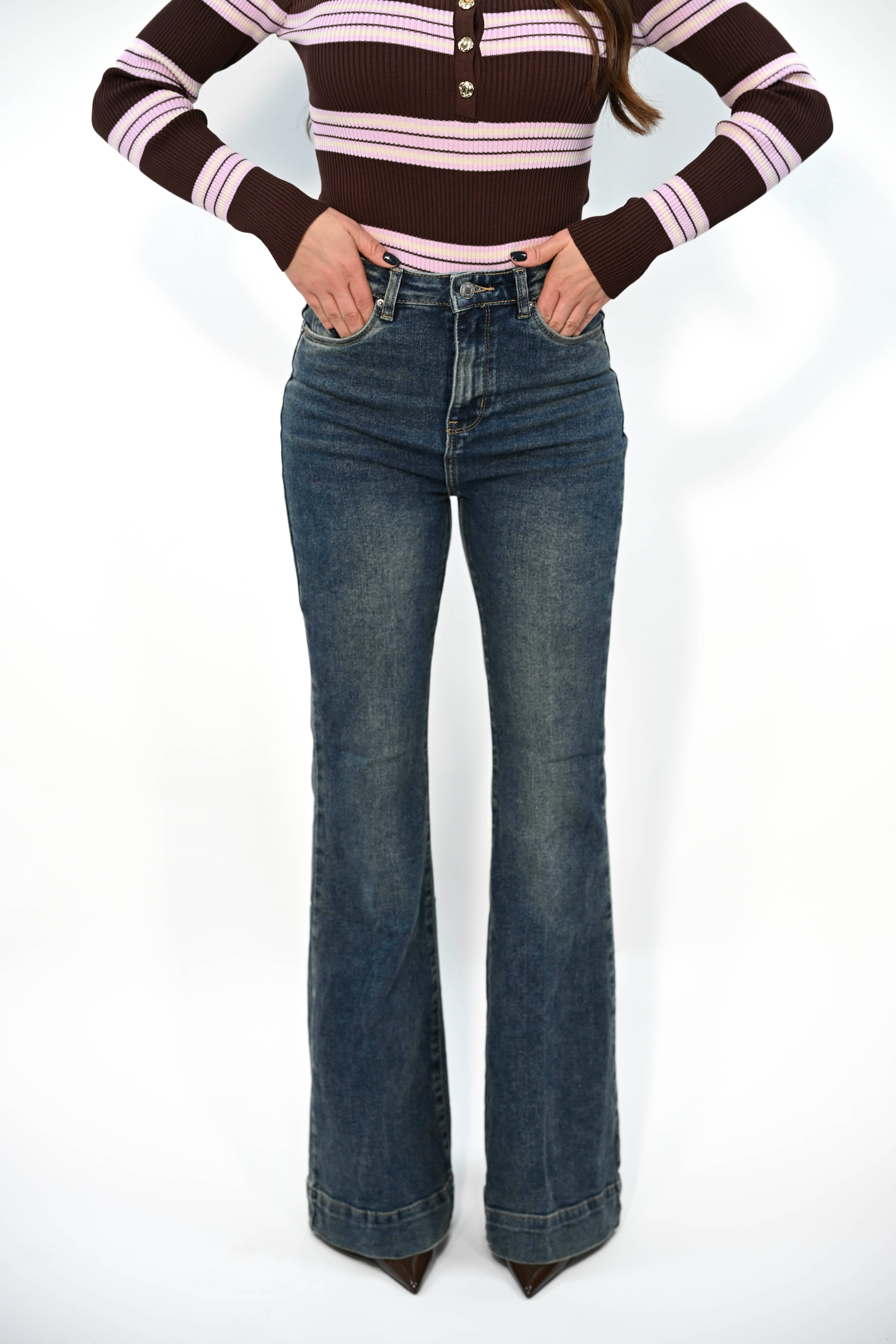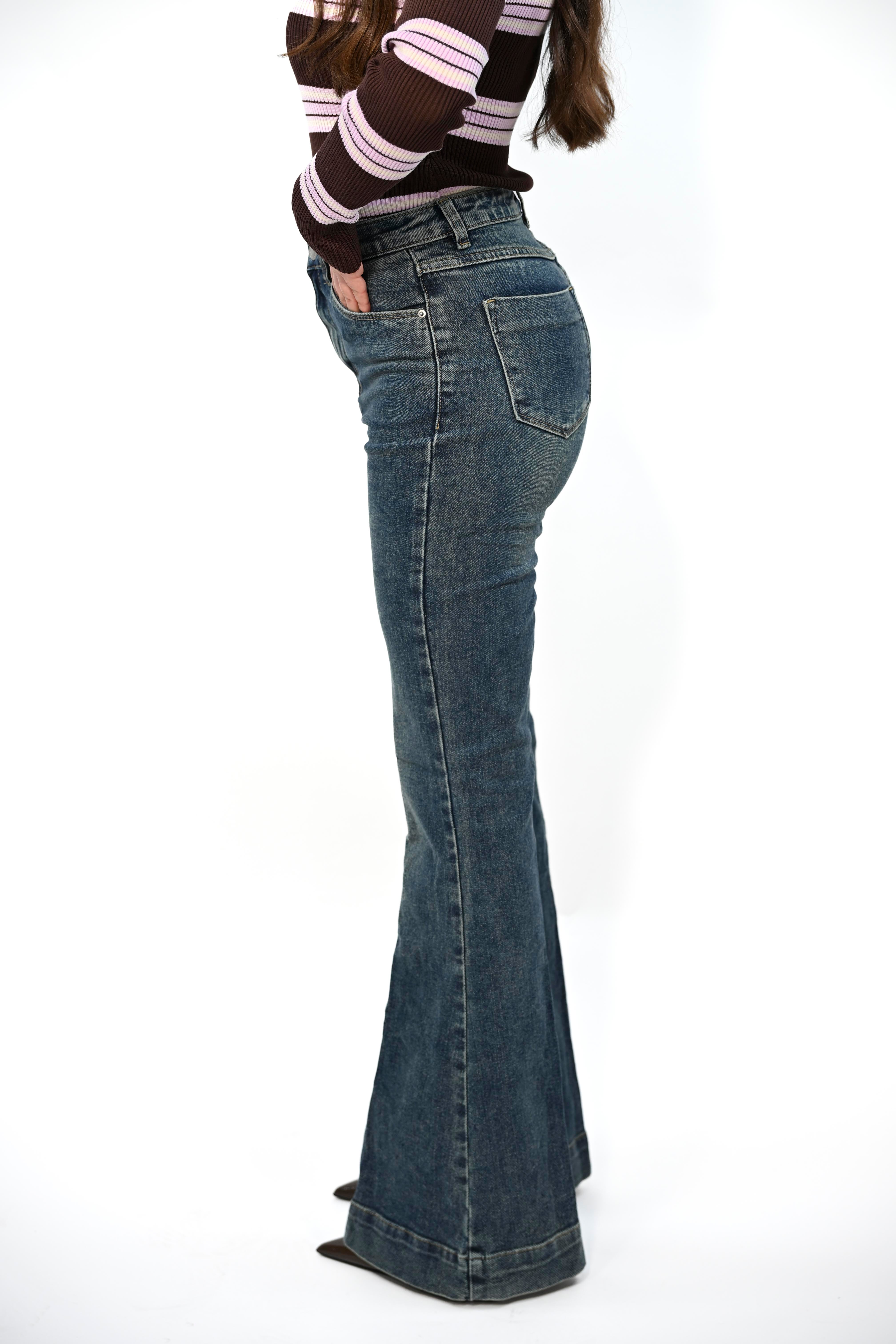 Jeans a zampa a vita media in denim elasticizzato. Vestibilità confortevole che valorizza la silhouette, perfetto per look quotidiani o outfit più ricercati. Un capo versatile da abbinare facilmente in ogni stagione.