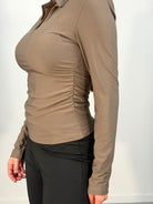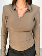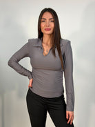 T-shirt in lycra super elasticizzata con colletto e scollo a V, arricchita da drappeggi laterali. Vestibilità confortevole. Taglia unica.