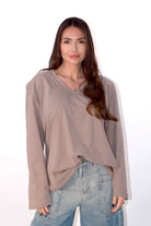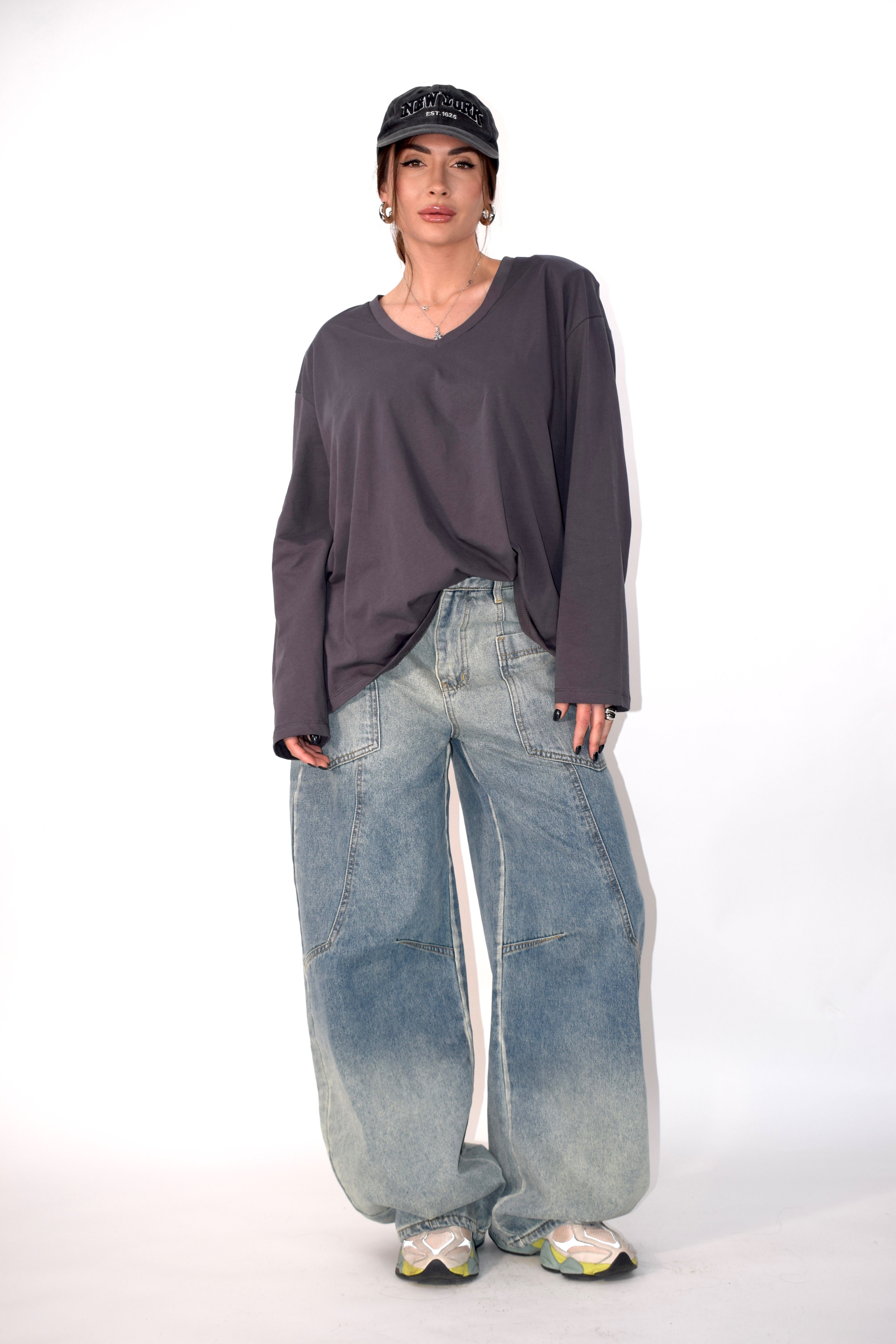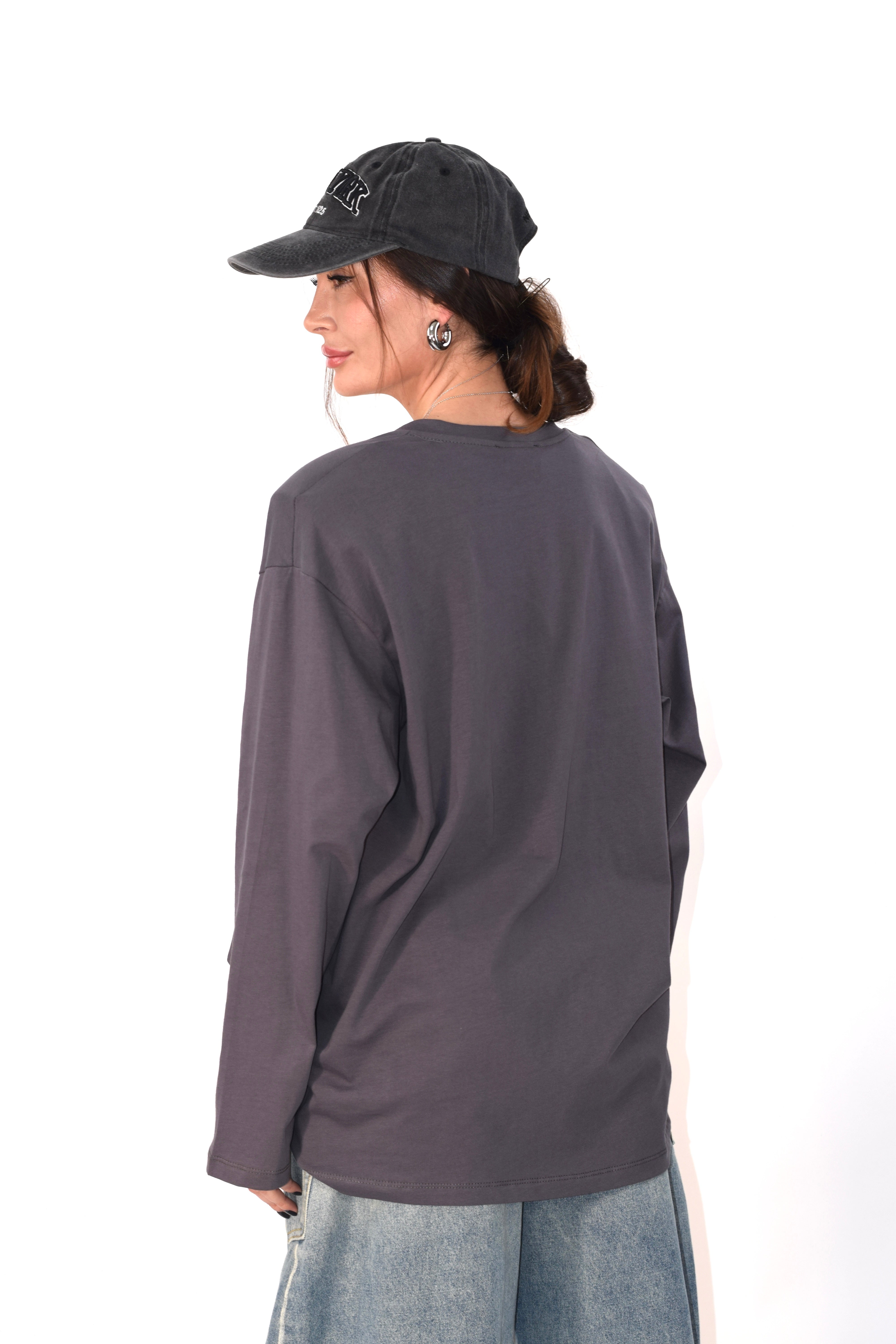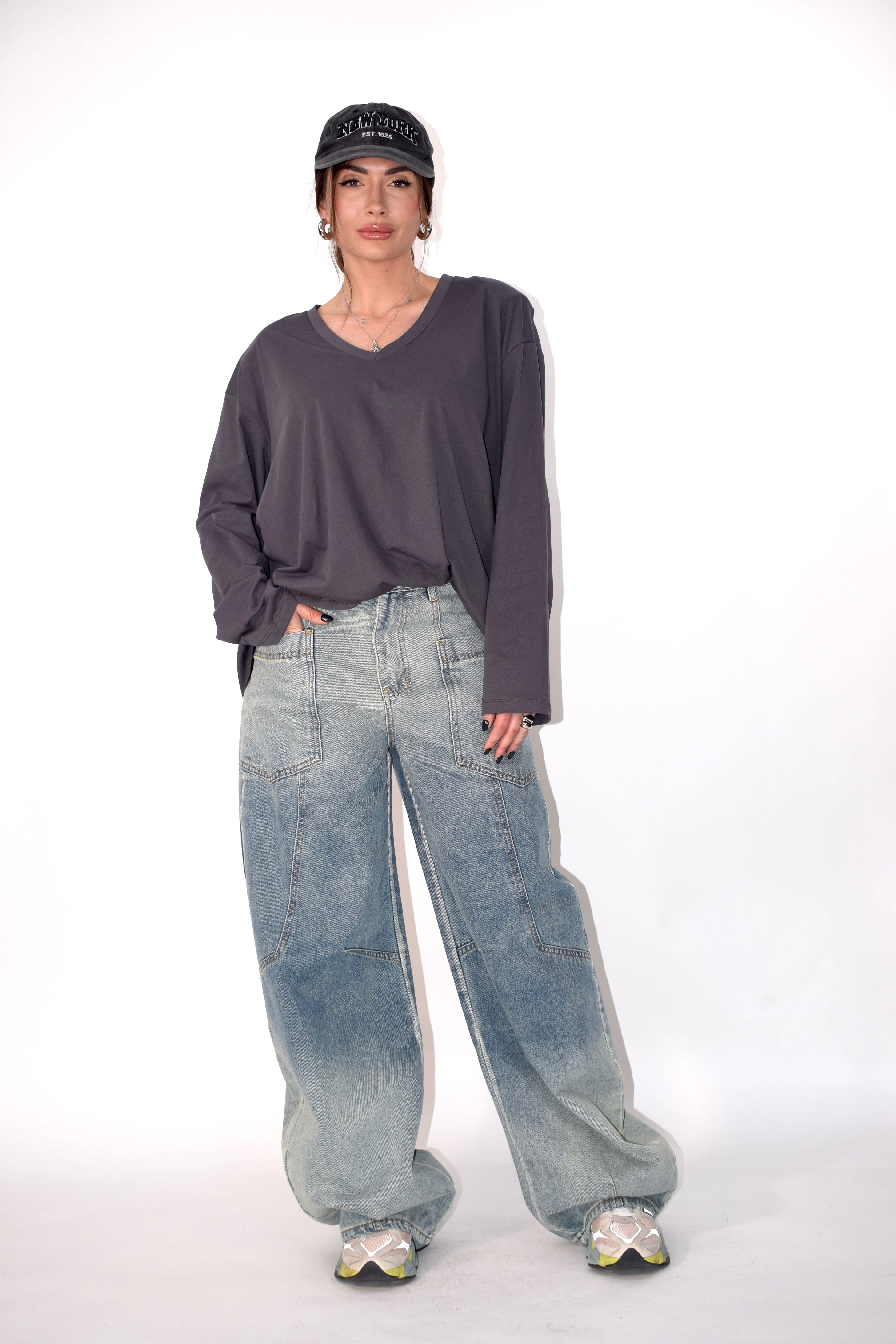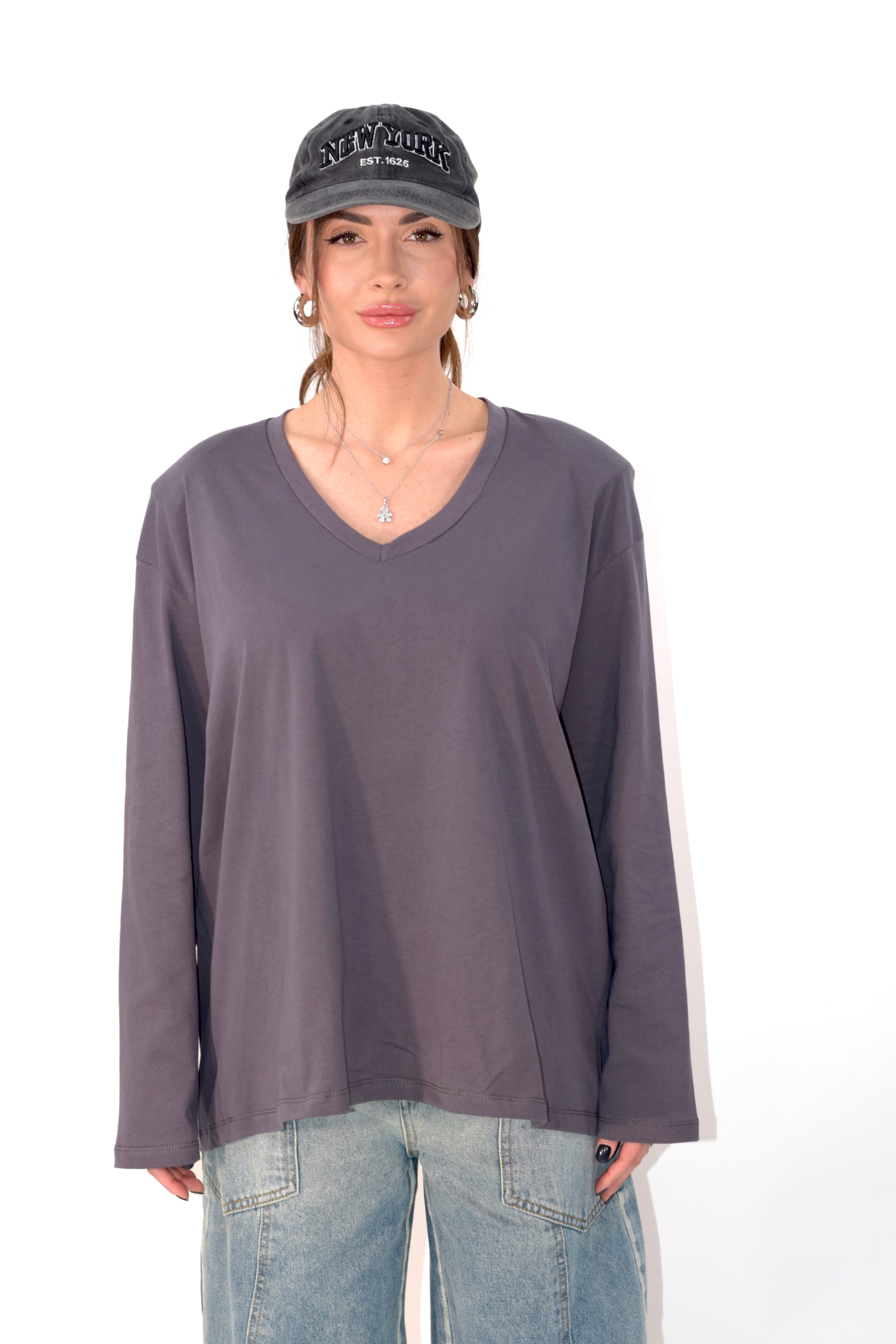 T-shirt con scollo a V, manica lunga e spalline imbottite 100% cotone. Linea oversize dal gusto contemporaneo, confortevole e versatile. Modello taglia unica.