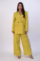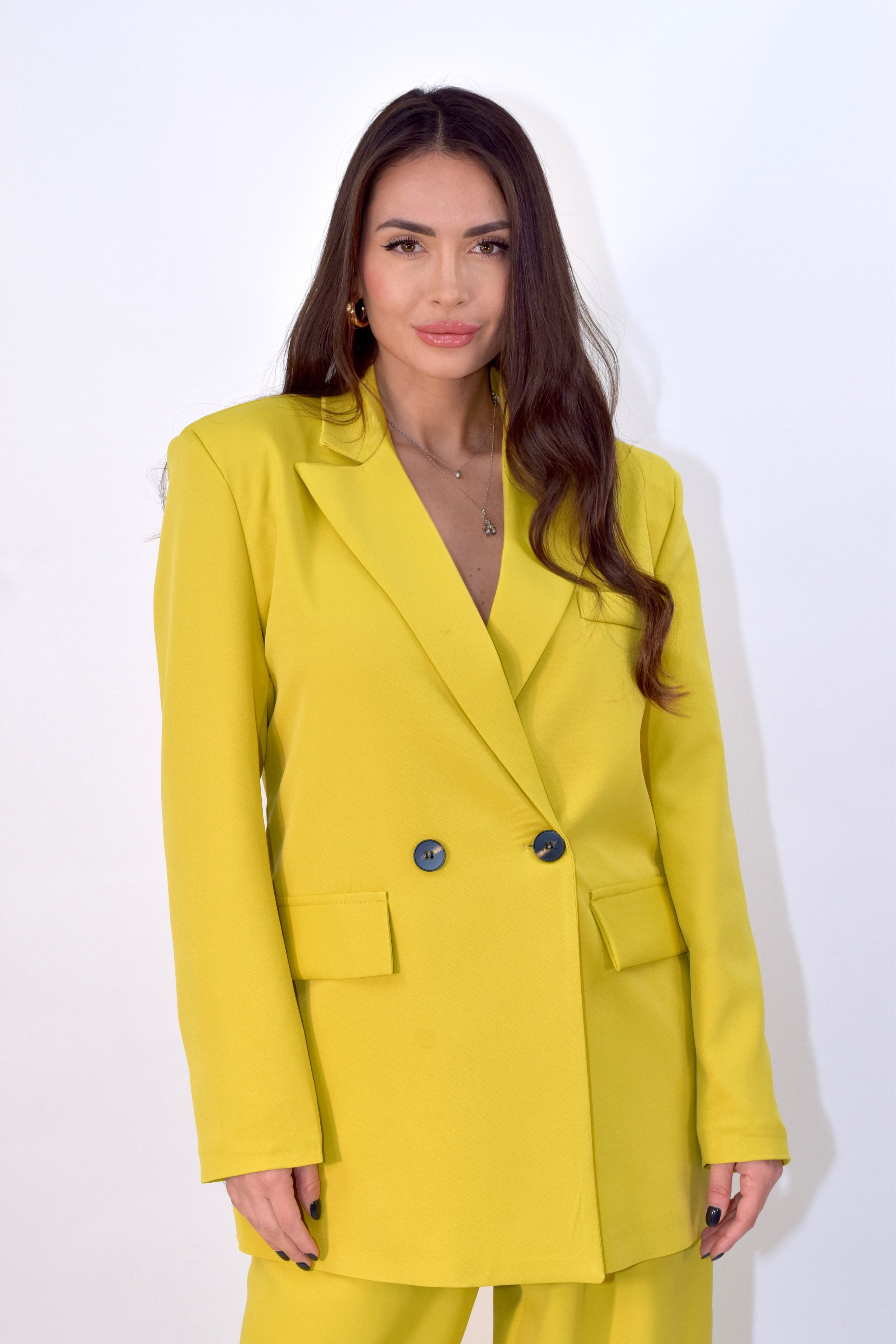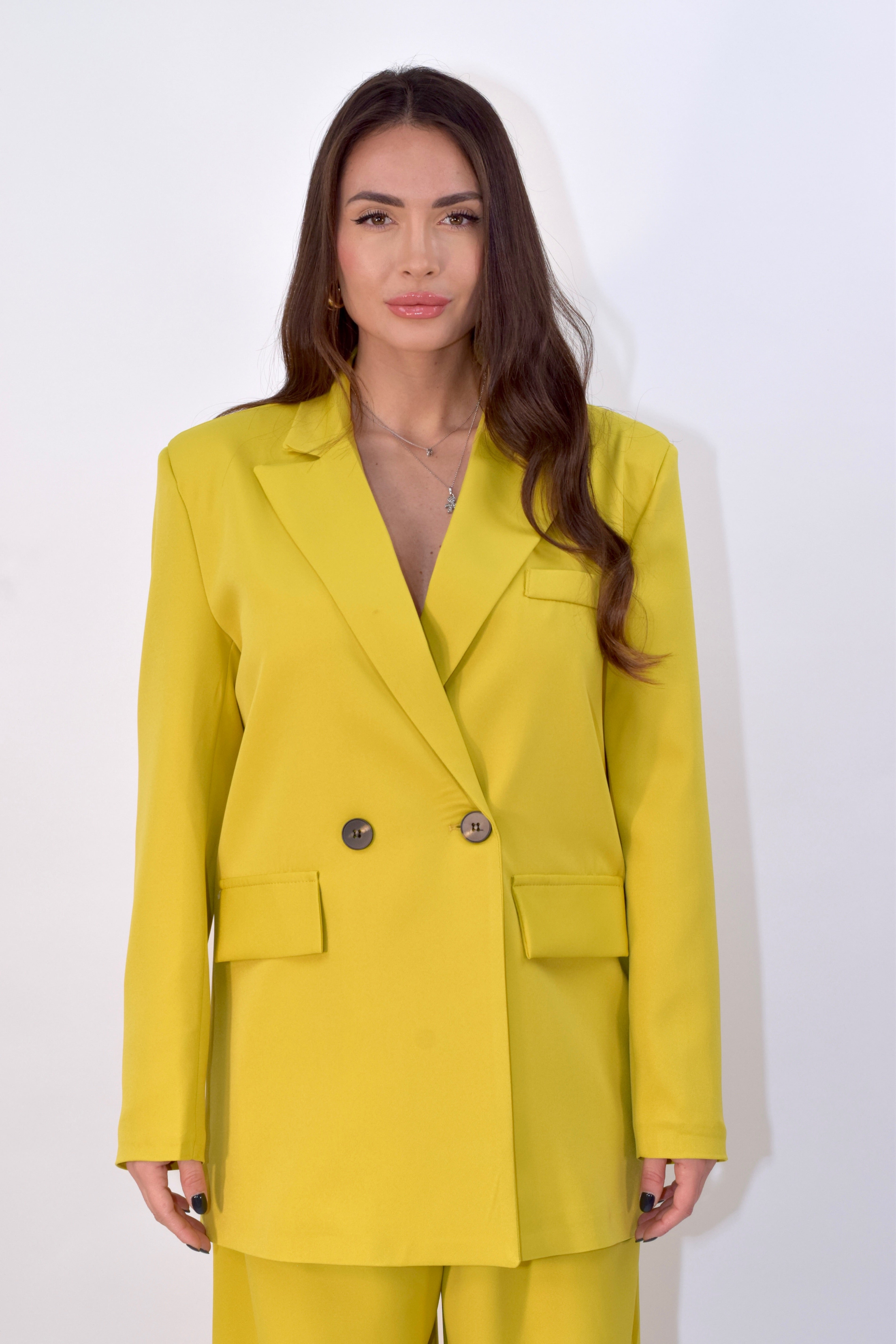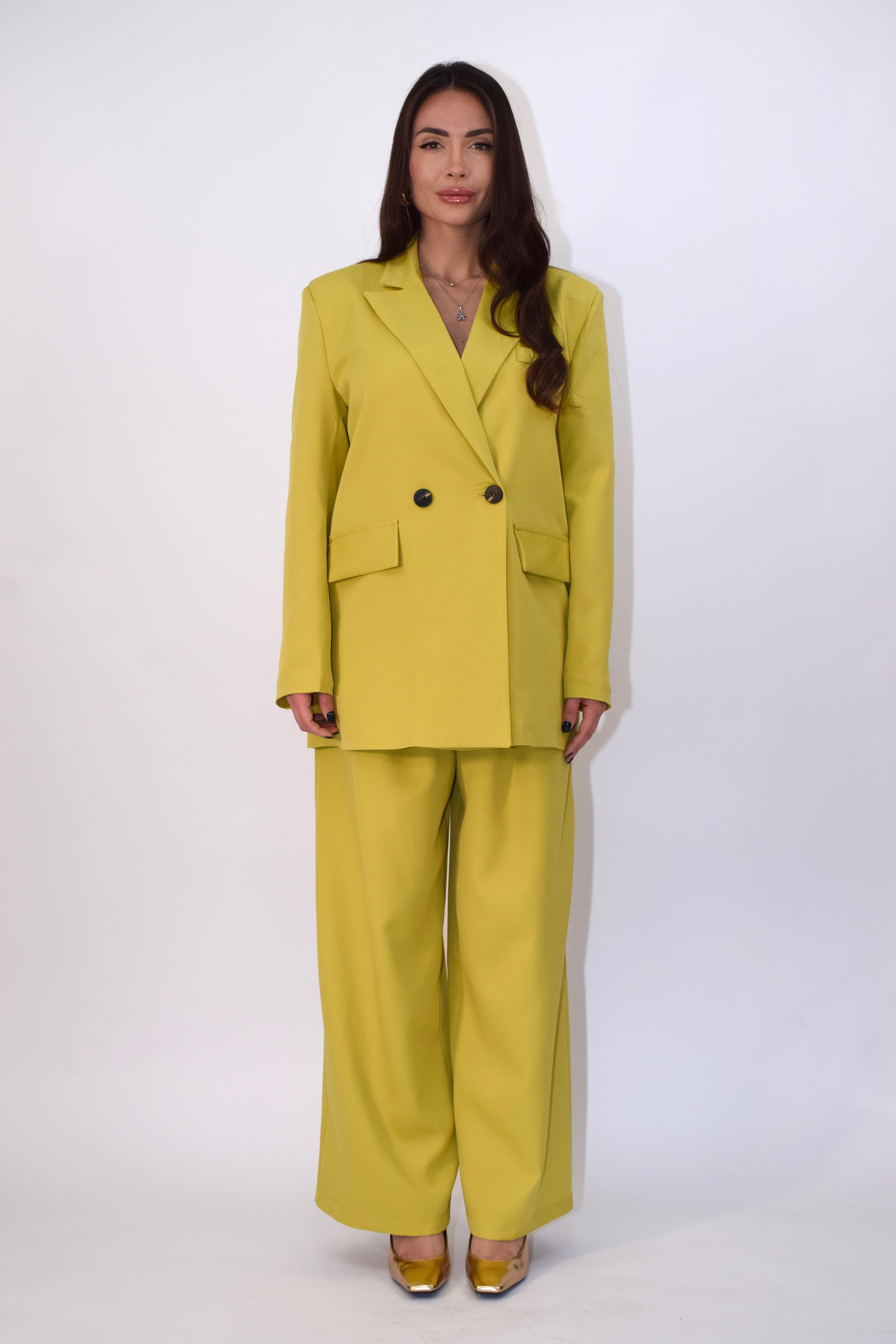 Tailleur due pezzi composto da giacca con chiusura doppiopetto e spalline imbottite. Pantalone ampio e fluido con zip frontale e cintura incorporata. Modello taglia unica.