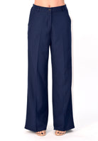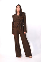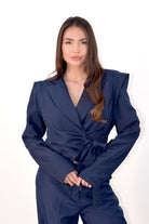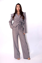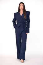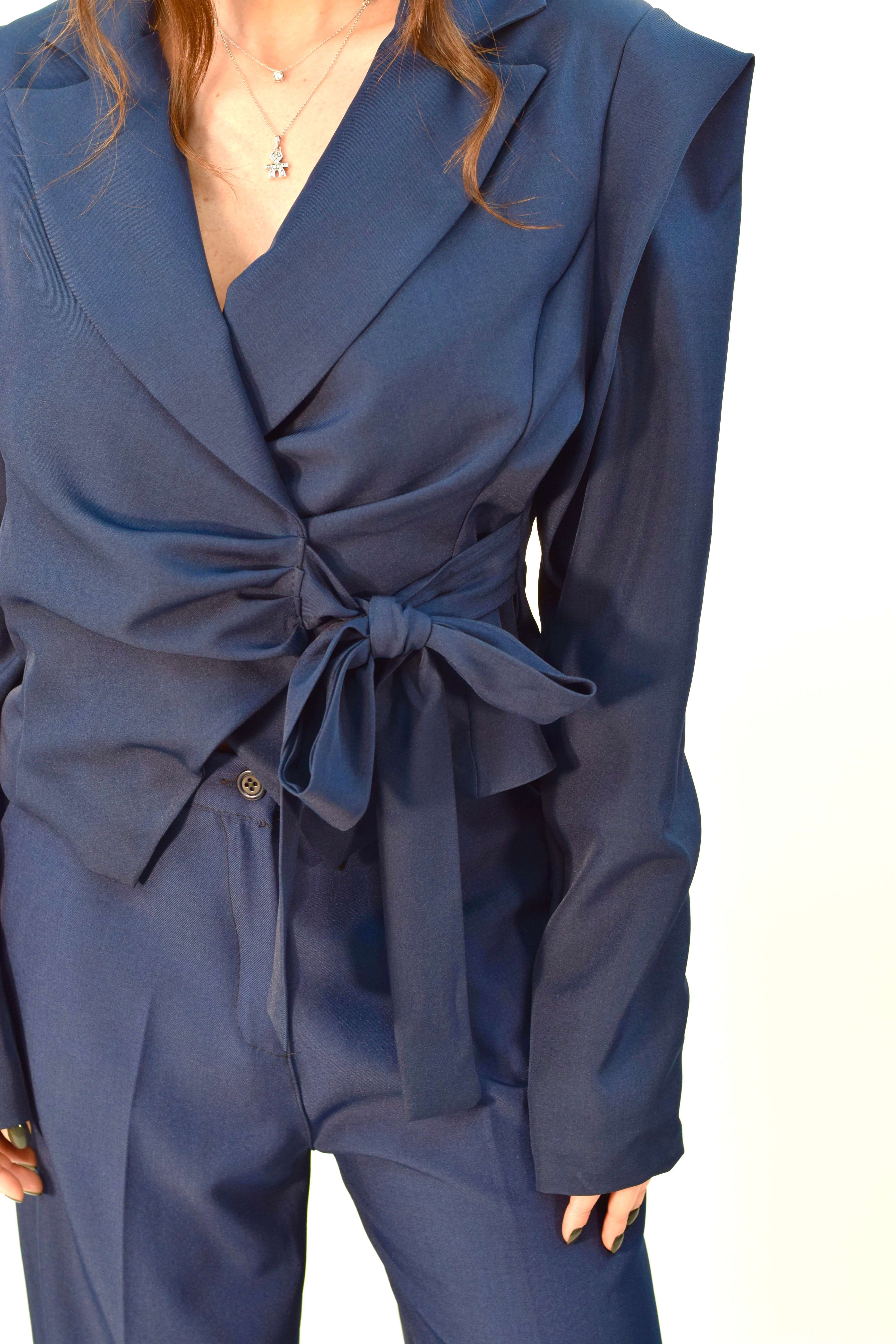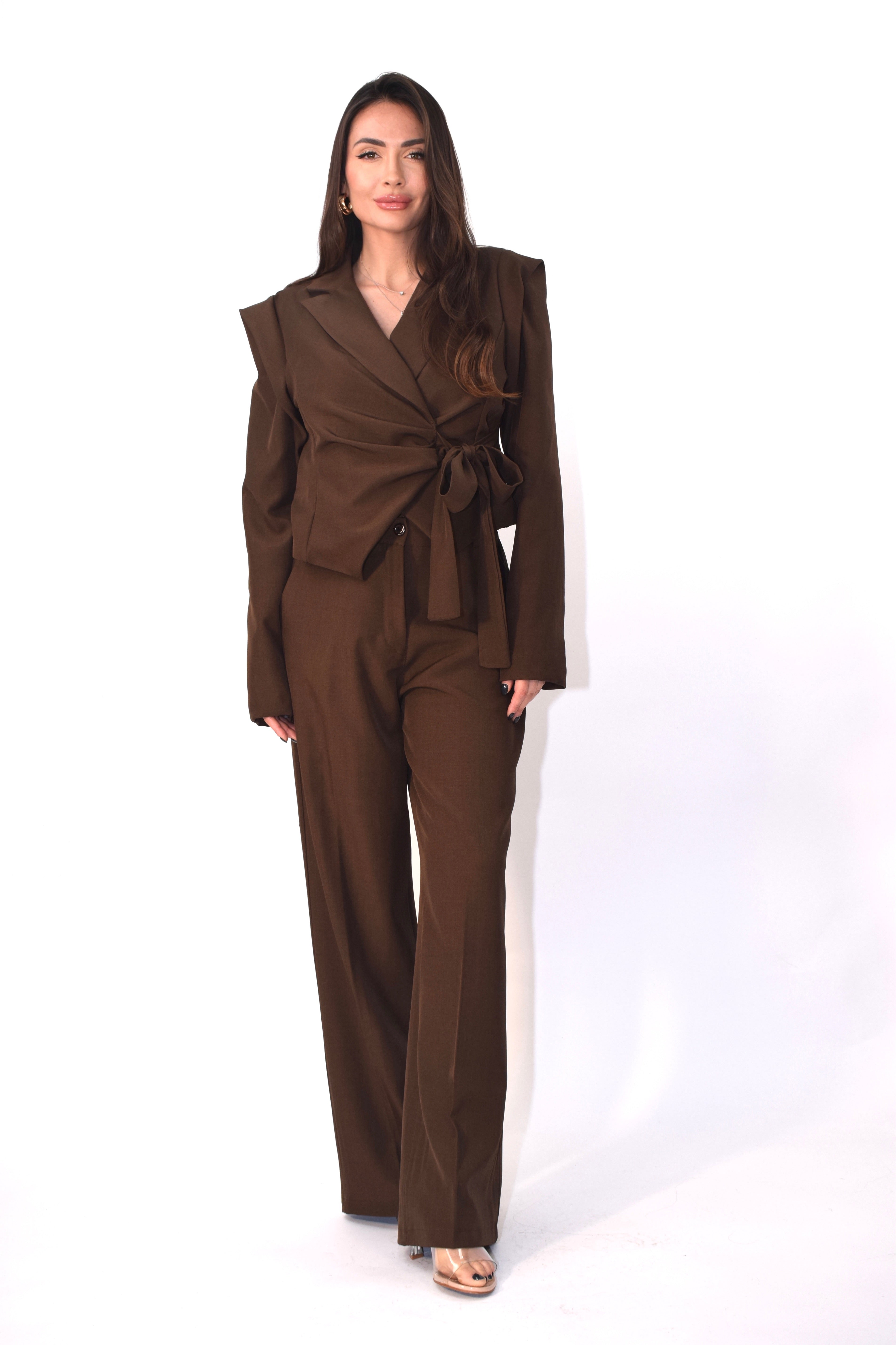 Tailleur due pezzi composto da camicina con nodo laterale e spalline ampie non imbottite. Pantalone ampio a palazzo con elastico sul retro per una vestibilità confortevole. Modello taglia unica