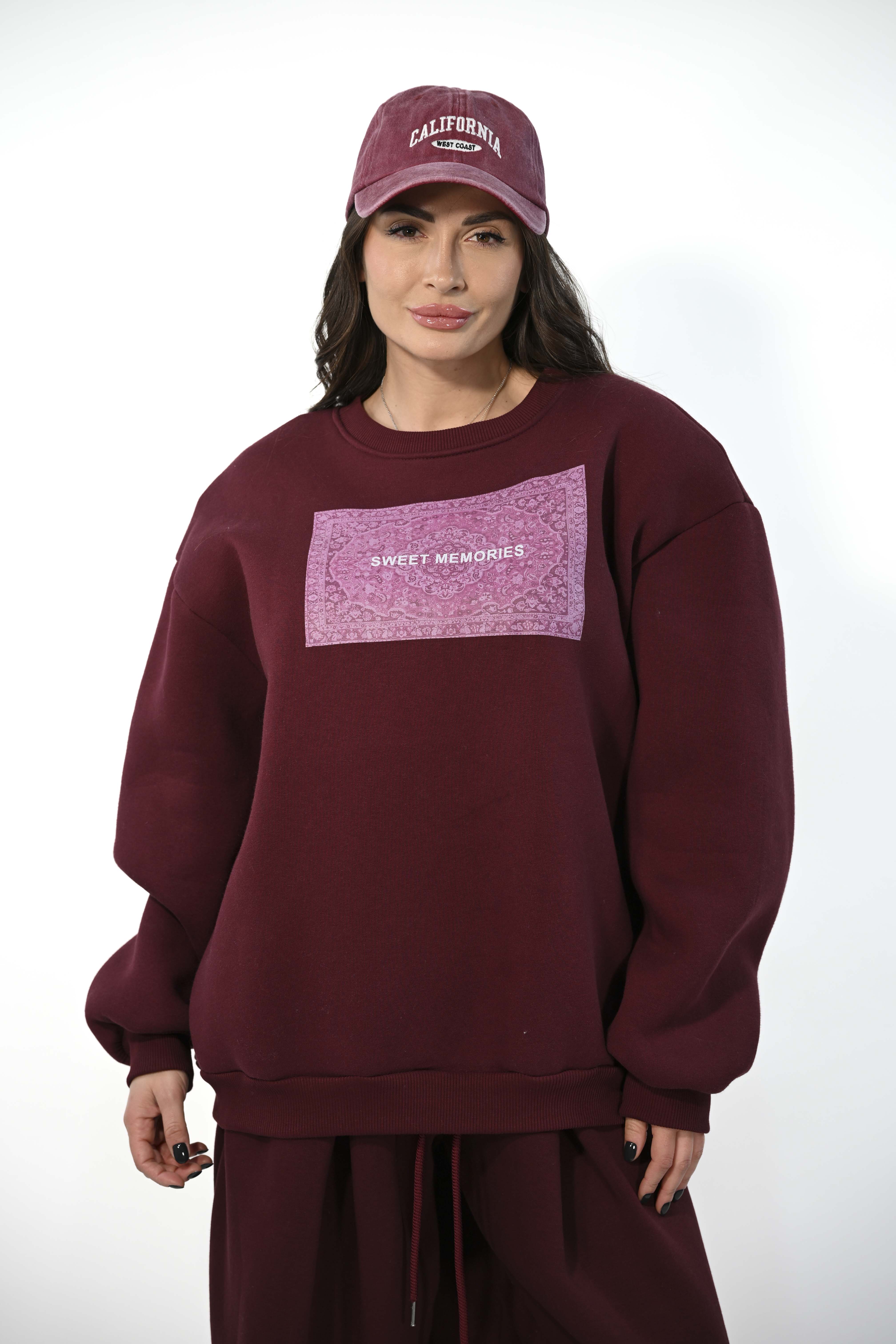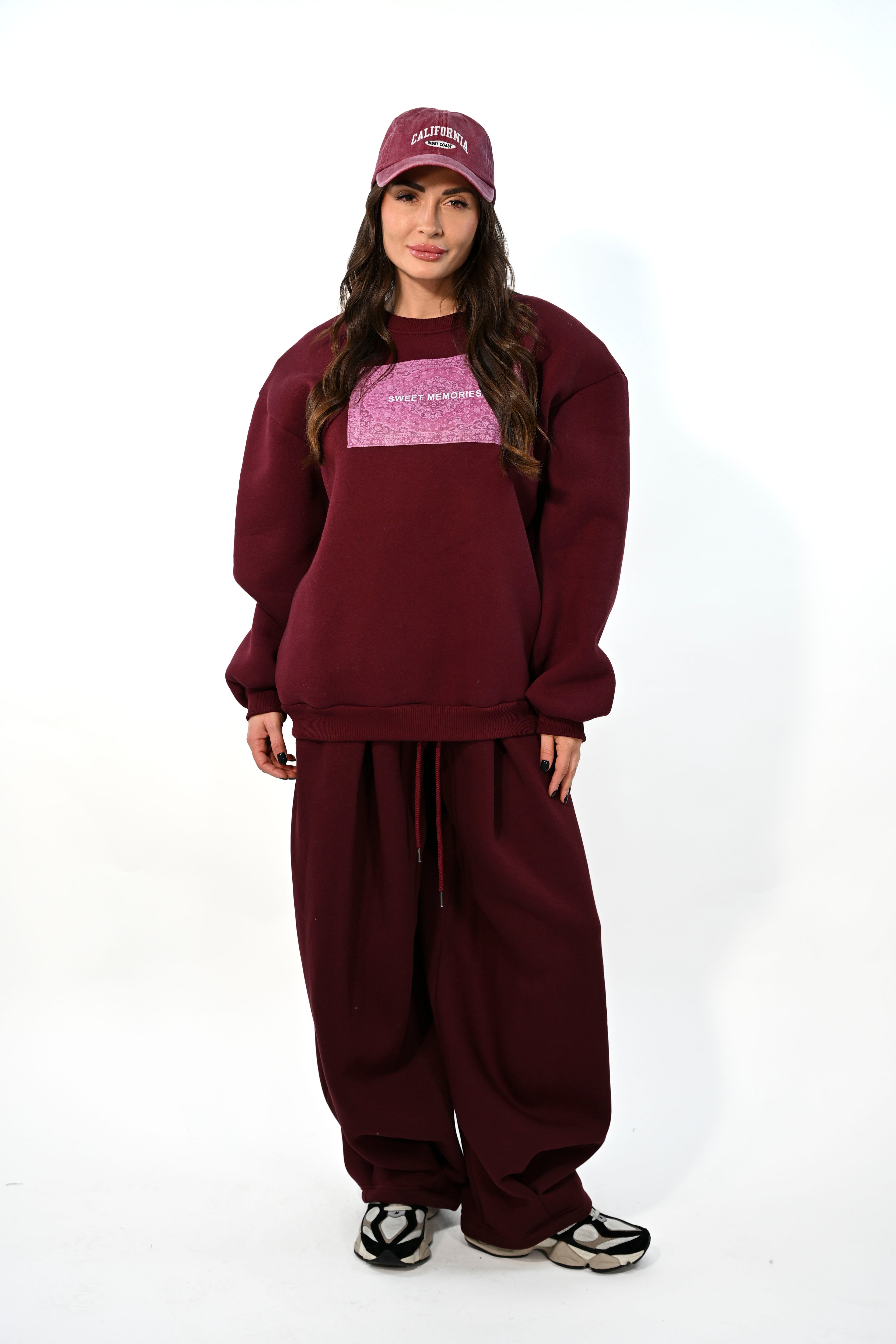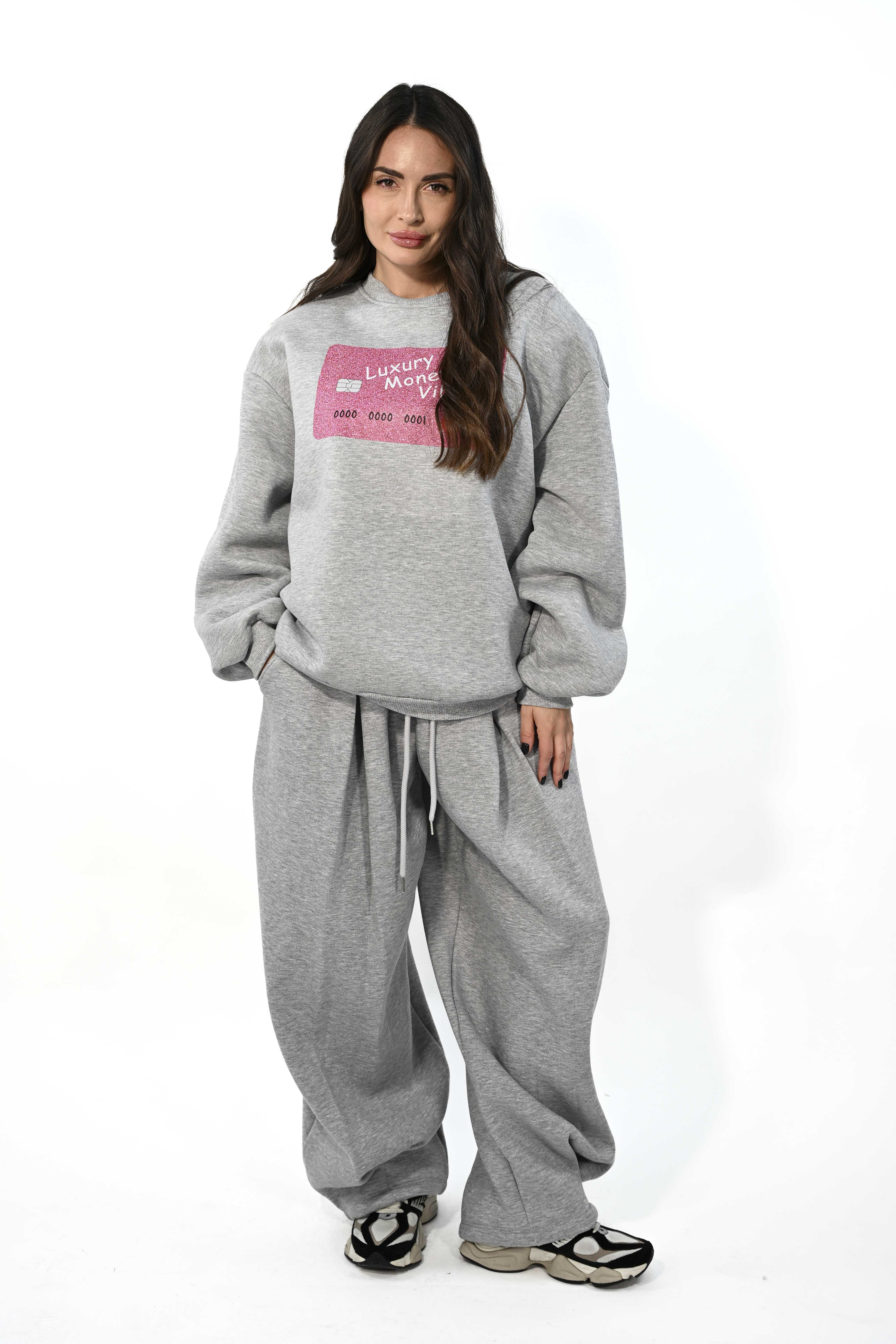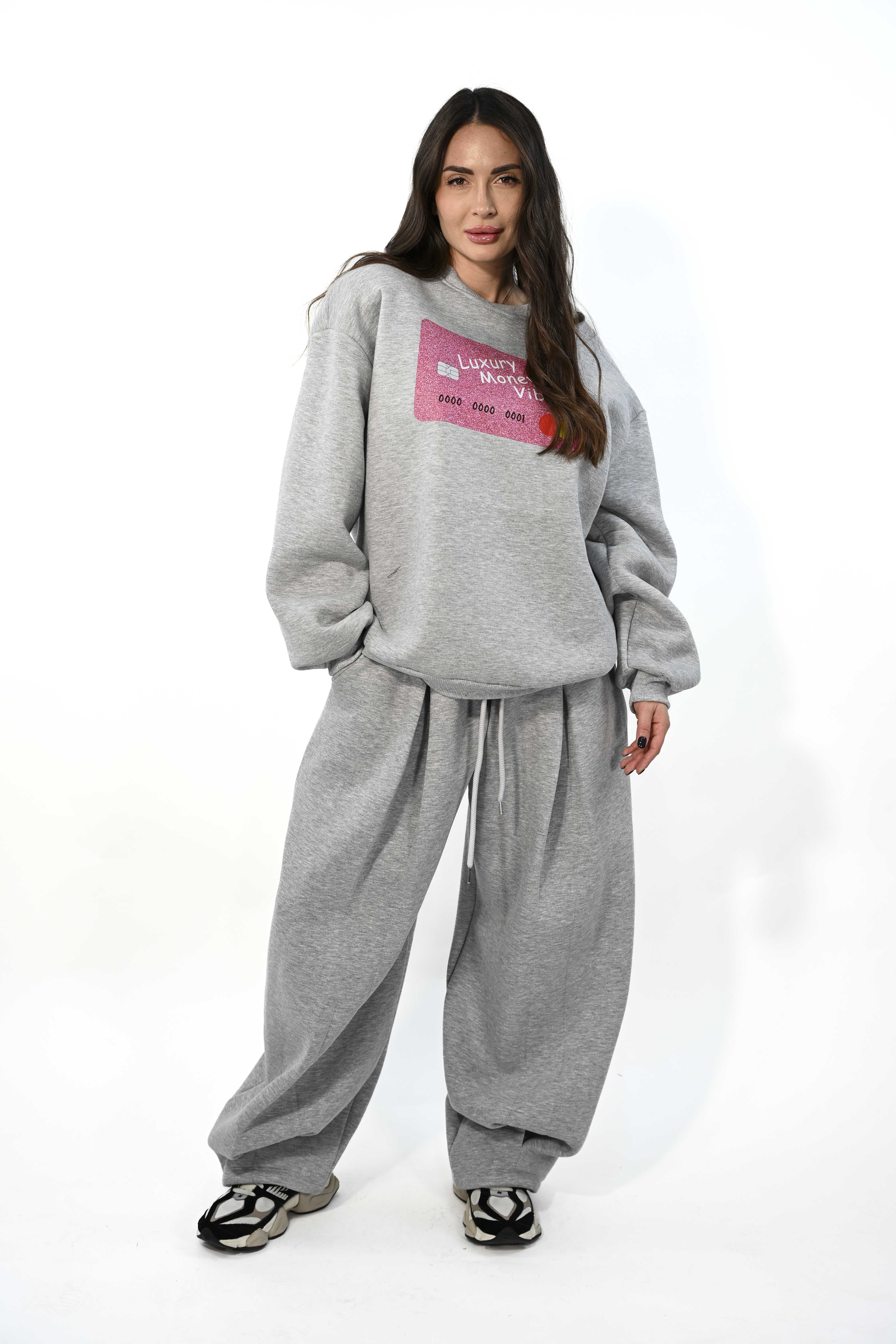 Tuta due pezzi in felpa, morbida e felpata internamente. Felpa girocollo con stampa frontale e pantalone balloon con coulisse in vita regolabile per una vestibilità comoda. Taglia unica, perfetta per un look casual e super confortevole.