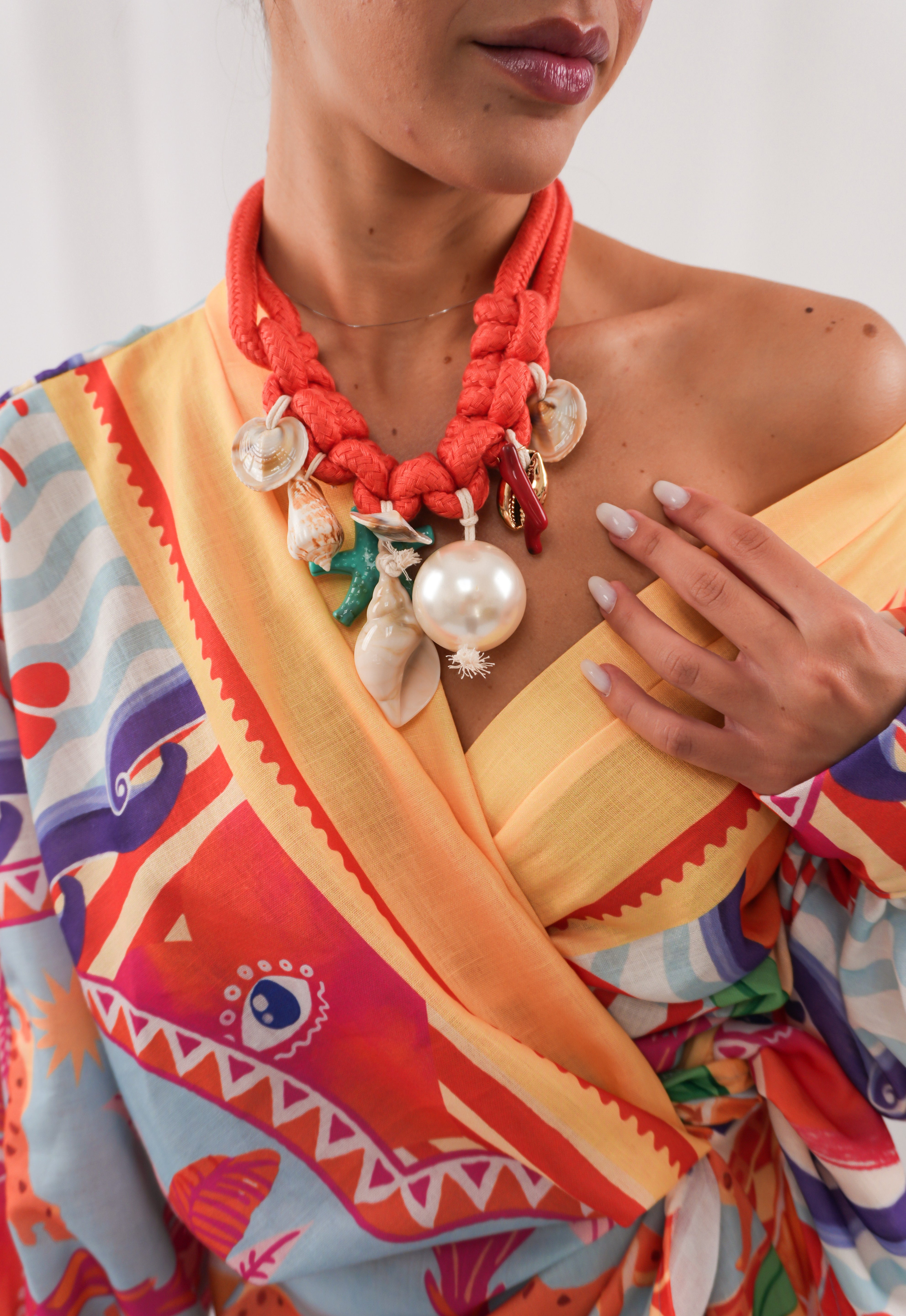 Collana con motivi marini in stile balneare, impreziosita da elementi ispirati al mare come conchiglie e perle e pietre naturali. Perfetta per aggiungere un tocco estivo e raffinato ai tuoi look da spiaggia o aperitivi al tramonto.
