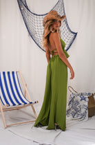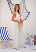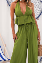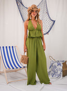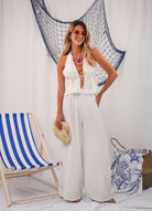 Co-ord 2 pezzi in taglia unica, realizzato in tessuto ultra leggero e traspirante. Composto da top con allaccio sul retro e pantalone ampio a zampa con coulisse ed elastico regolabile in vita per una vestibilità comoda e personalizzata. Perfetto per look estivi freschi e versatili.