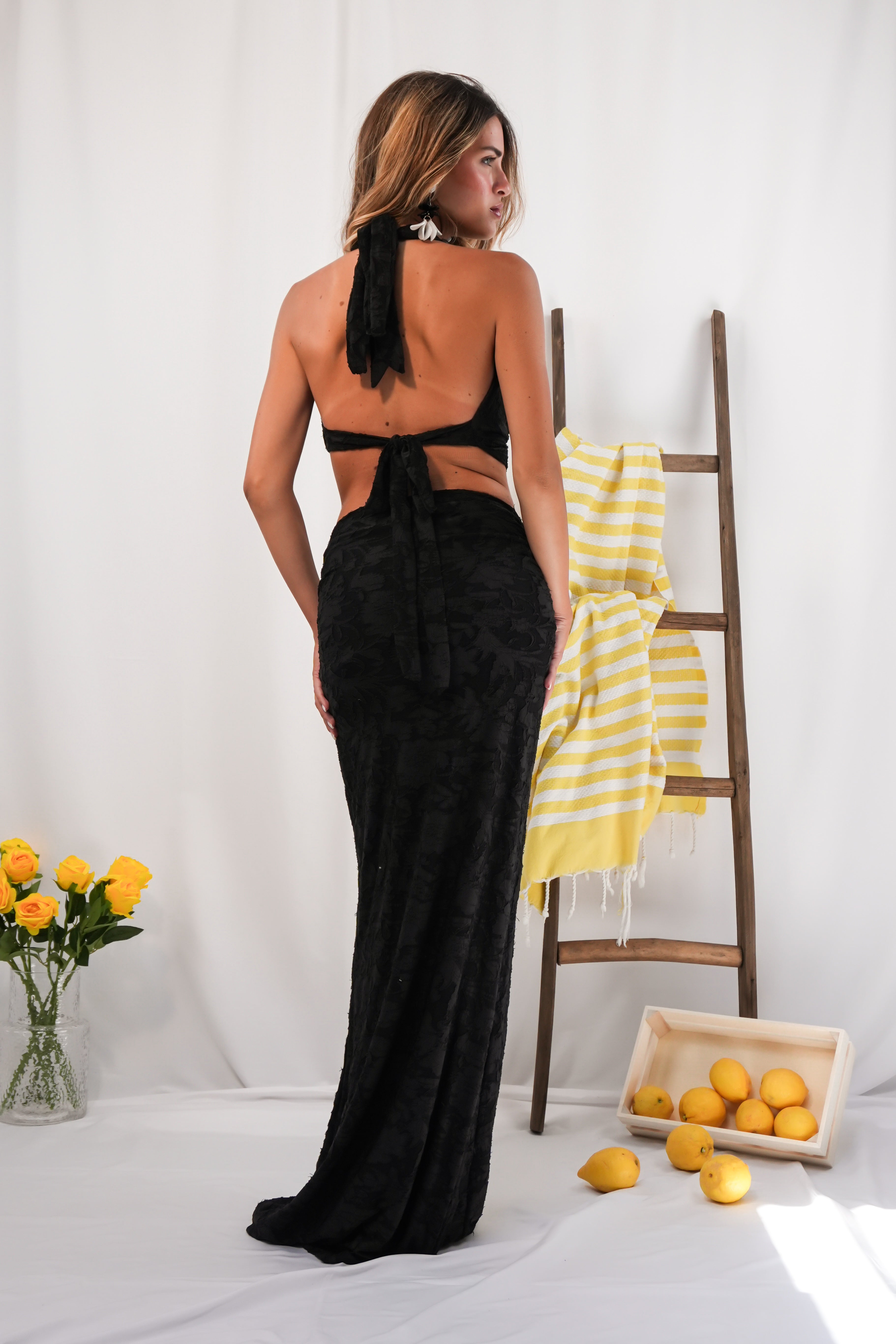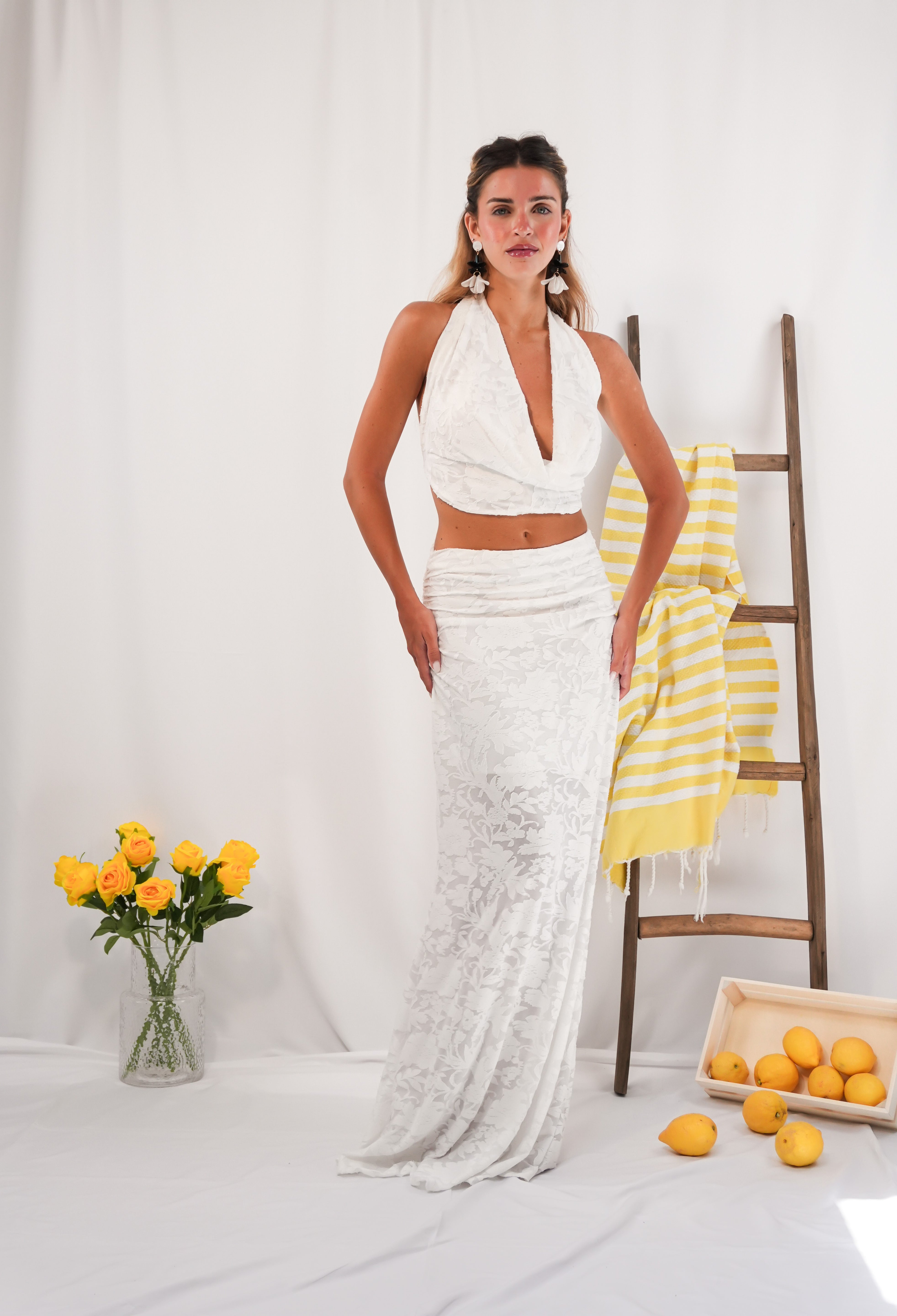 Coordset due pezzi in pizzo elasticizzato taglia unica, composto da top crop con profondo scollo frontale e chiusura regolabile annodata sul retro, abbinato a una gonna lunga. Un look femminile, sensuale e versatile, perfetto per serate estive o occasioni speciali.