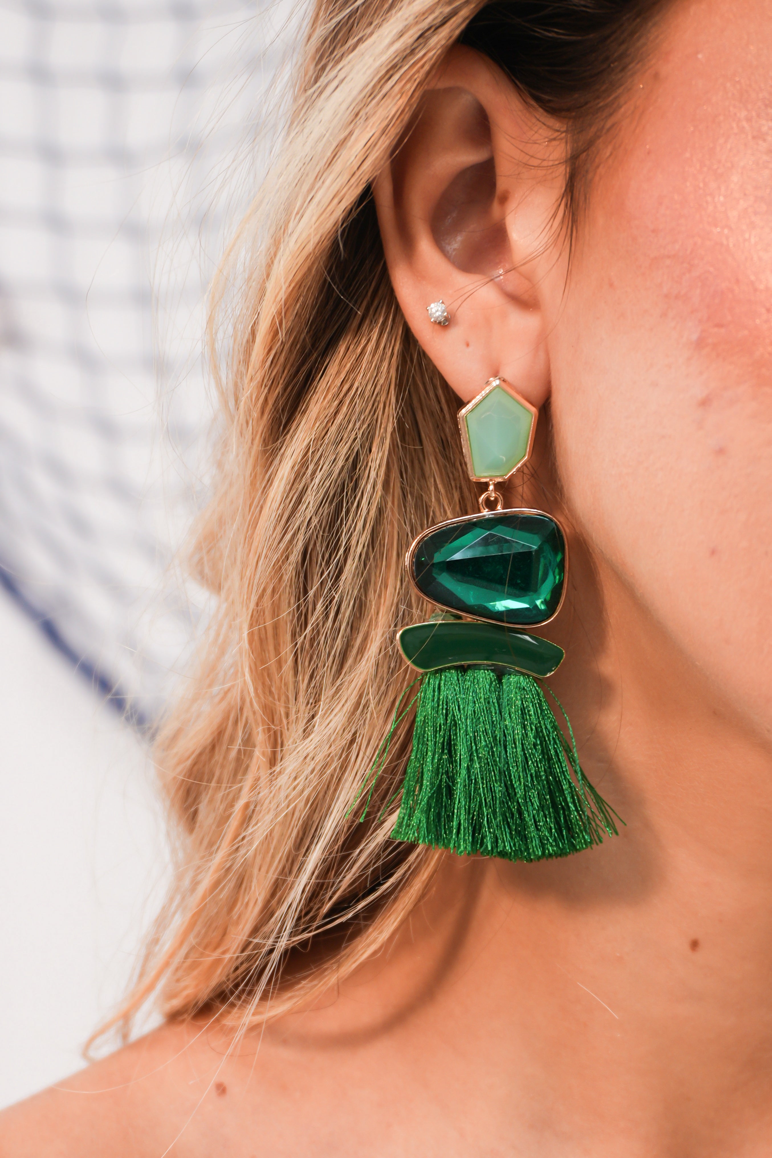Orecchini eleganti con dettaglio gioiello e nappine pendenti verde, perfetti per aggiungere un tocco chic e sofisticato a look da sera o eventi speciali.