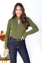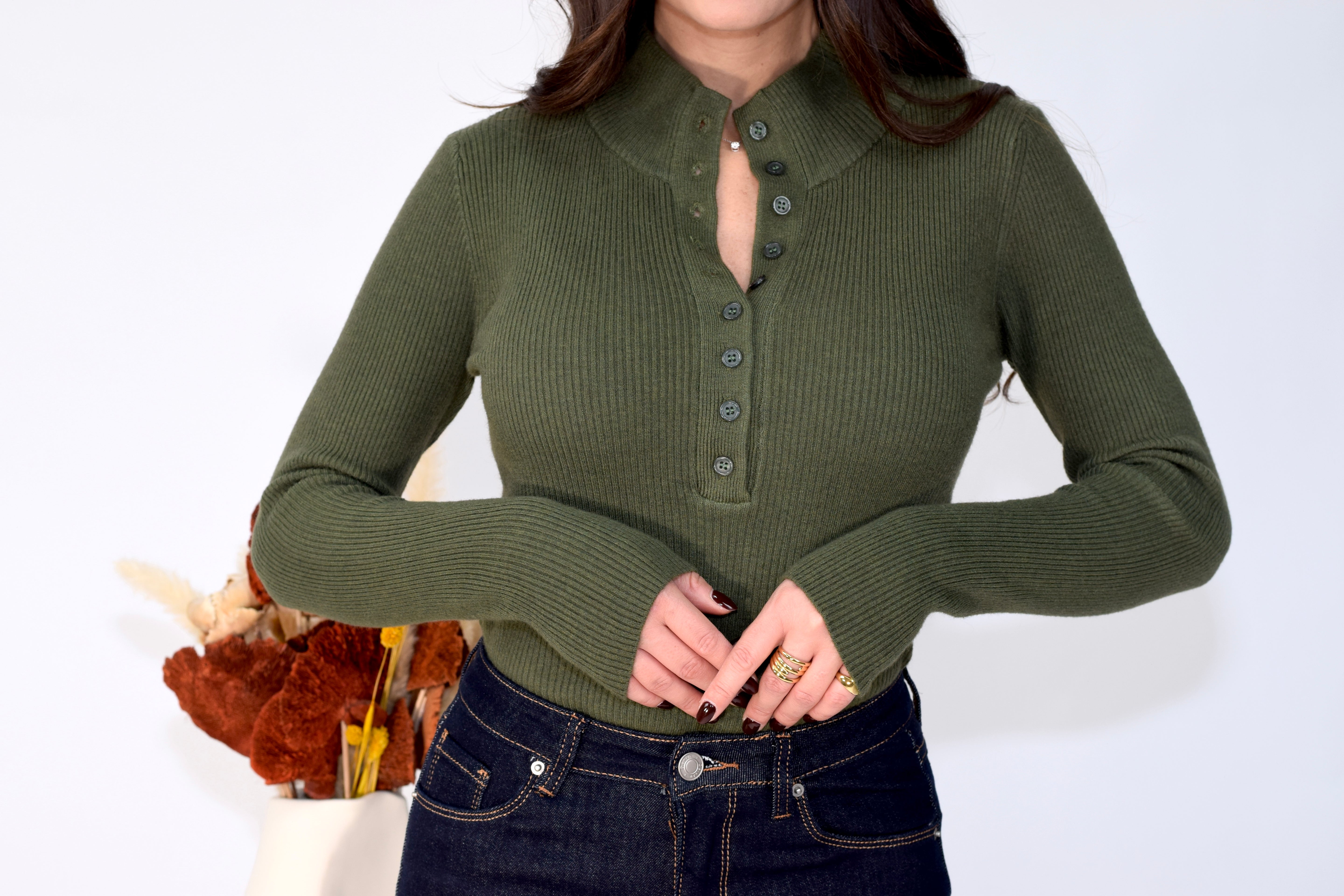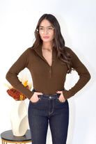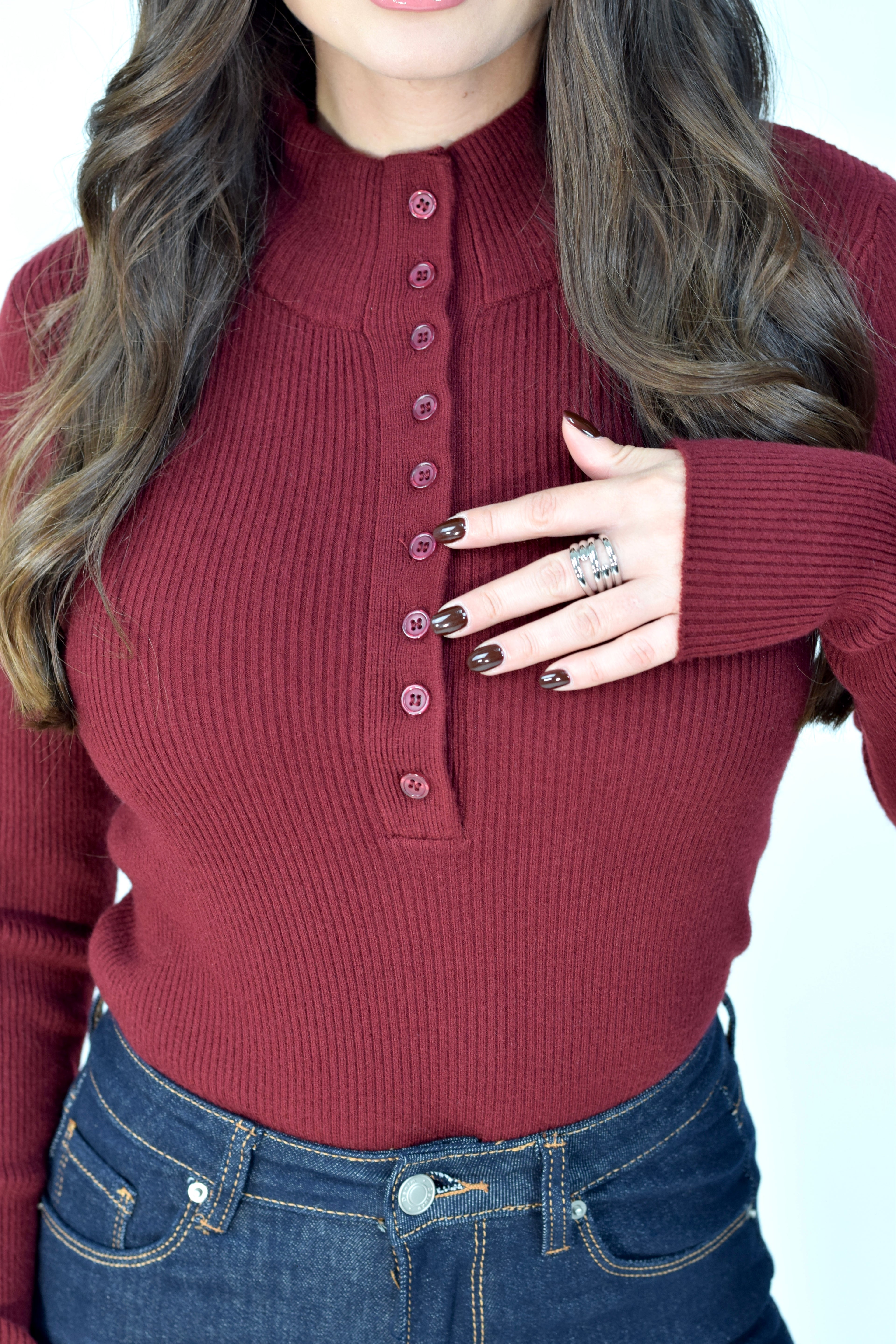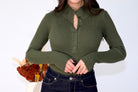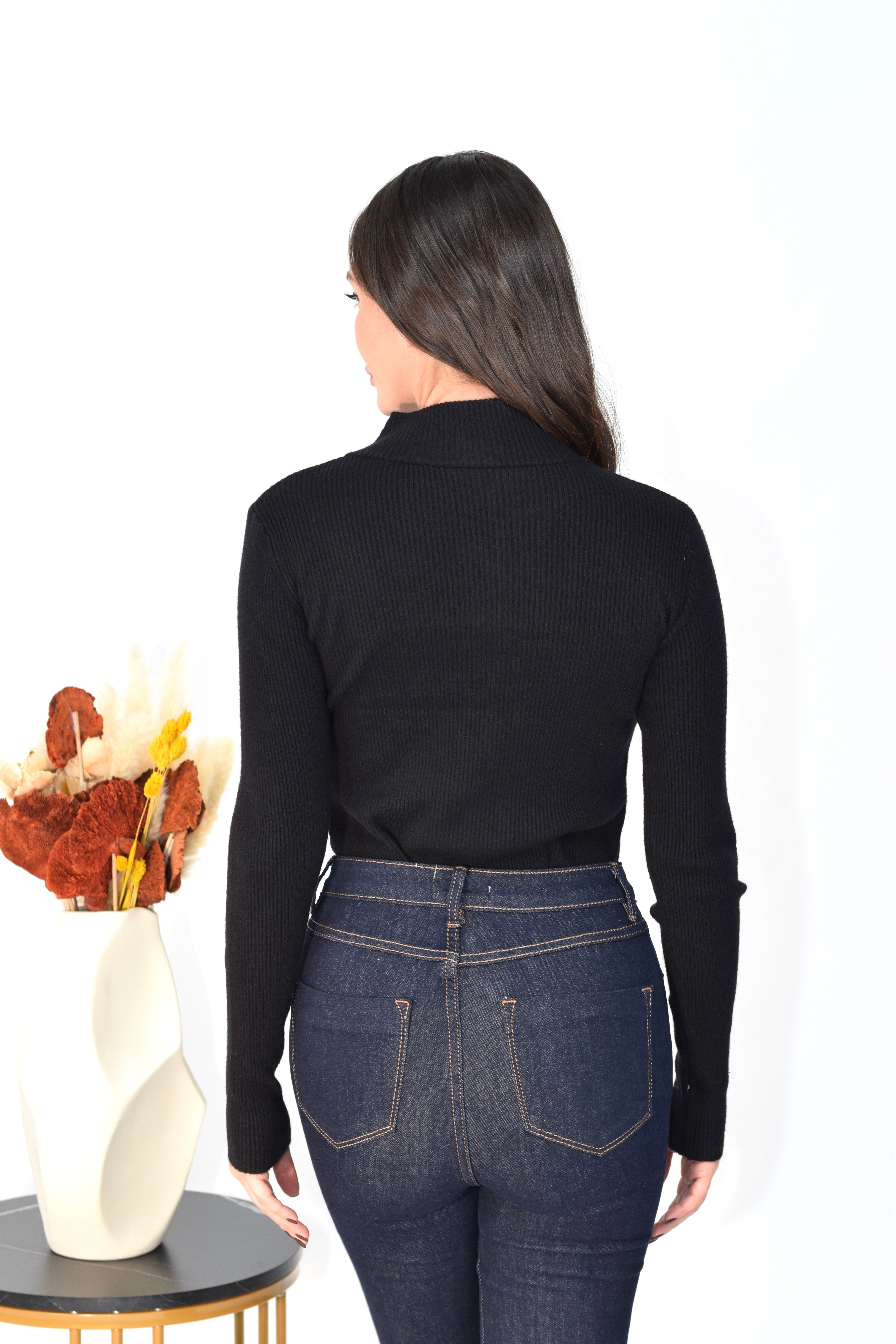 Maglia a costine elasticizzata con mezzo collo e bottoni frontali apribili, aderente e confortevole, ideale per look casual e femminili.