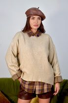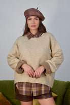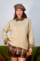 Maglione girocollo in tessuto super elasticizzato, taglia unica, con maniche leggermente a campana, dal design comodo e femminile, perfetto per look casual e versatili.