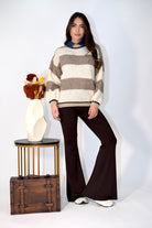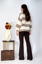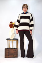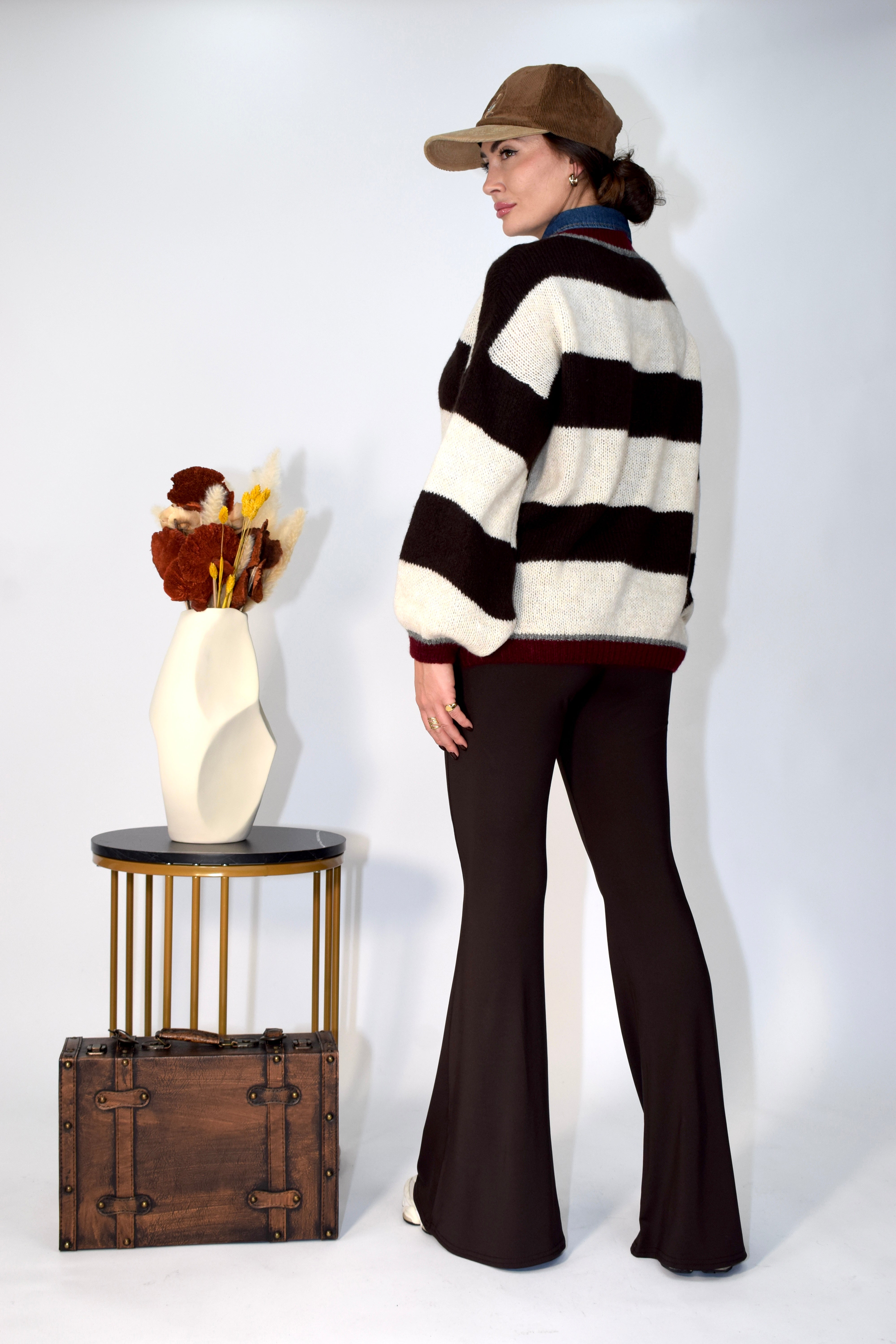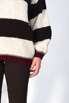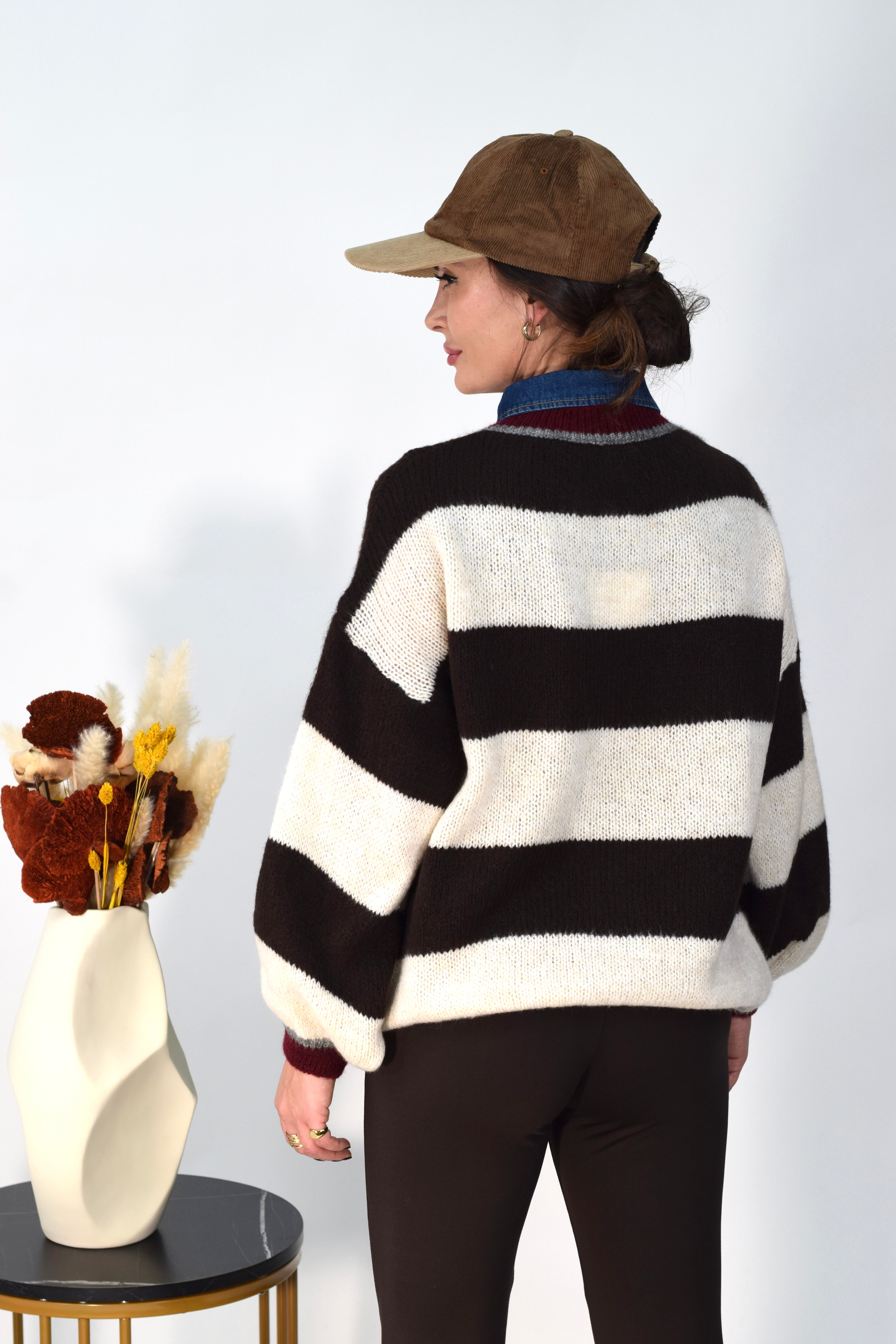 Pull girocollo elasticizzato con trama a righe e dettagli a contrasto su polsini e bordi. Morbido e confortevole, taglia unica, perfetto per un look casual ma curato.