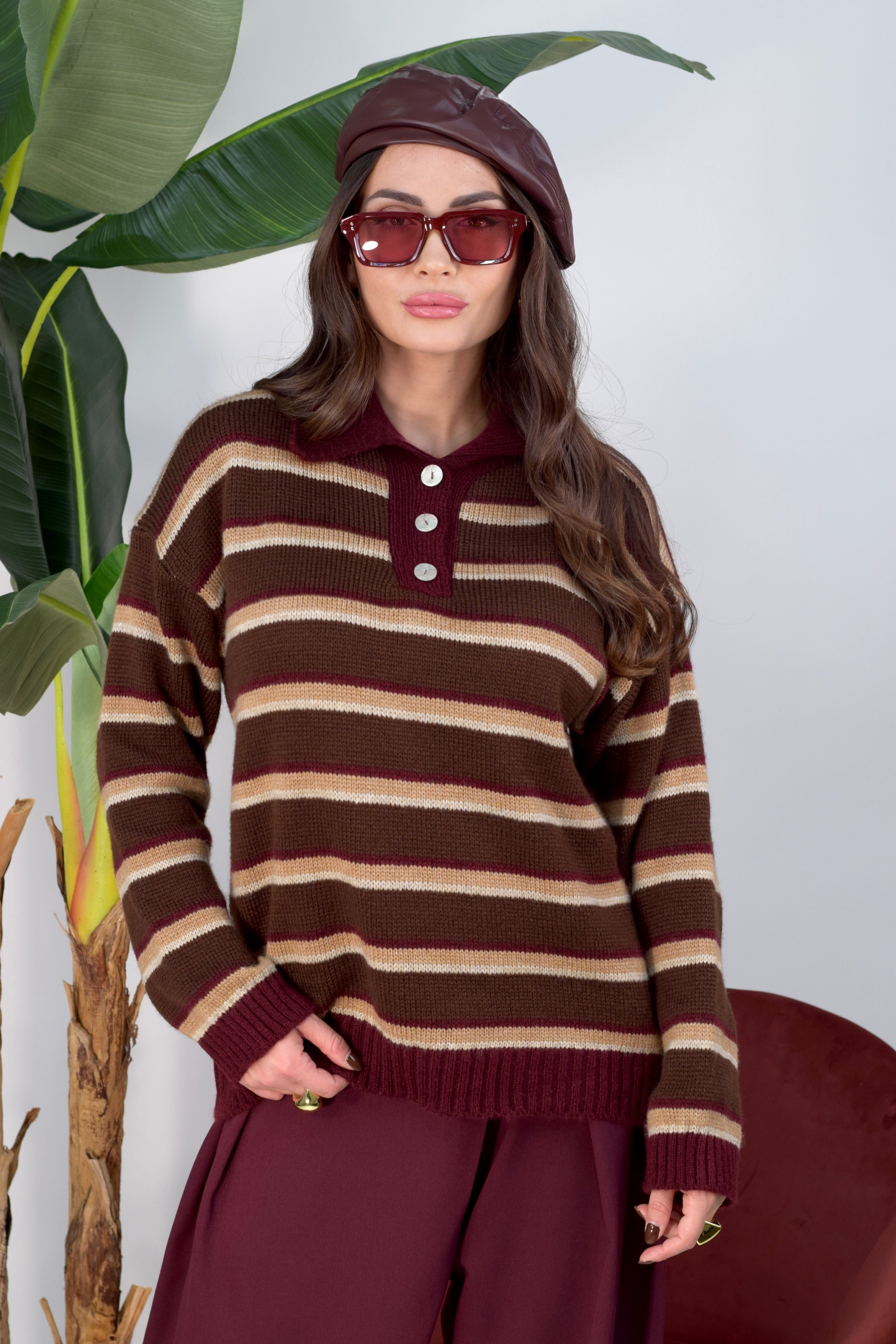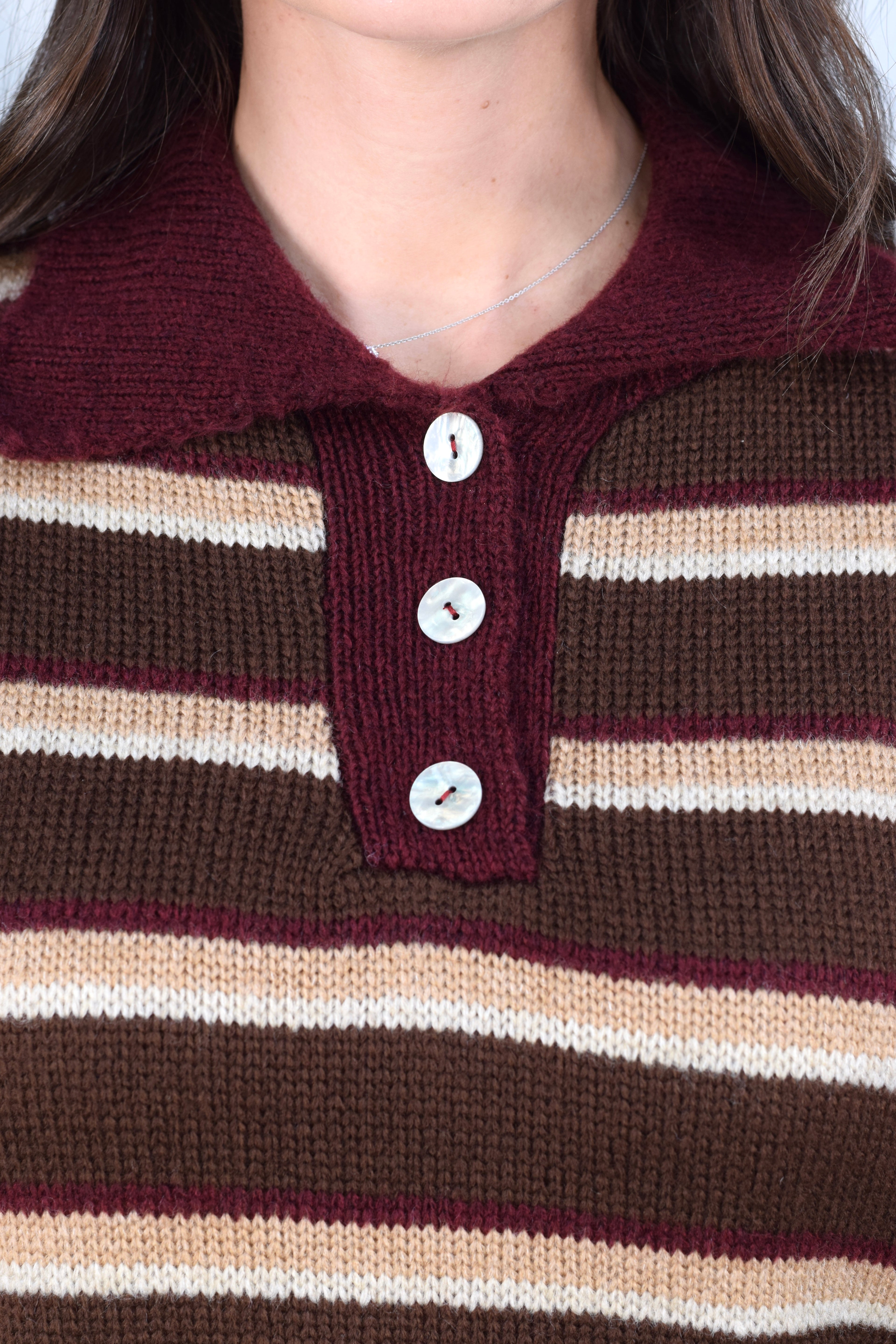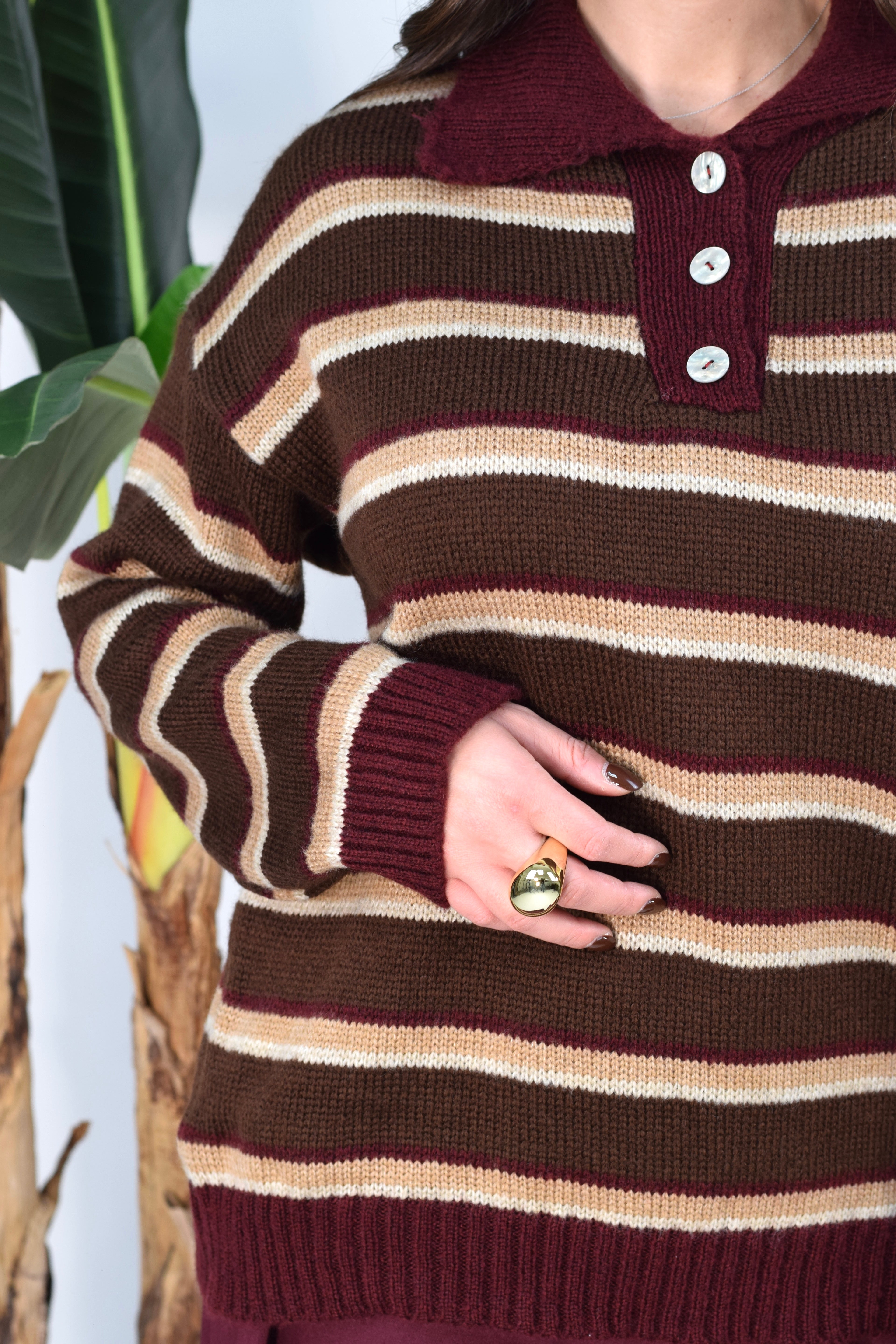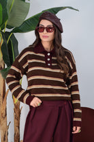 Maglioncino a righe con bottoncini frontali e colletto. Elasticizzato, morbido e confortevole, perfetto per un look casual e versatile. Taglia unica, ideale per adattarsi a diverse fisicità.