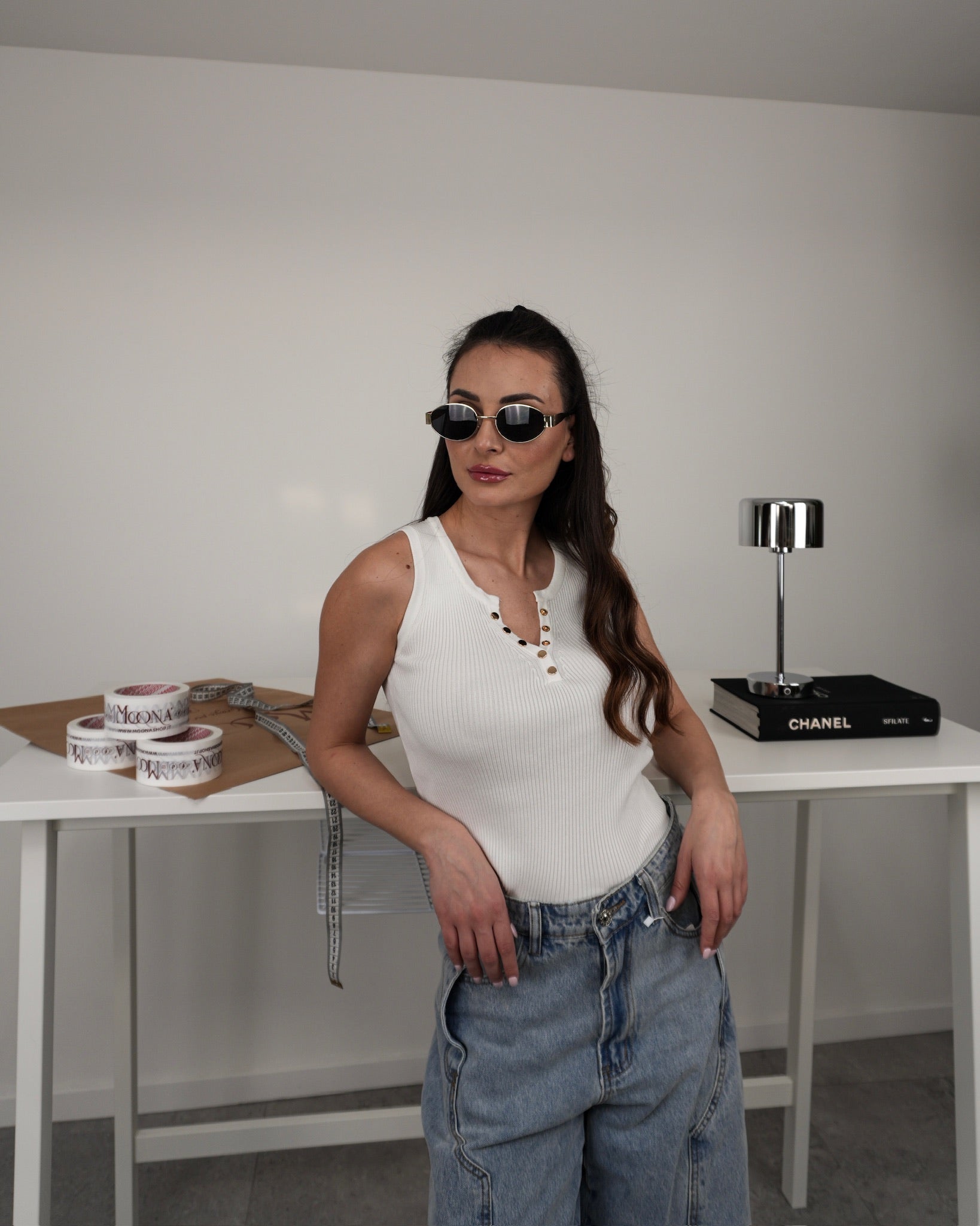 Canotta con bottoncini frontali, dal design semplice ma elegante. La taglia unica offre una vestibilità comoda e versatile, adattandosi facilmente a diverse forme. Perfetta per un look casual, da indossare da sola nelle giornate più calde o come strato sotto giacche e cardigan.