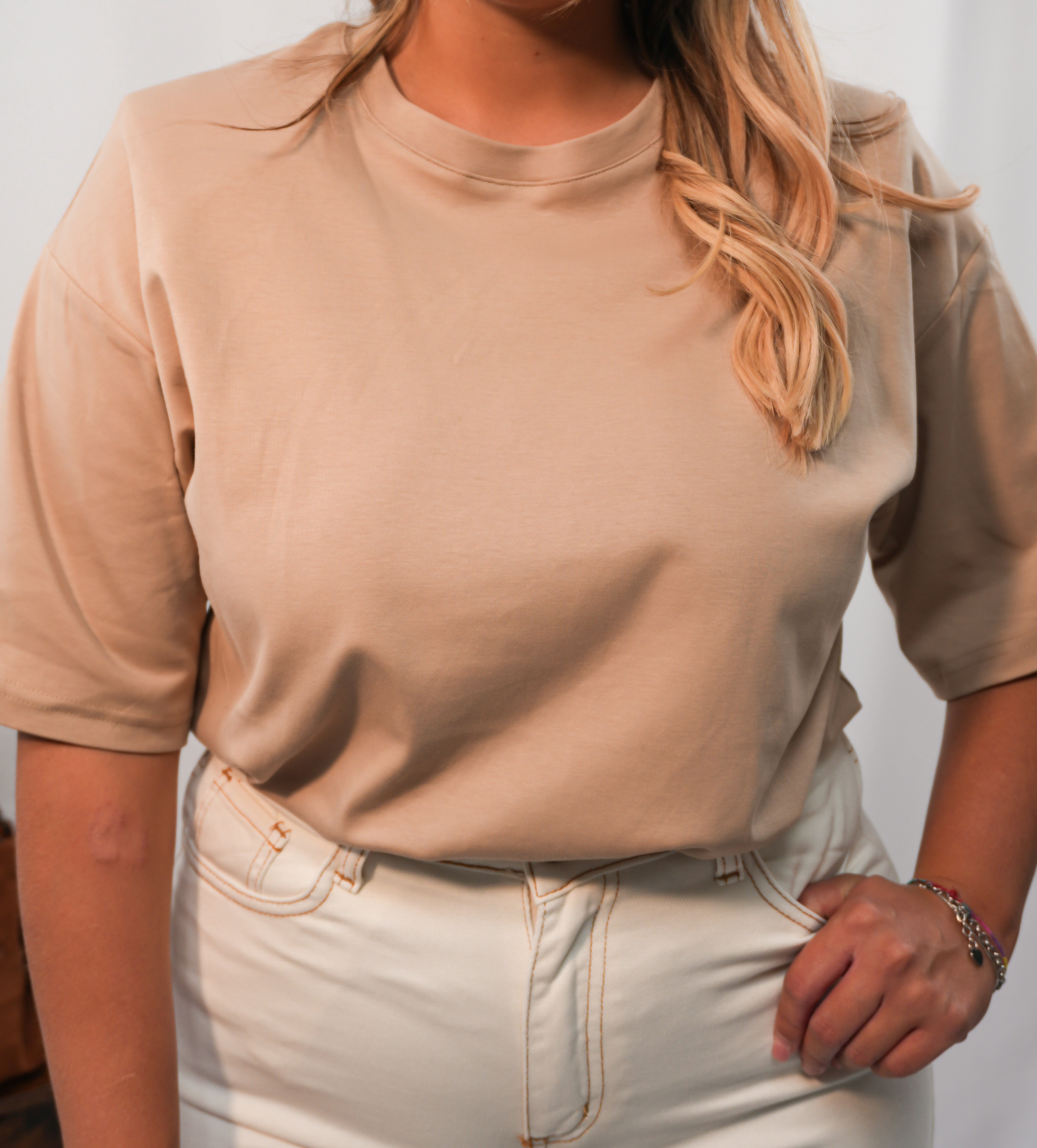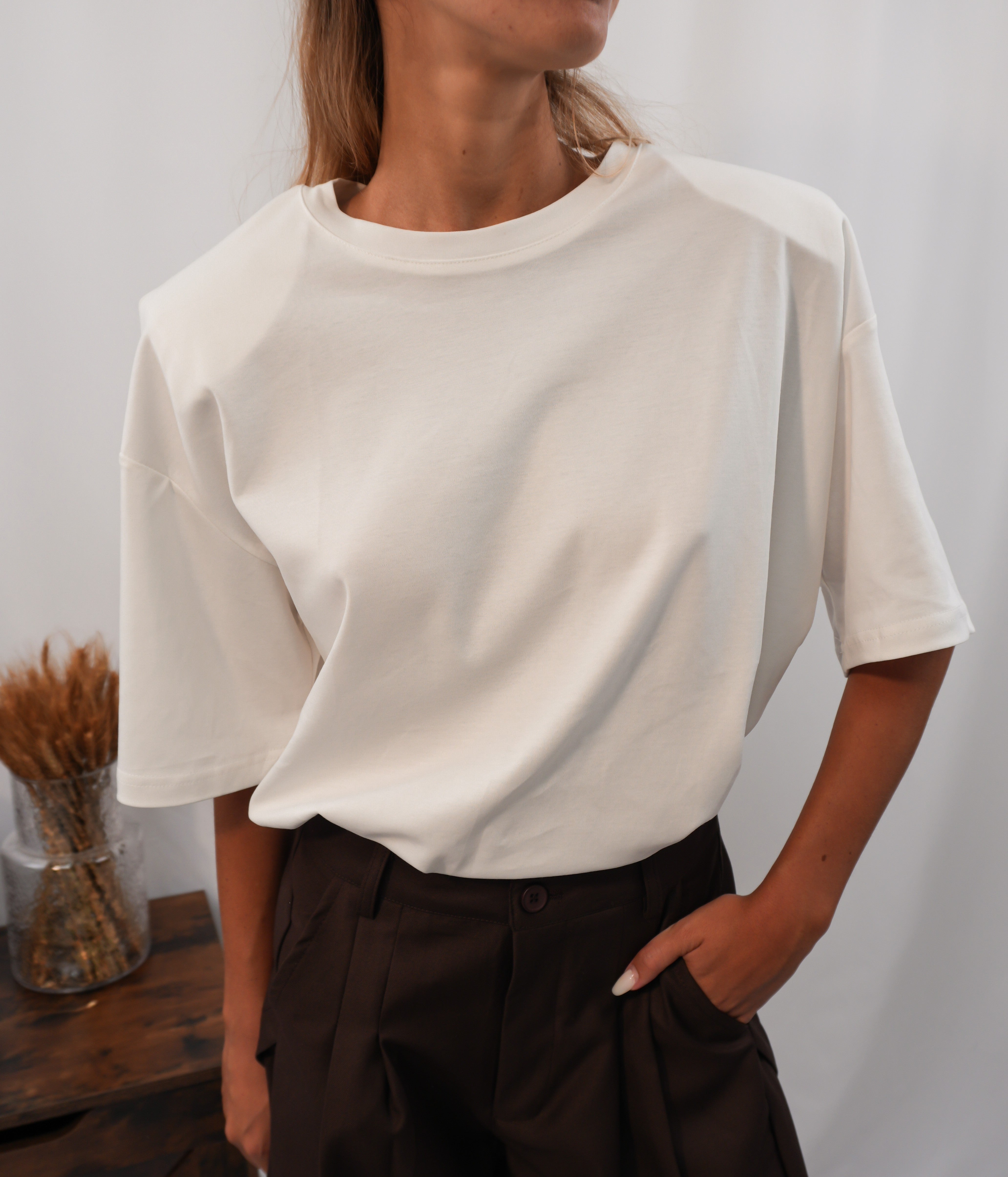 T-shirt mezza manica con spallina strutturata, dal taglio oversize ampio e comodo. Taglia unica, progettata per adattarsi a diverse fisicità garantendo comfort e stile.