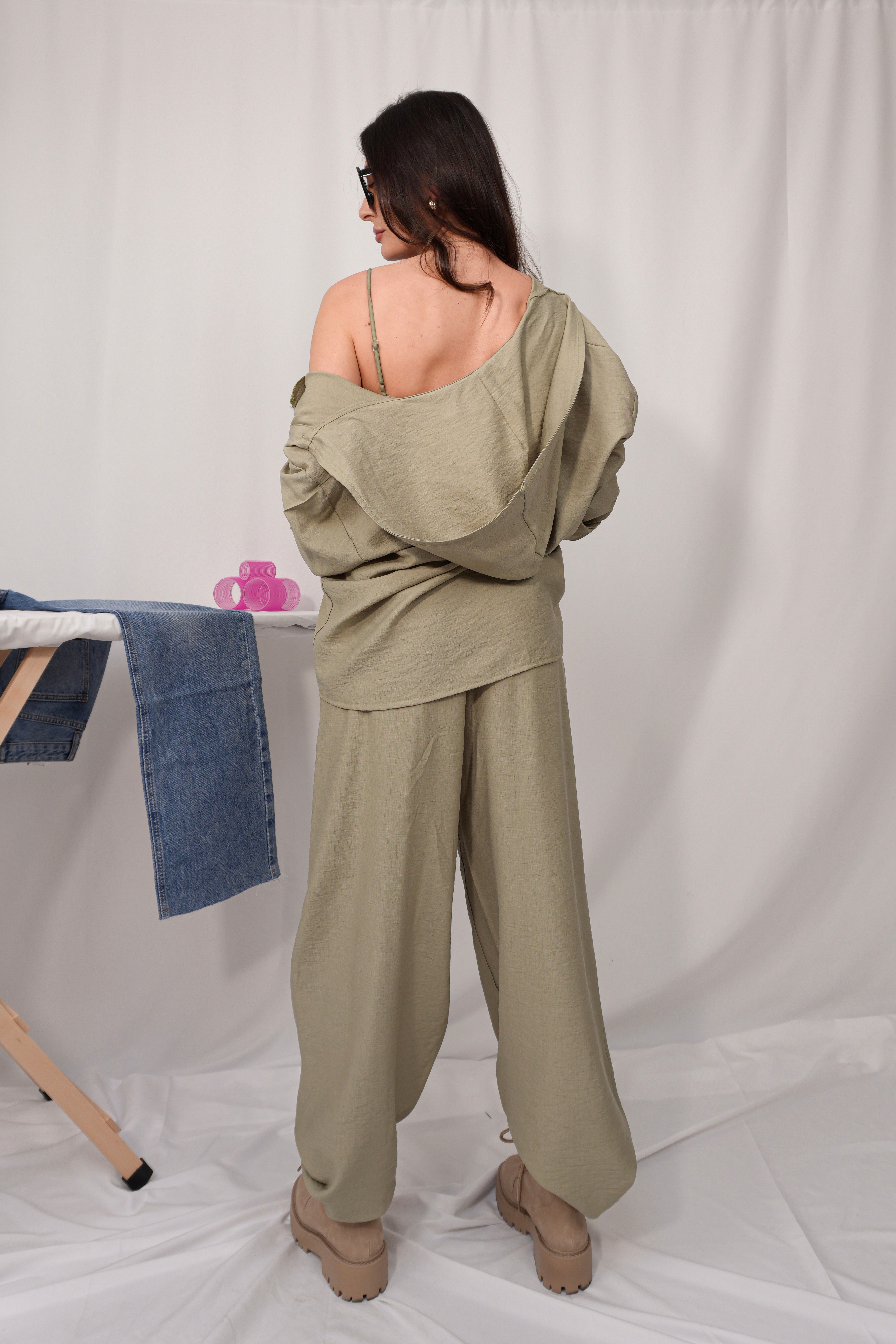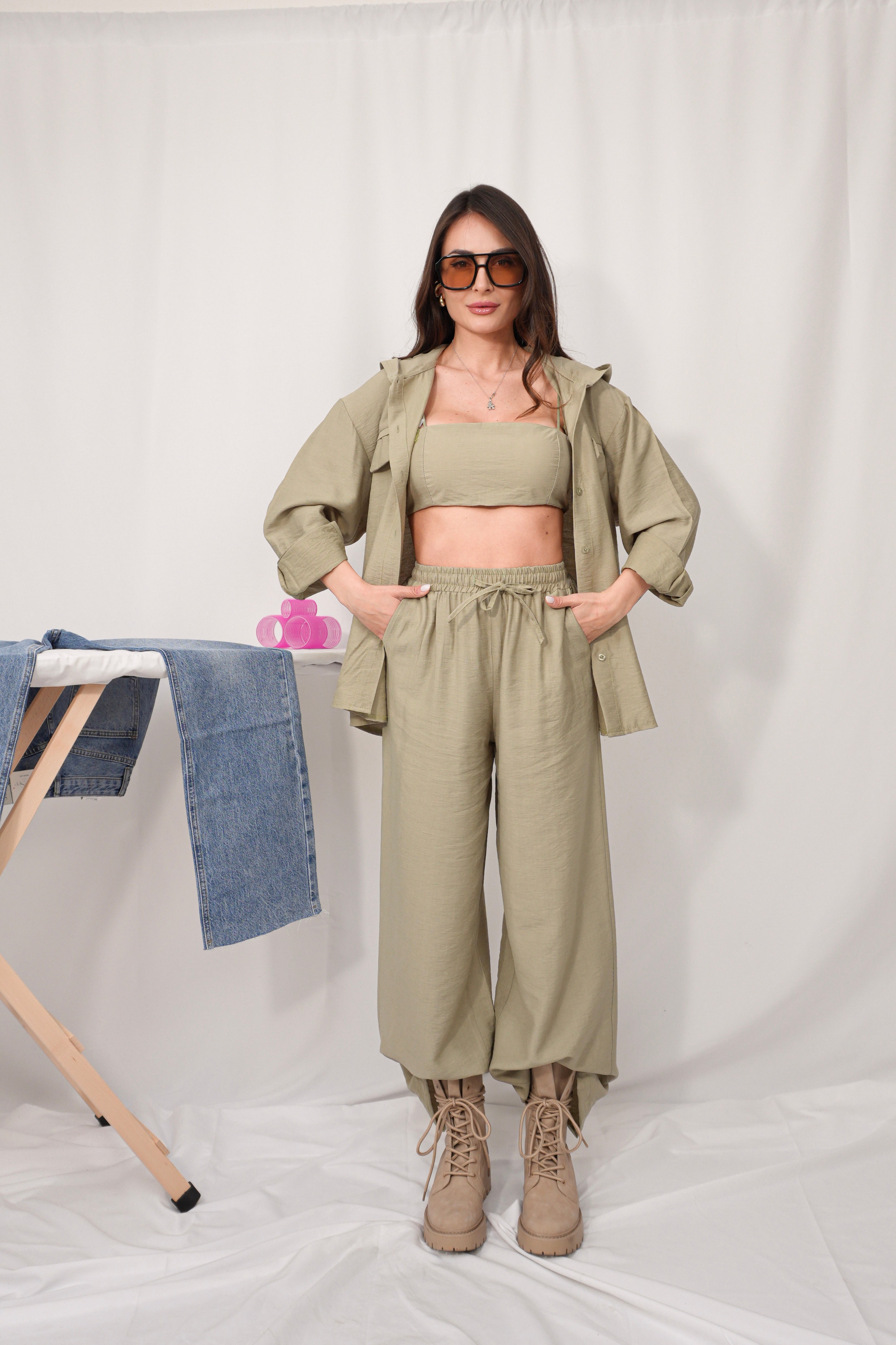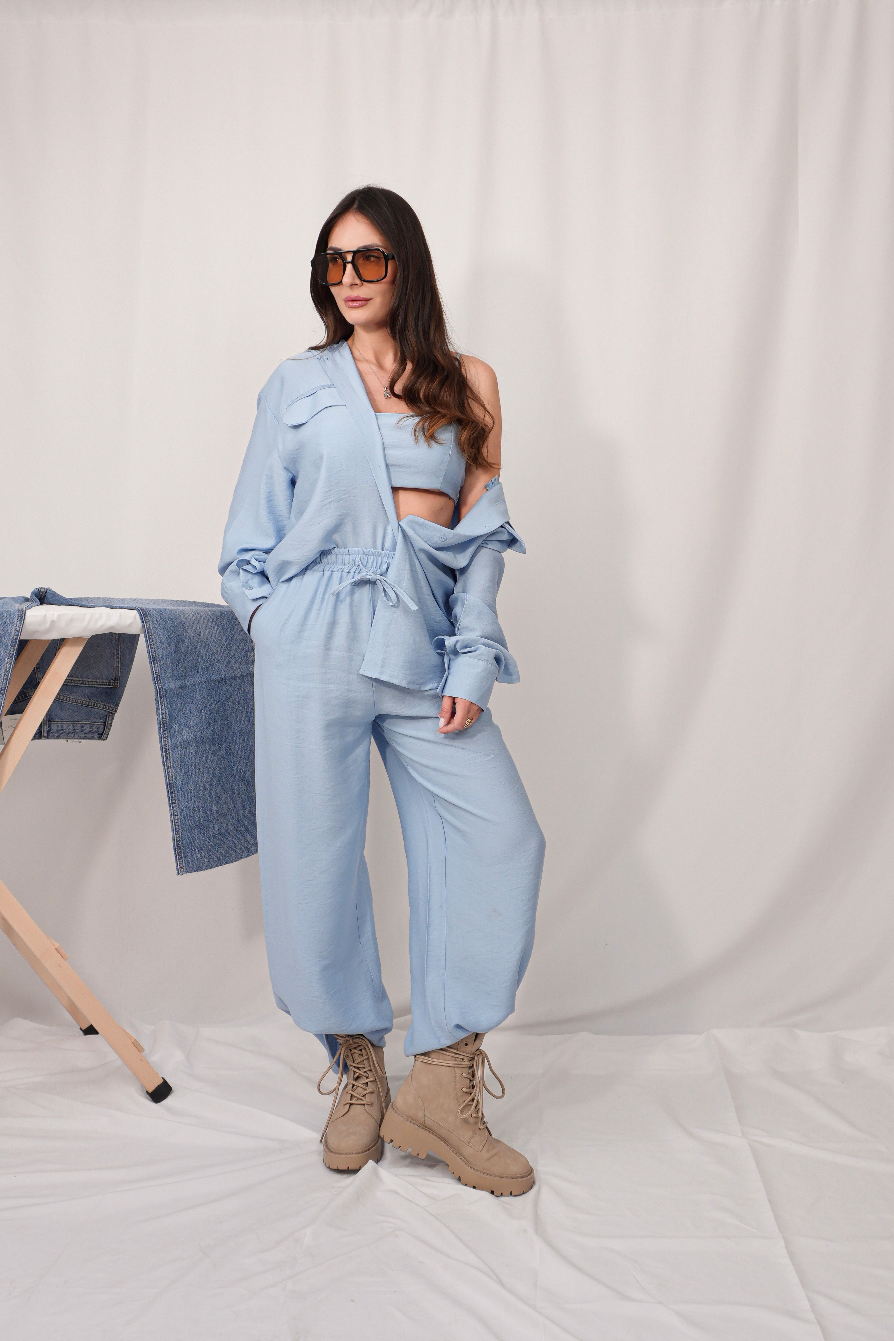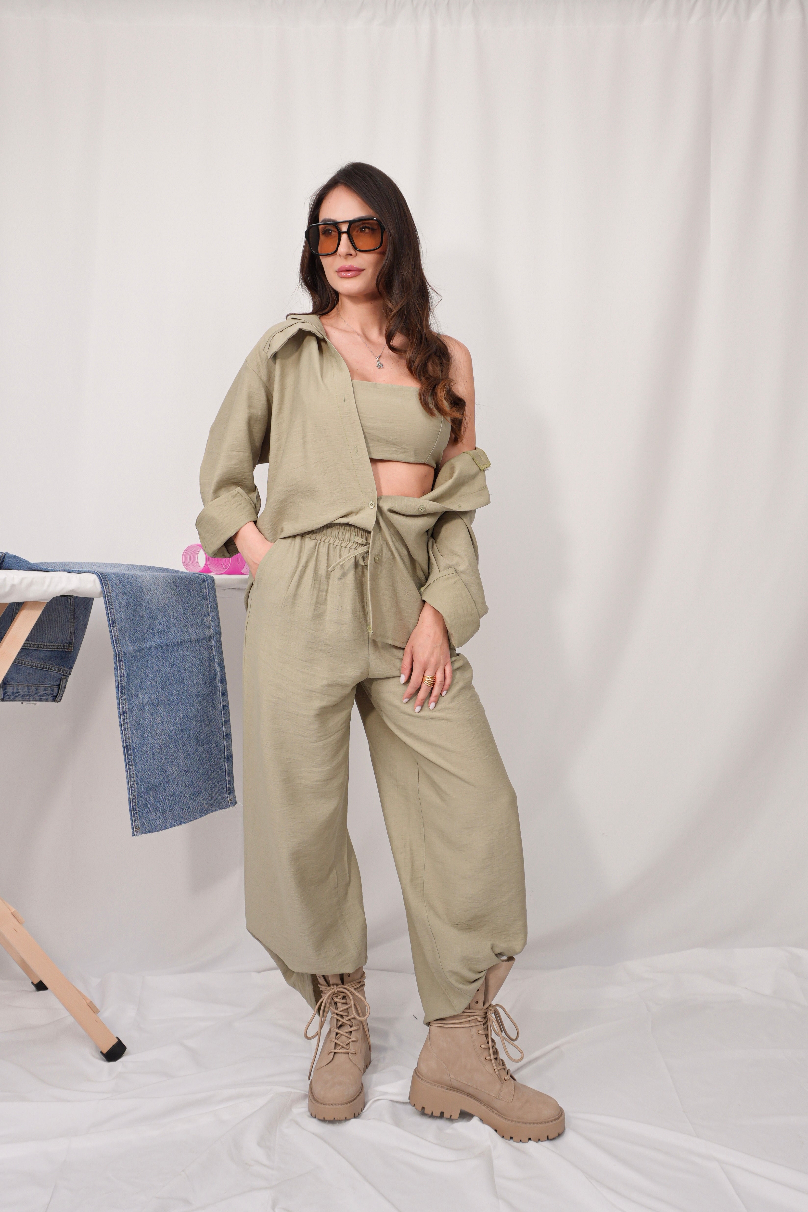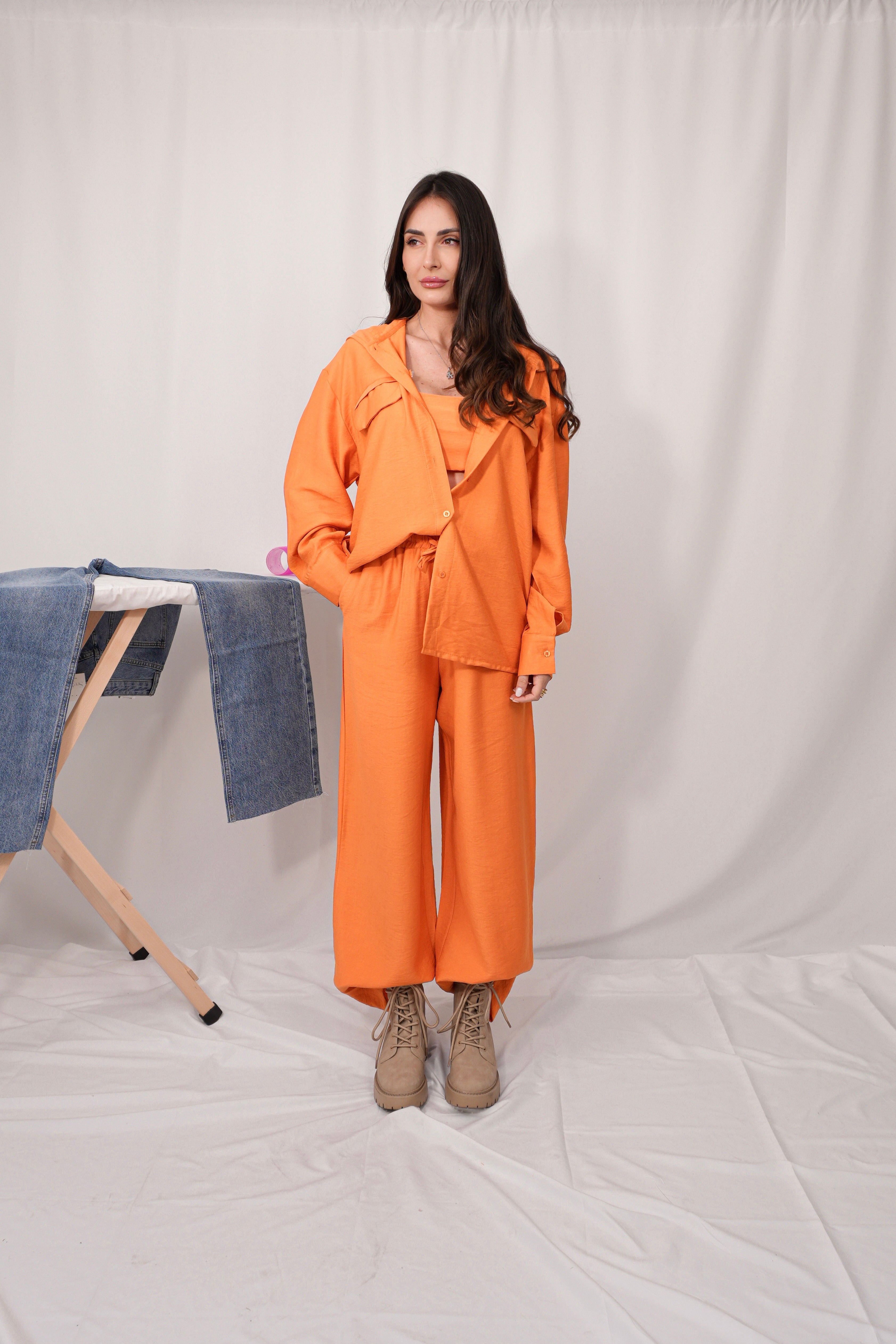 Coordinato 3 pezzi composto da camicina con bottoni frontali, top con coppe preformate e bretelline elasticizzate, e pantalaccio ampio con coulisse in vita regolabile per una vestibilità comoda e ampia, in taglia unica.
