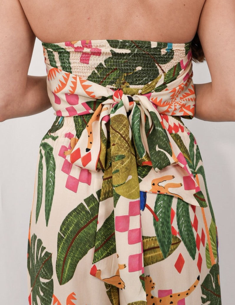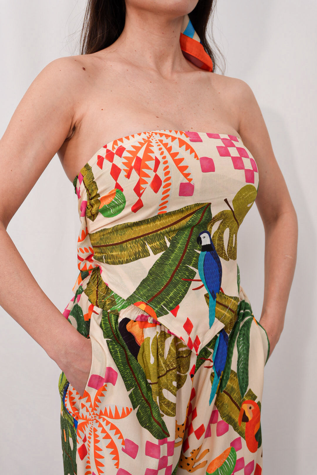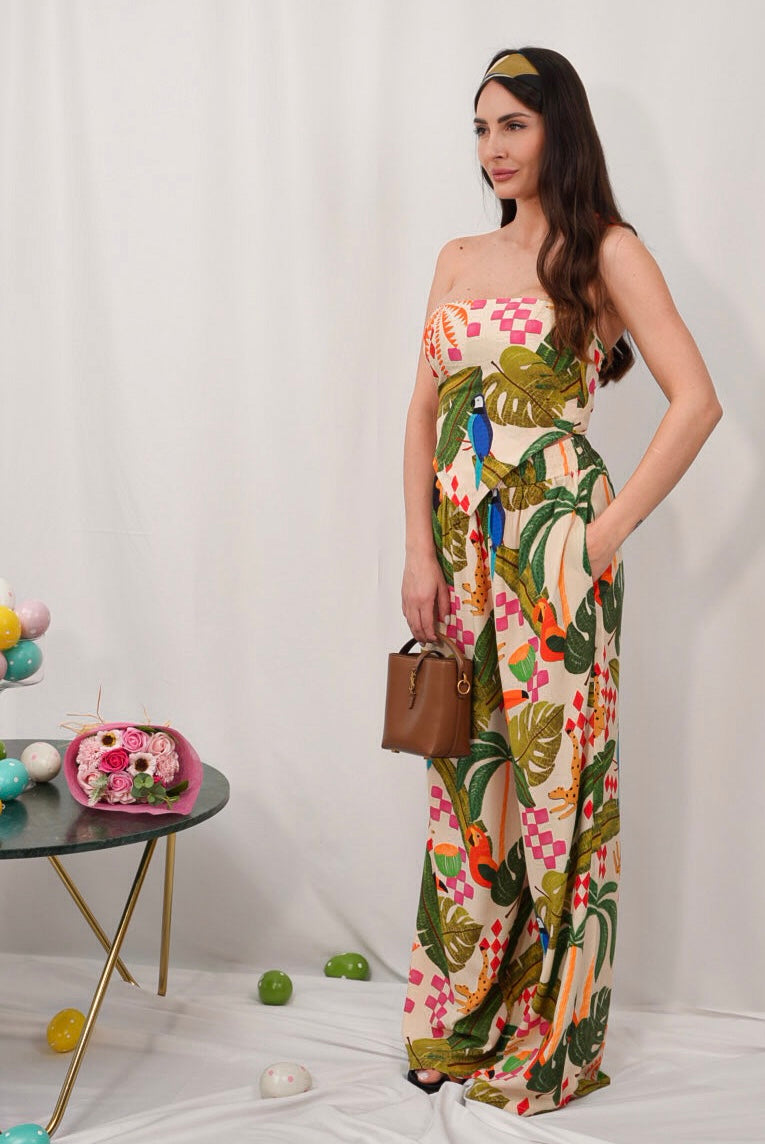 Set con motivi tropicali composto da top asimmetrico con fiocco regolabile sul retro, abbinato a pantalone ampio con elastico in vita, garantendo un'ampia vestibilità. Ideale per look da aperitivo in riva al mare o da spiaggia.