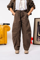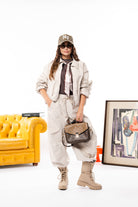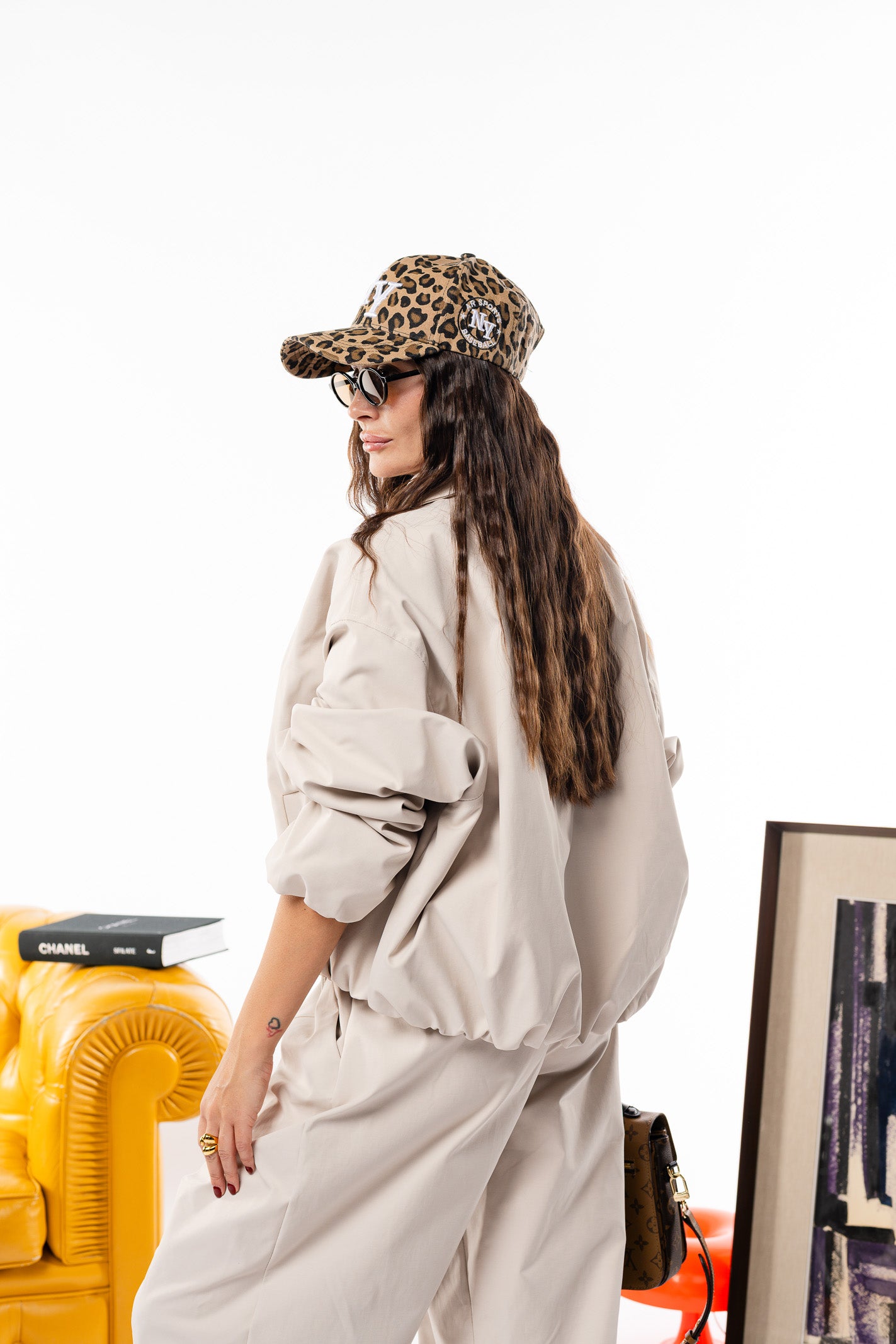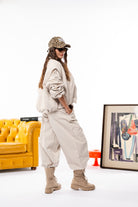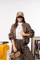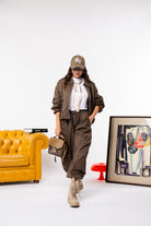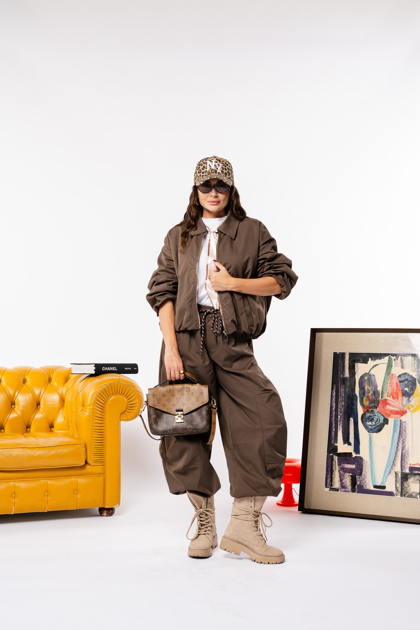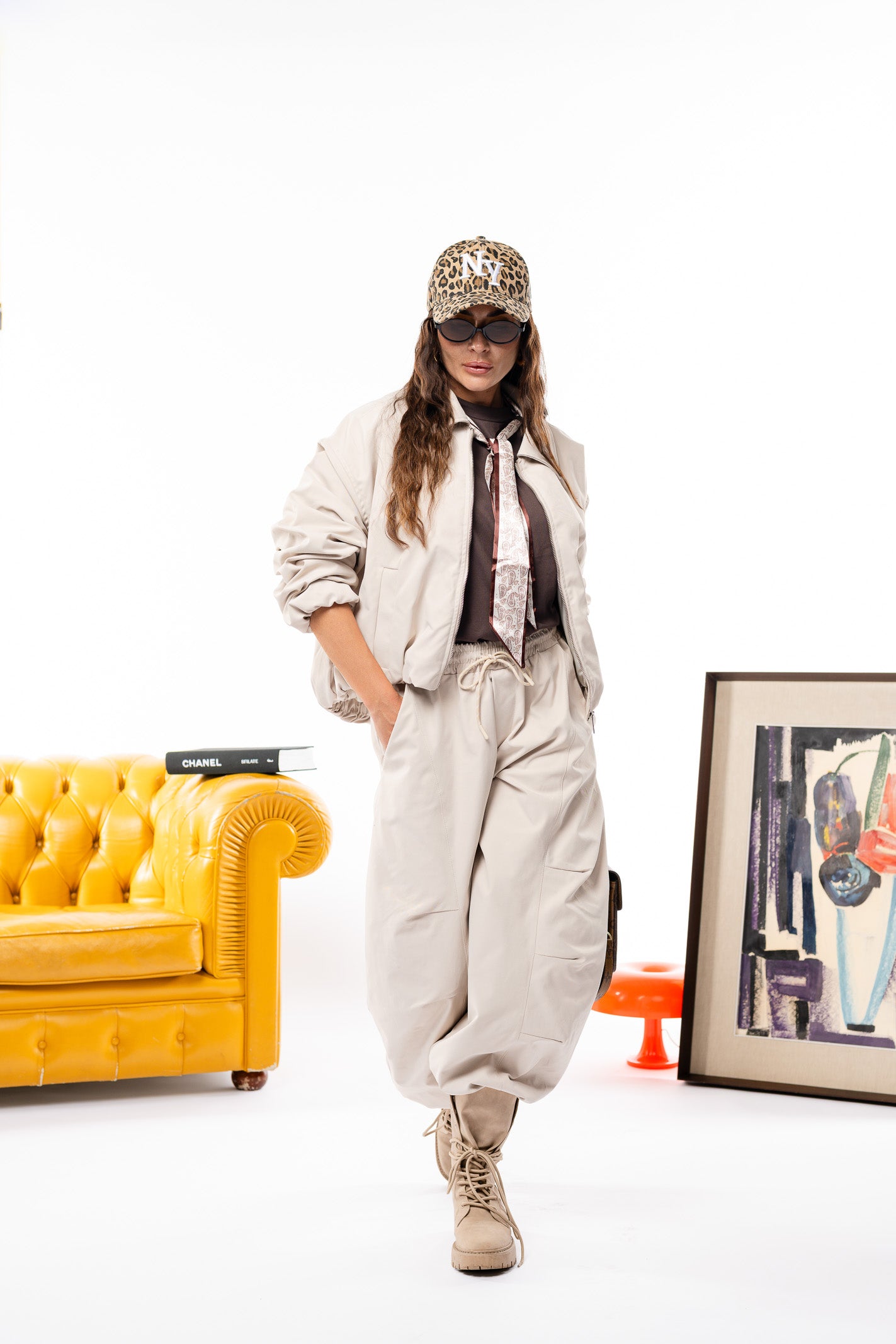 Coordinato due pezzi composto da bomber con colletto e zip frontale, abbinato a pantalone cargo con coulisse in vita regolabile. Taglia unica, comodo e versatile per un look casual e moderno.
