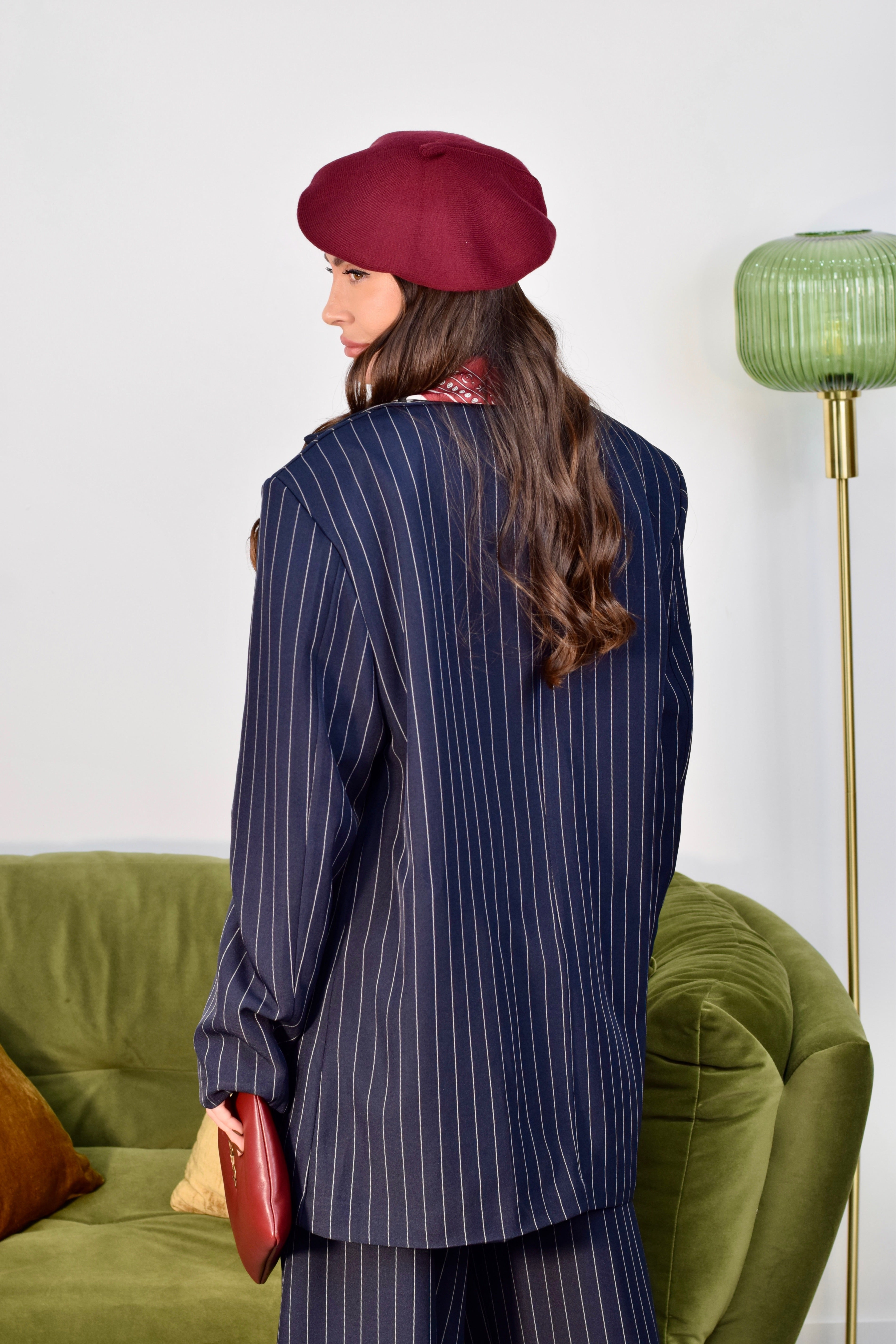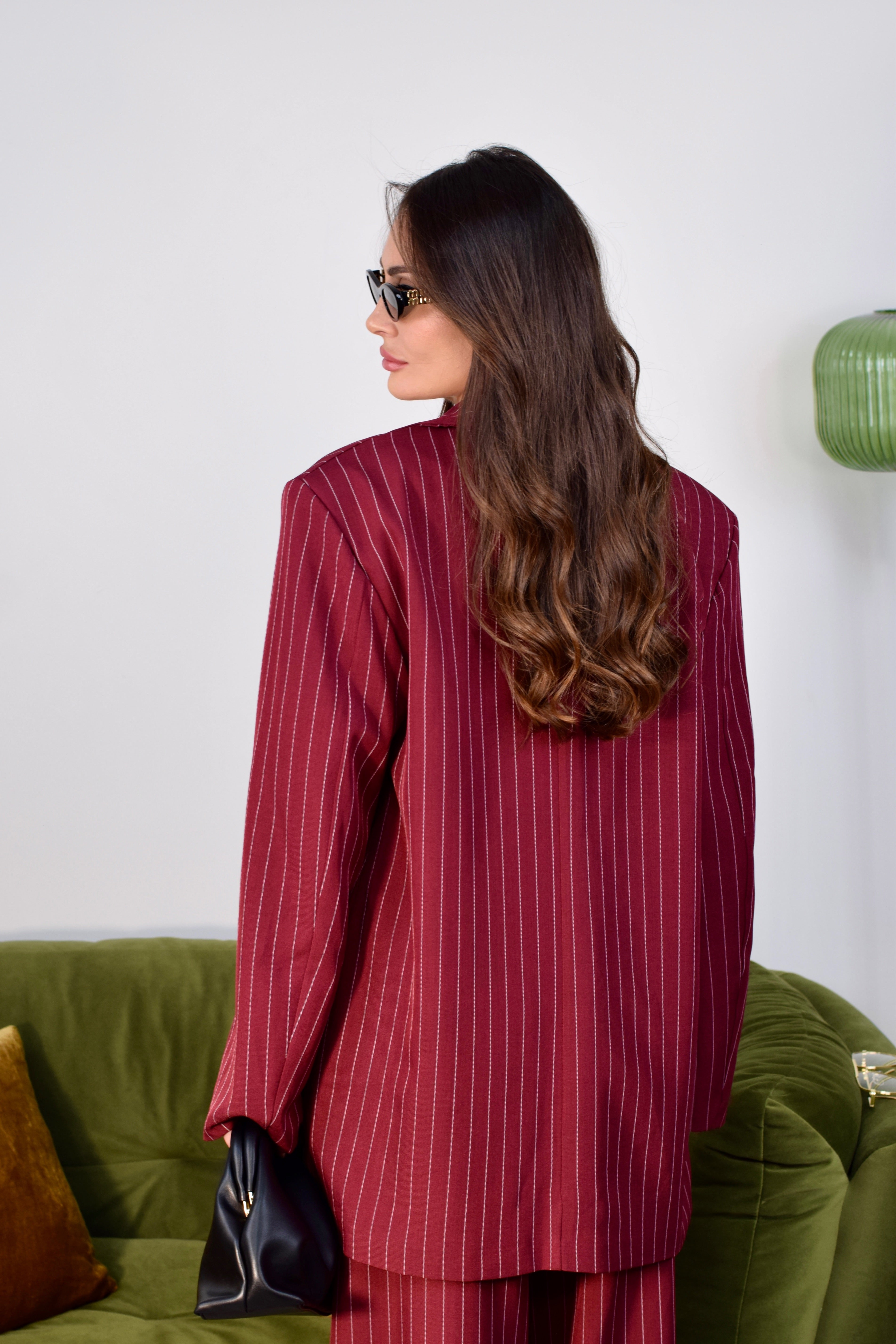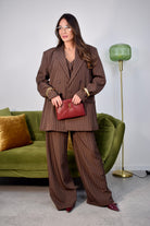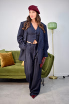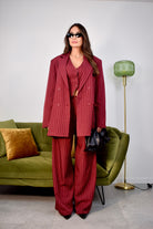 Tailleur tre pezzi taglia unica composto da gilet giromanica con tre bottoncini frontali, giacca oversize con spalline imbottite e pantalone ampio a palazzo con elastico sul retro. Realizzato in tessuto gessato, un completo dallo stile elegante e contemporaneo, ideale per creare look raffinati e versatili.