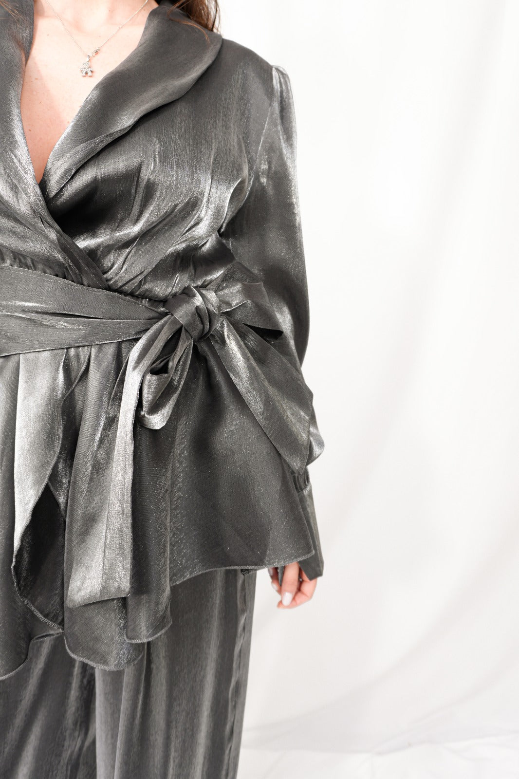 Tailleur due pezzi in tessuto laminato, composto da blusa con scollo a V incrociato frontalmente e fiocco removibile e regolabile in vita, abbinato a pantalone a palazzo con elastico sul retro, in taglia unica.